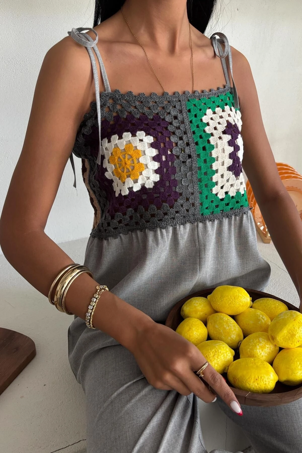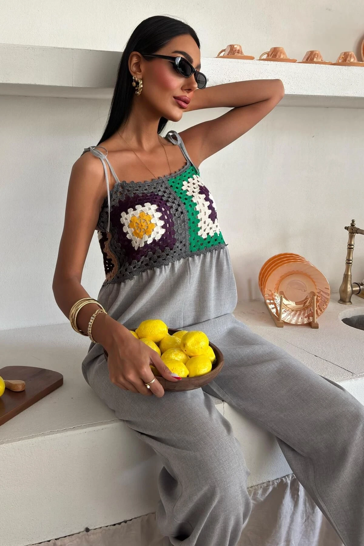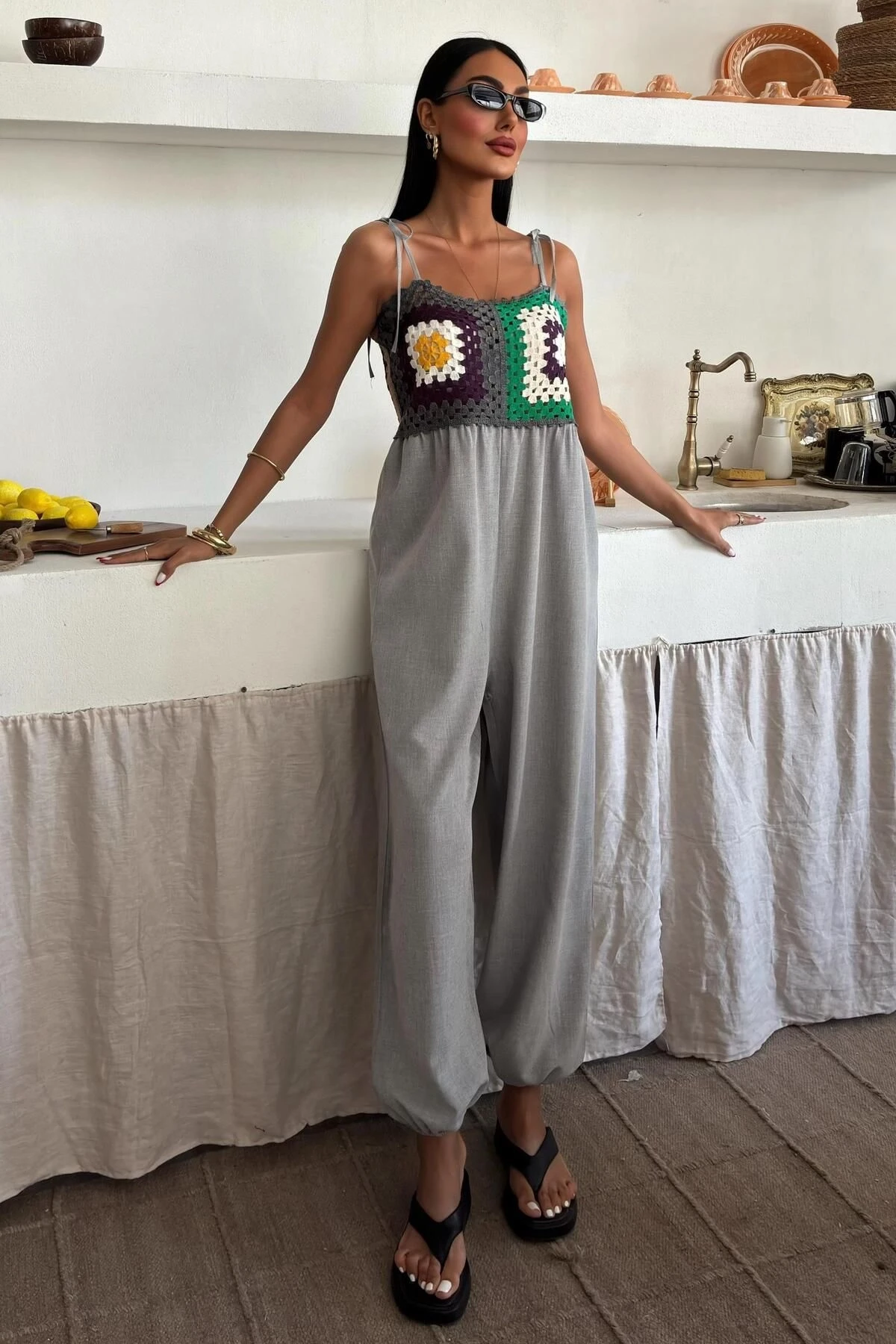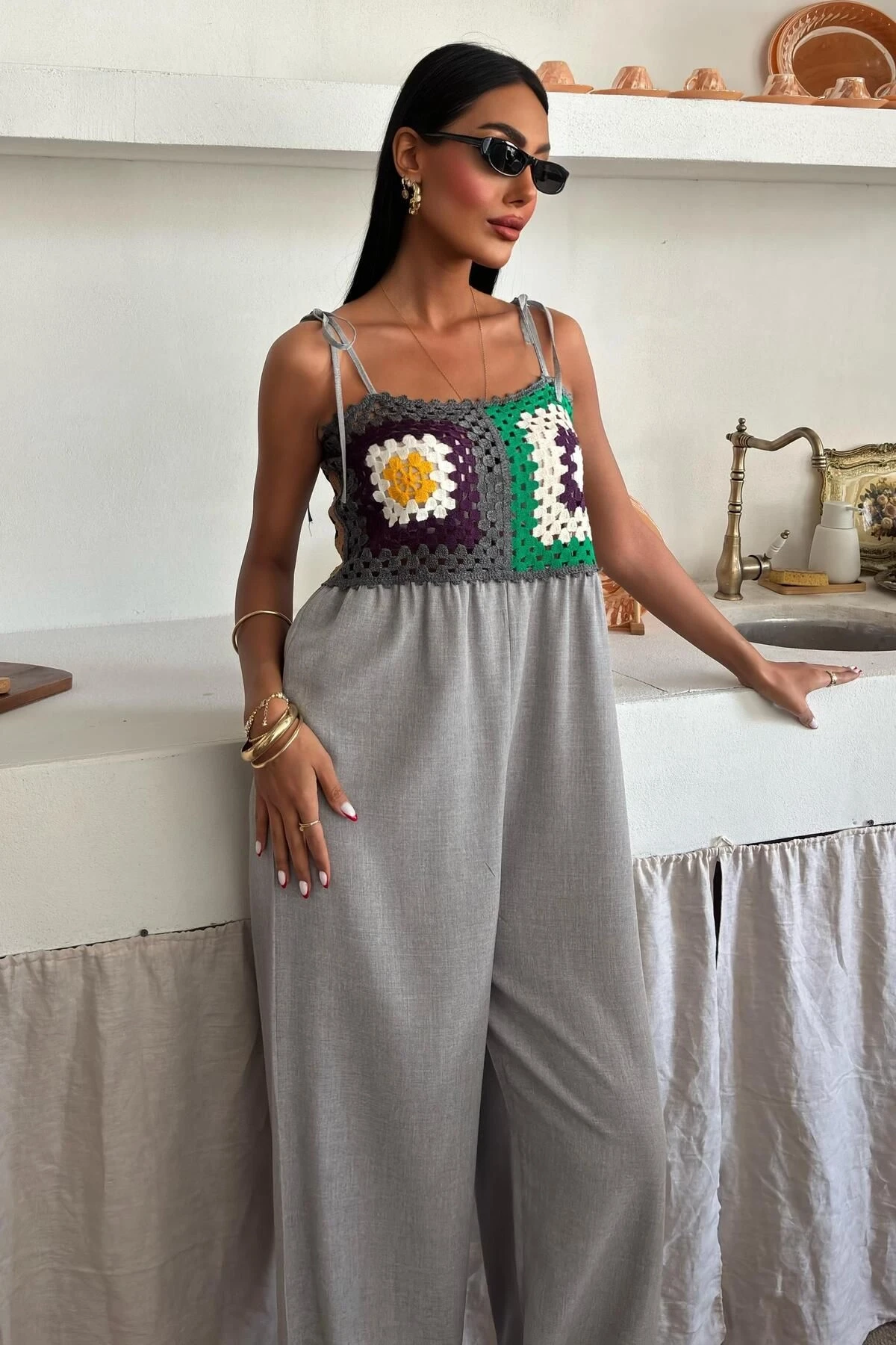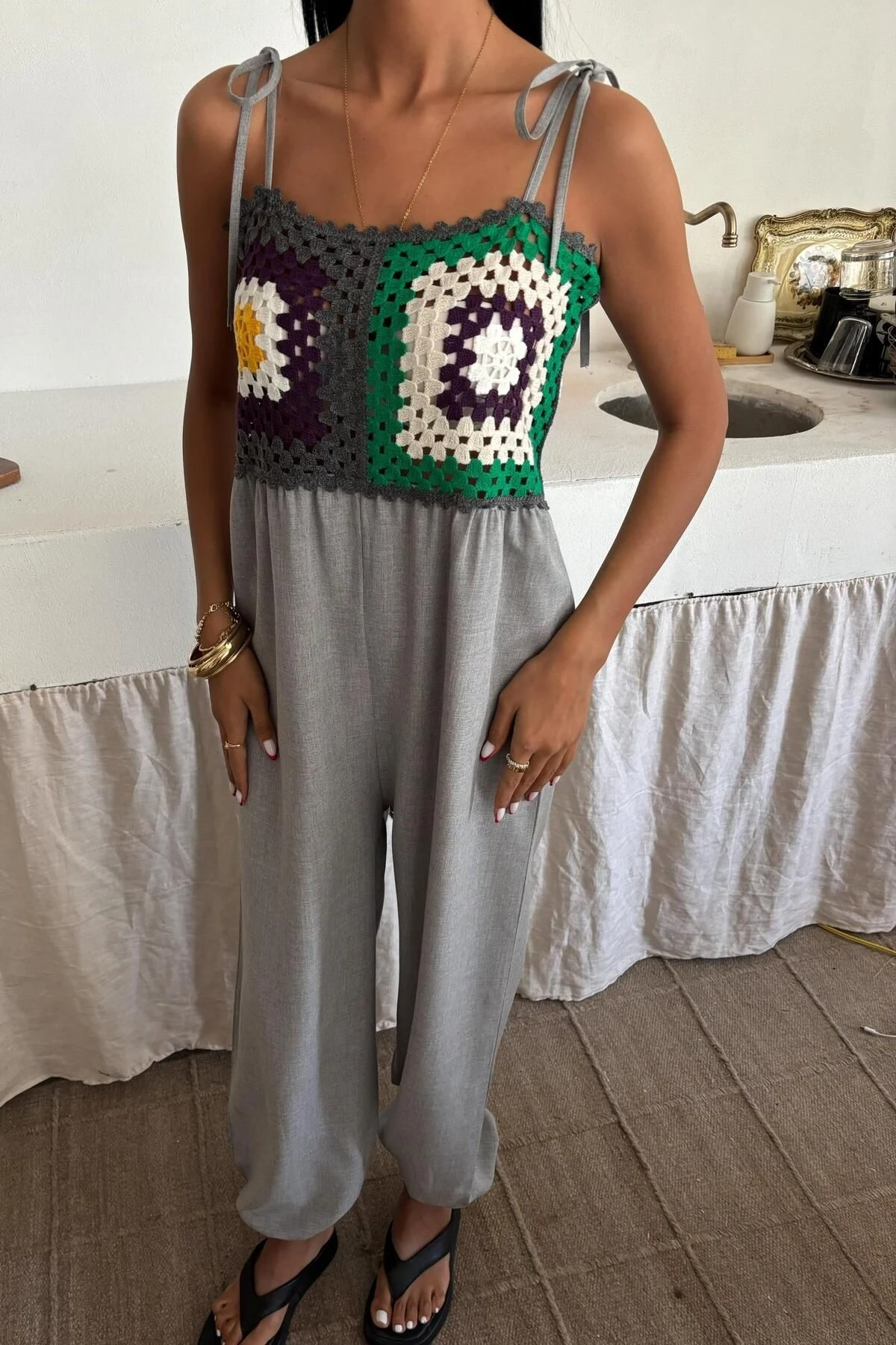 Kadın Gri Desenli Dokuma Askılı Kolsuz Tulum
