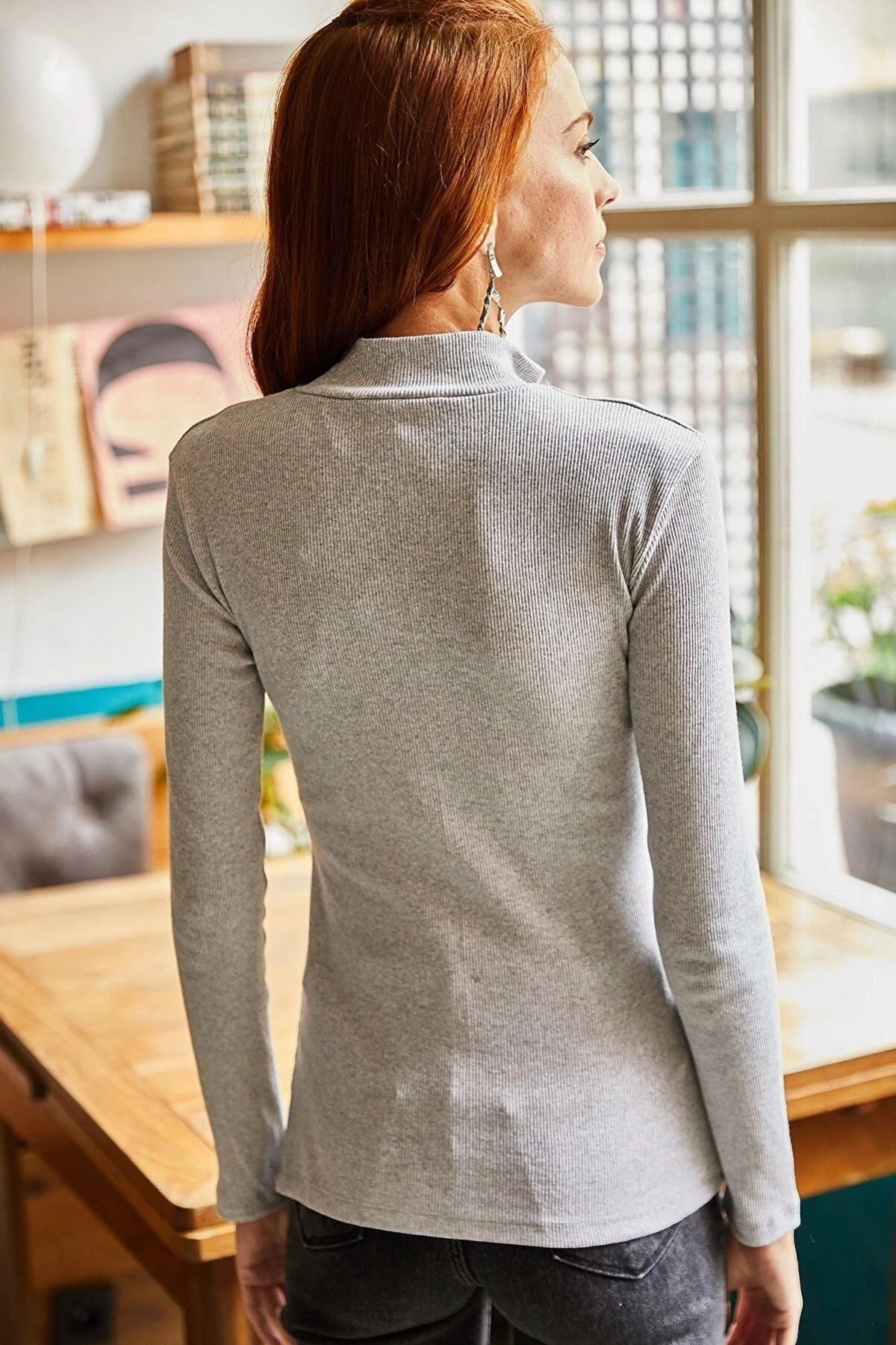 Bu şık ve rahat bluz, gardırobunuza ferahlık katacak.; Gri renkteki tasarımı, modern bir görünüm sunarken, fermuar detayı ile tarzınıza hareket katıyor.; Dik yaka, zarif bir duruş sergilerken, uzun kollar sıcaklık ve konfor sağlar.; Bu bluz, %80 pamuk ve %20 elastan içeriğiyle mükemmel bir konfor sunar.; Pamuk, nefes alabilen ve cildinize nazikçe dokunan bir kumaştır, böylece gün boyu rahat hissedebilirsiniz.; Elastan ise esneklik sağlar, hareket özgürlüğünüzü kısıtlamadan bluzun üzerinize mükemmel şekilde oturmasını sağlar.; Regular kesimi ve standart boyuyla her bedene uyum sağlar.; Bu bluz, herhangi bir mevsimde ve herhangi bir stil ile mükemmel bir uyum sağlayacak şekilde tasarlanmıştır.; Şıklığı ve basitliği bir araya getiren bu bluz, her gün giyebileceğiniz bir temel parçadır.; Bu ürün, kaliteli kumaşı, şık renk seçeneği ve dikkat çeken fermuar detayıyla öne çıkar.; Şıklık ve konforu bir araya getiren bu bluzu gardırobunuzun vazgeçilmezi haline getirin.; Herhangi bir kombinasyonda harika görünecek ve sizi her zaman şık hissettirecektir.