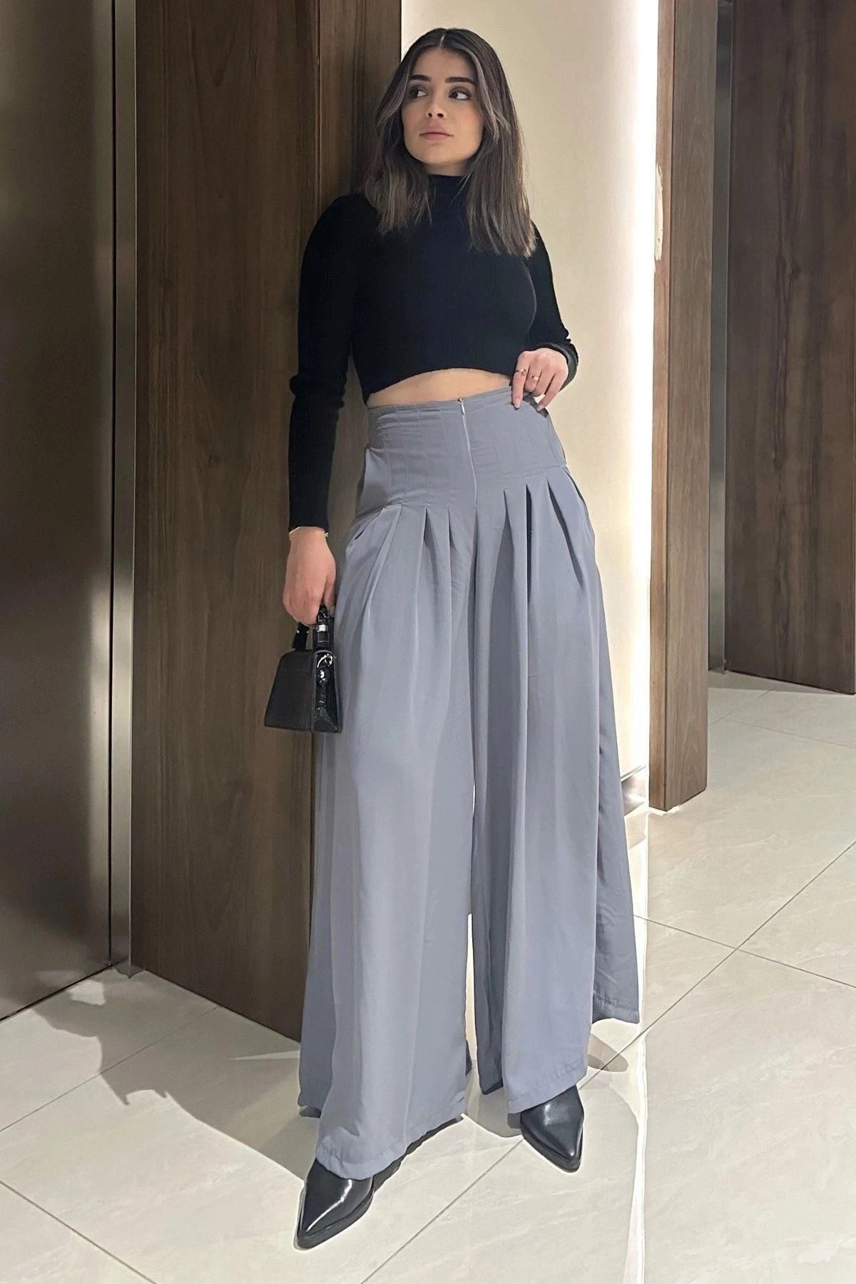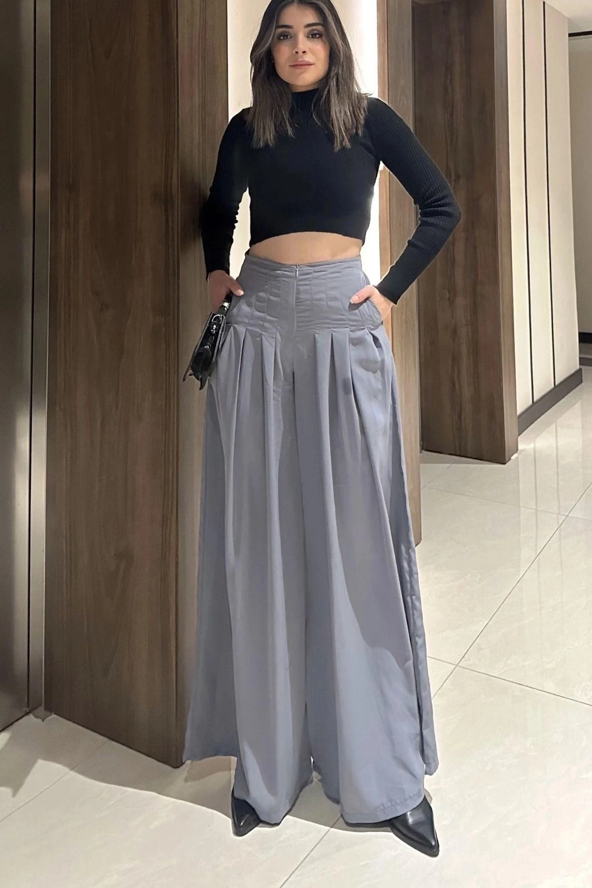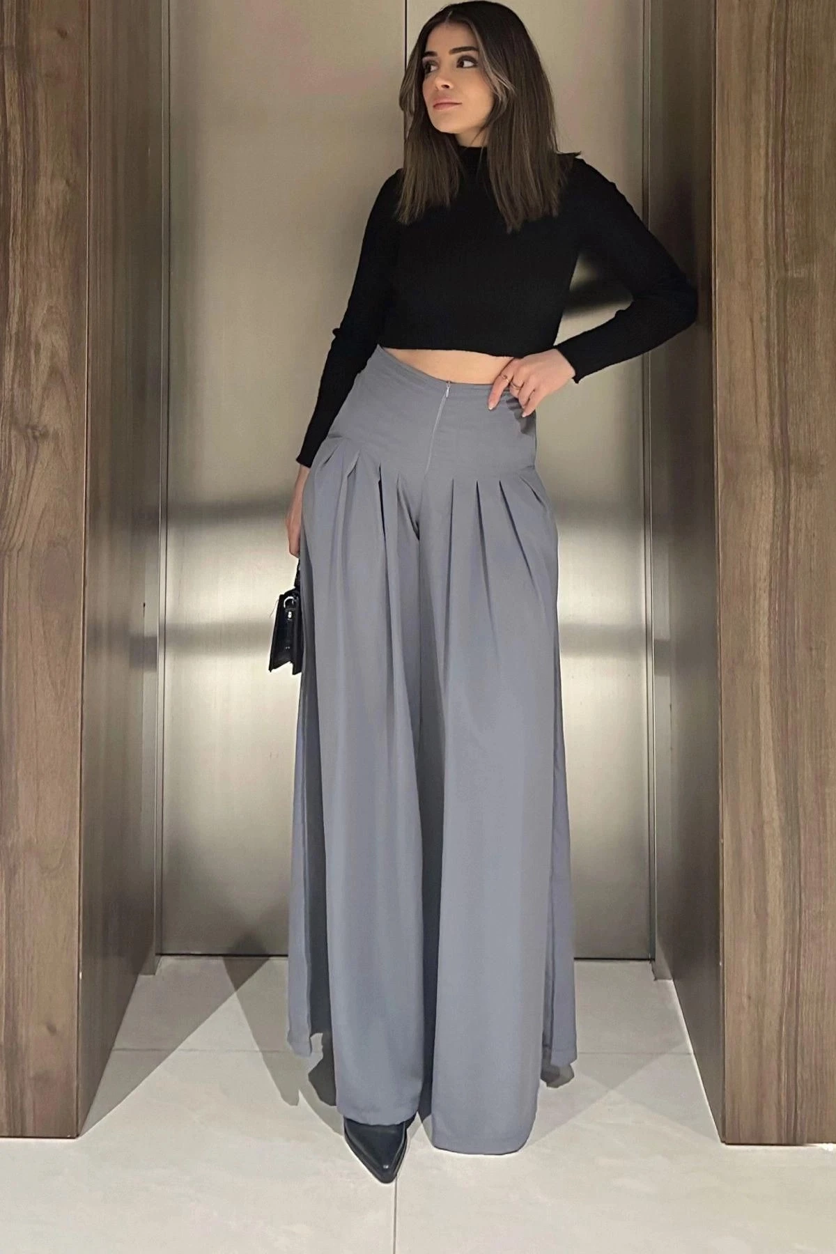 Kadın Gri Fermuar Kapamalı, Cepli, Pileli Bol Paça Etek Pantolon