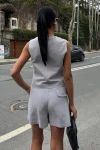 Kadın Gri Flamlı Keten Yelek Şort İkili Takım