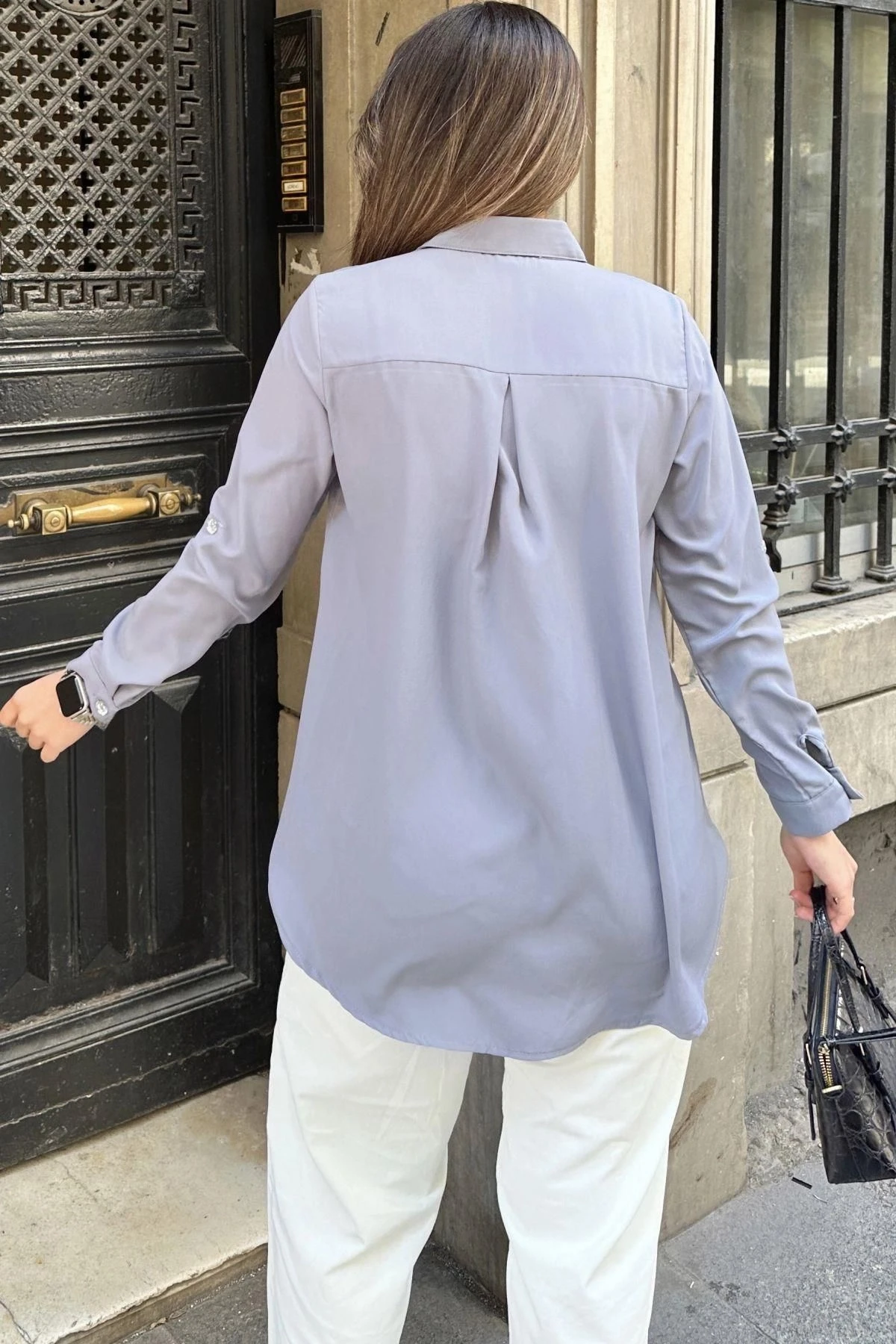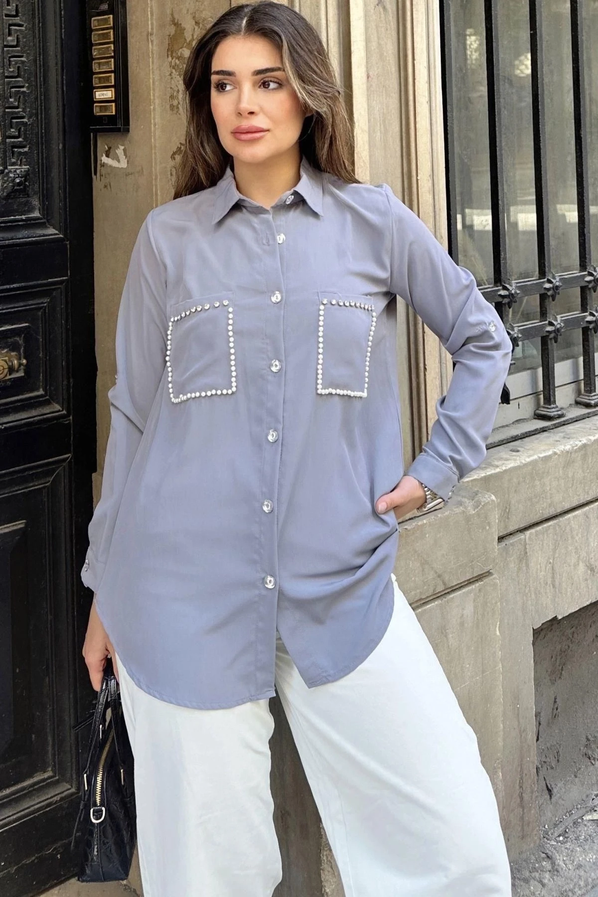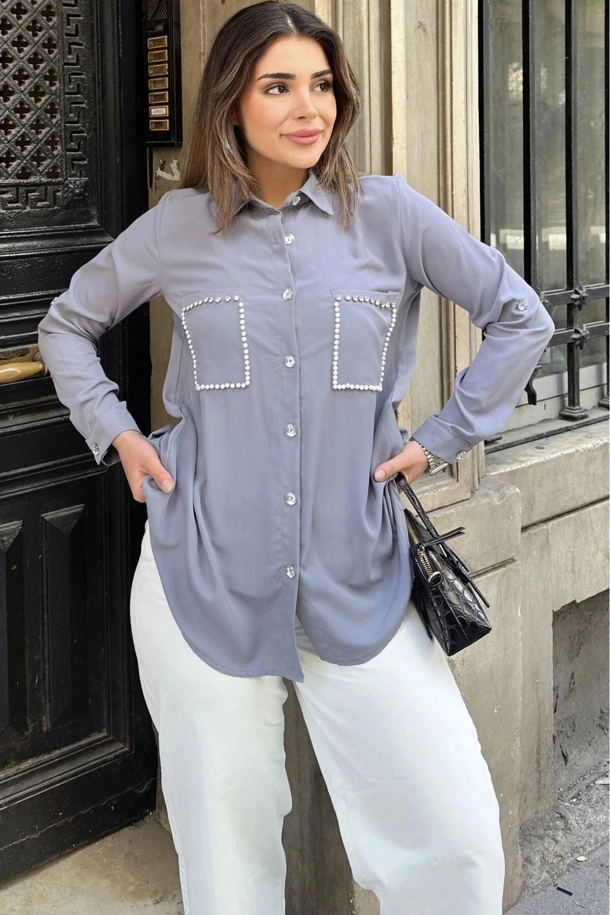 Kadın Gri İnci Süslemeli, Çift Cep Detaylı, Arkası Pliseli, Terletmez, Kupra Kumaş, Salaş Gömlek