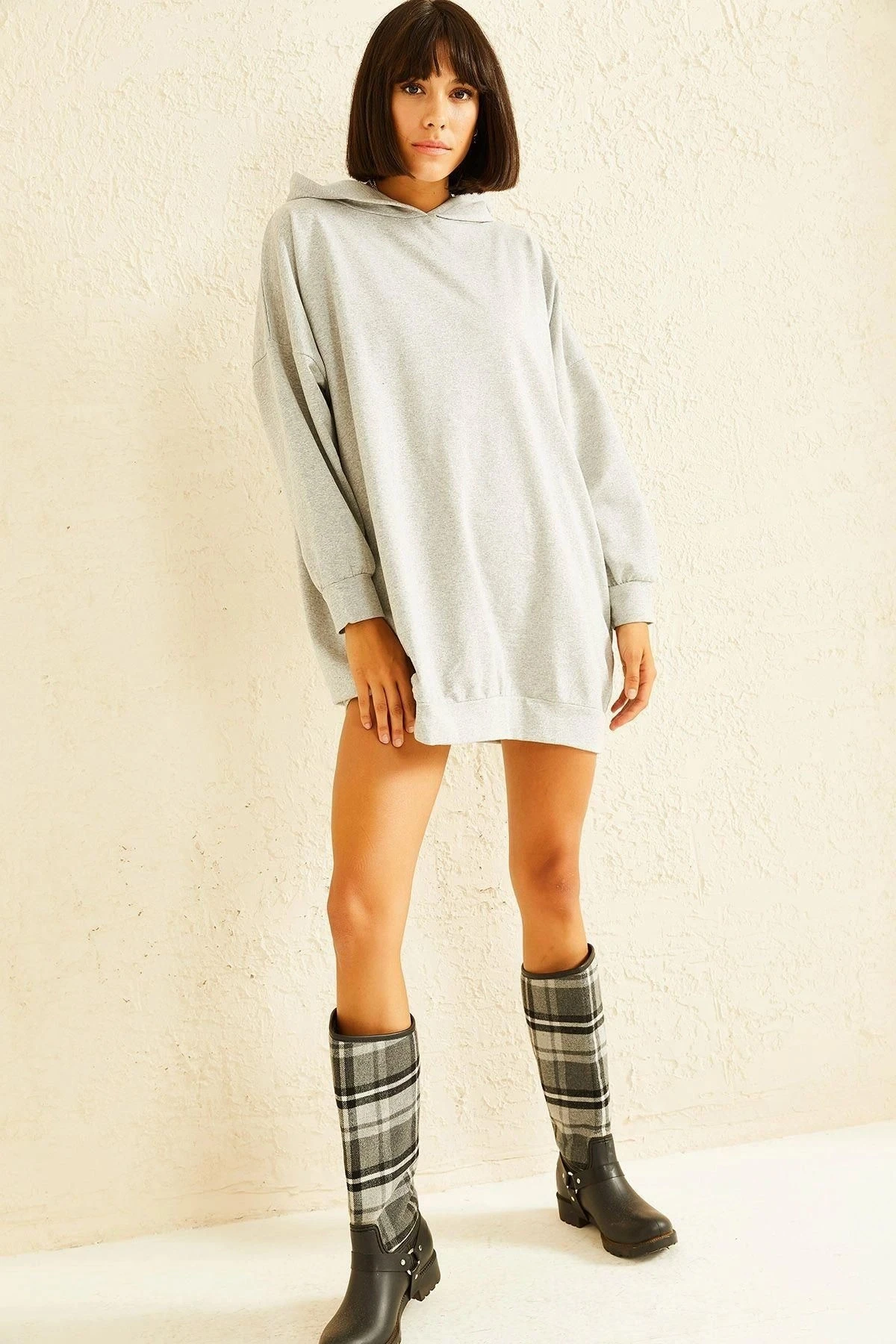 Kadın Gri Kapşonlu Yaka, Uzun Kol, Basic, Kaliteli Kumaş Oversize Kesim, Maksi Boy Sweatshirt.