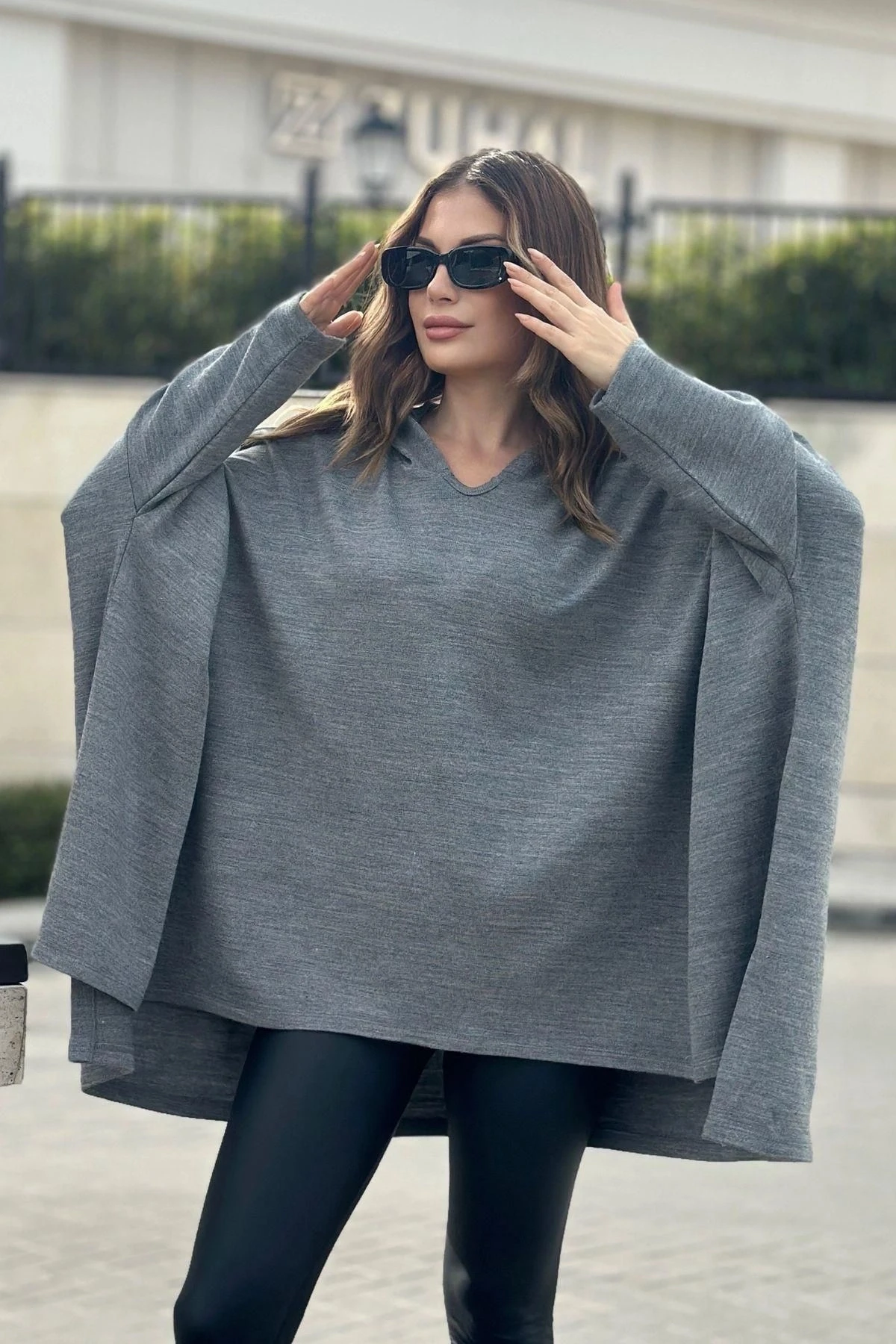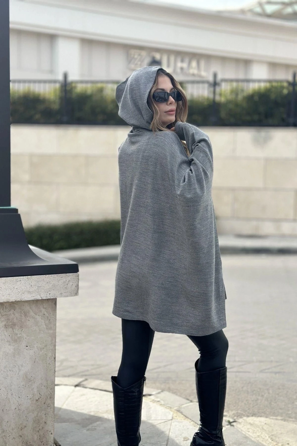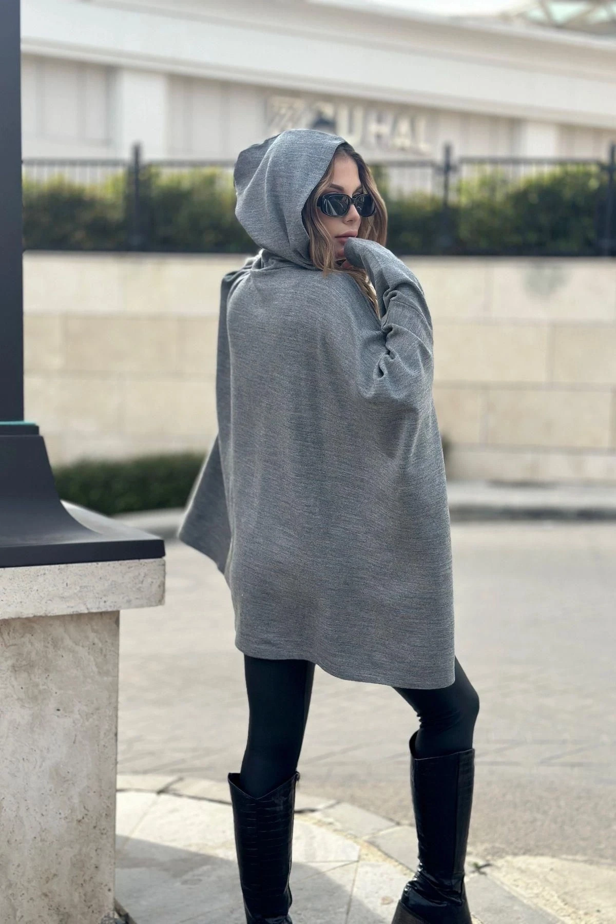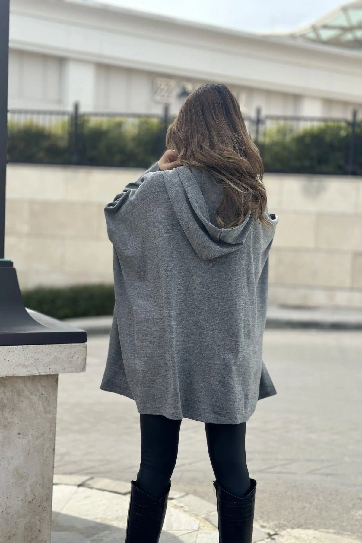 Kadın Gri Kapüşonlu, Asimetrik Kesim, Akrilik Kumaş, Salaş-Oversize Panço Kazak