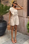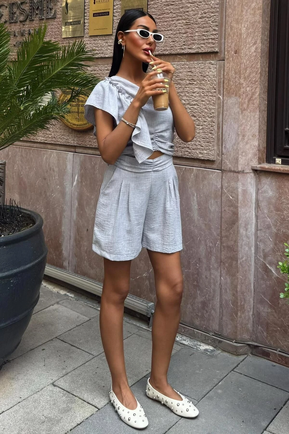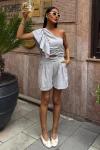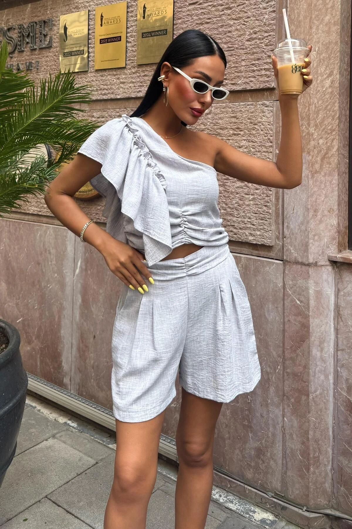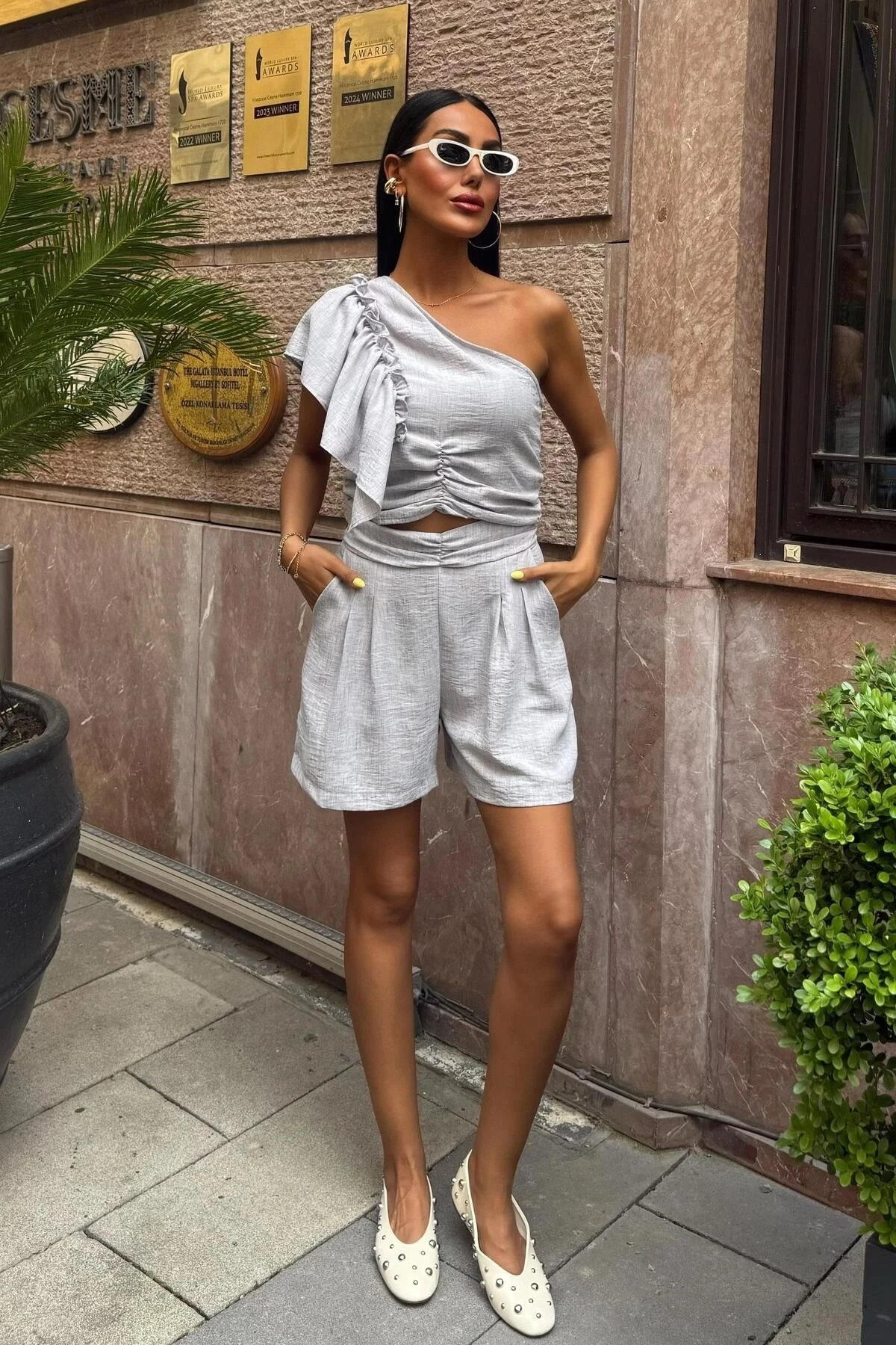 Kadın Gri Keten Tek Omuzlu Fırfırlı Takım