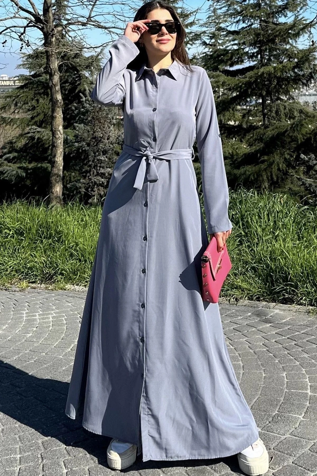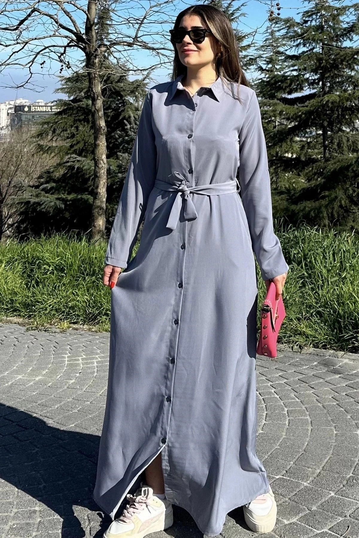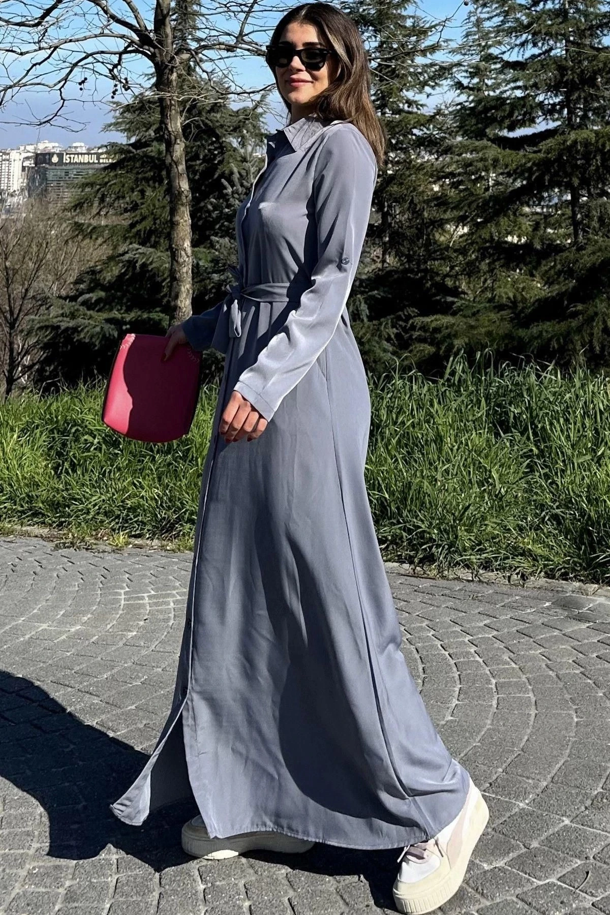 Kadın Gri Kupra Kumaş, Uzun Kol, Beli Kuşaklı, Vucüda Oturan Kalıp, Uzun Gömlek Elbise