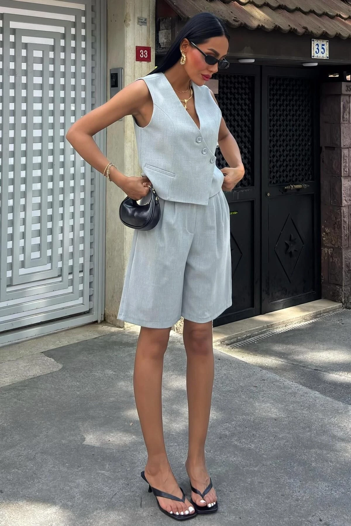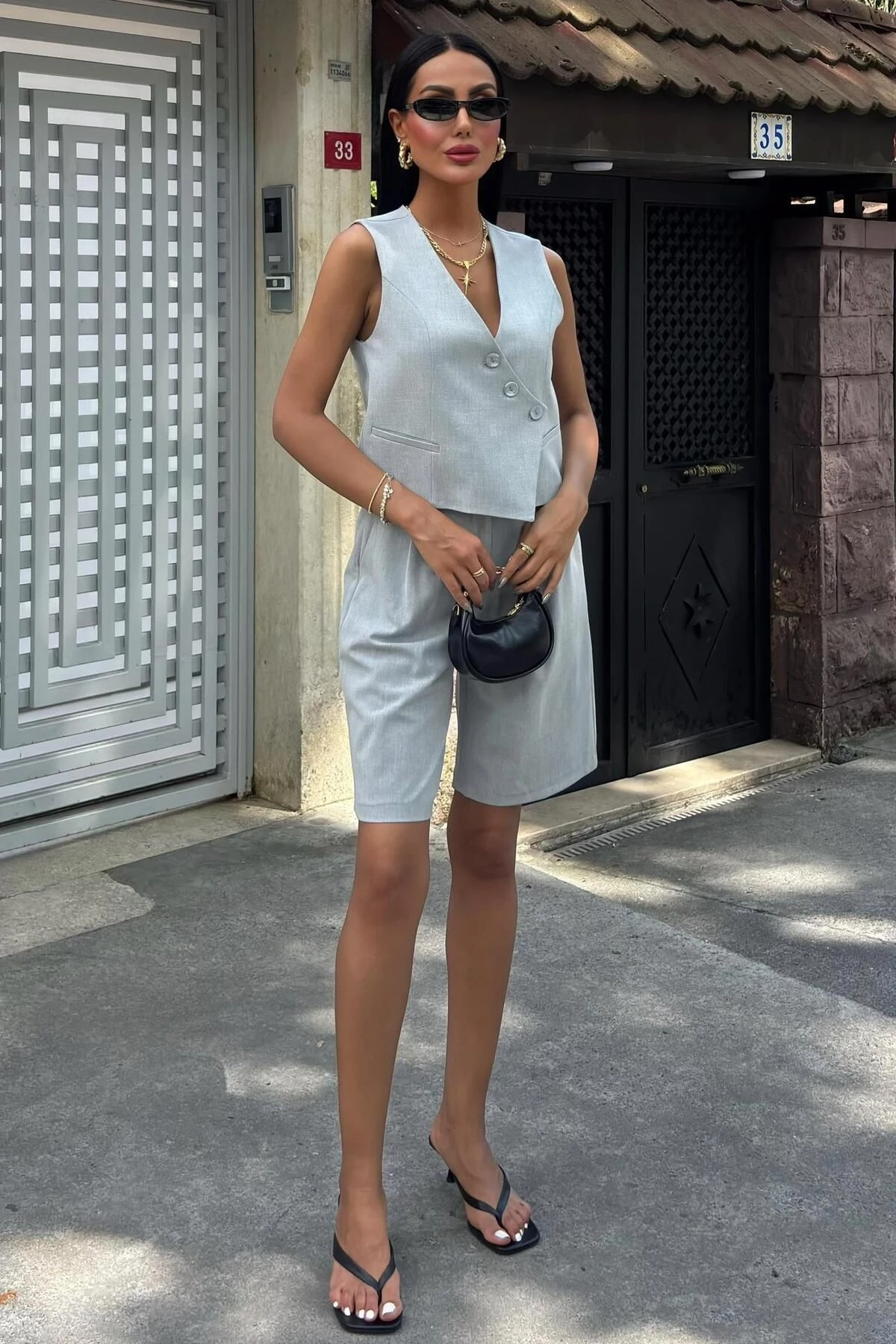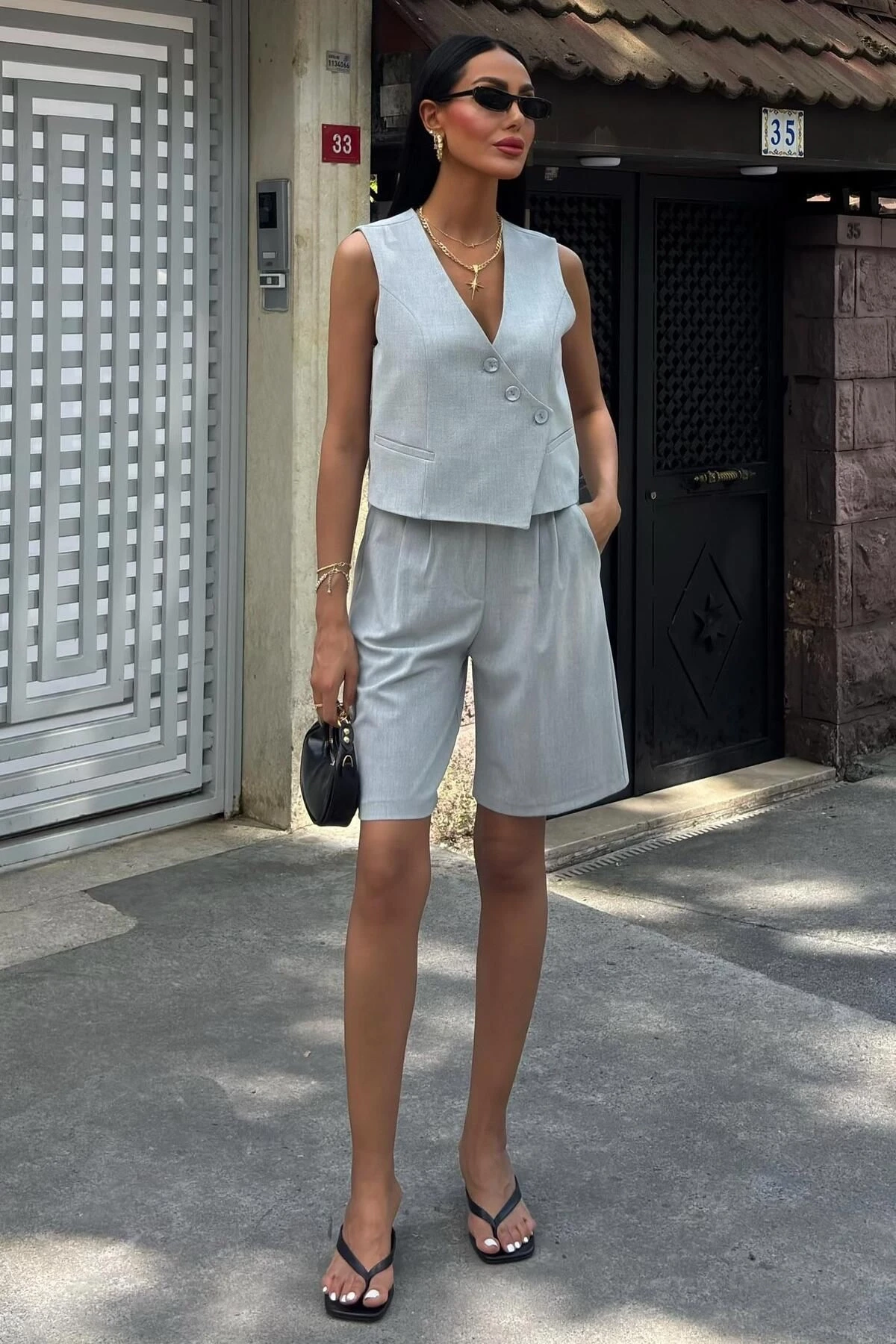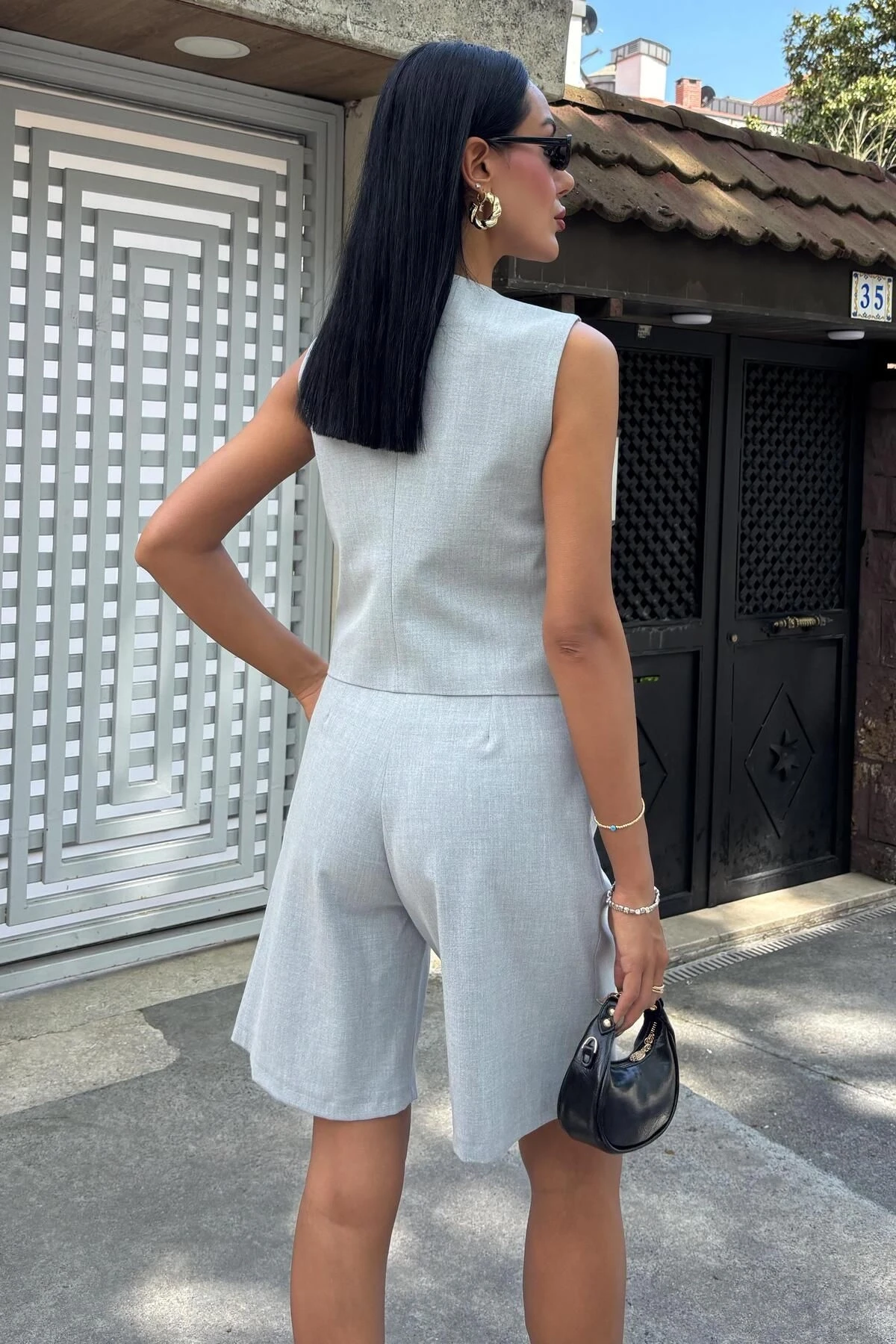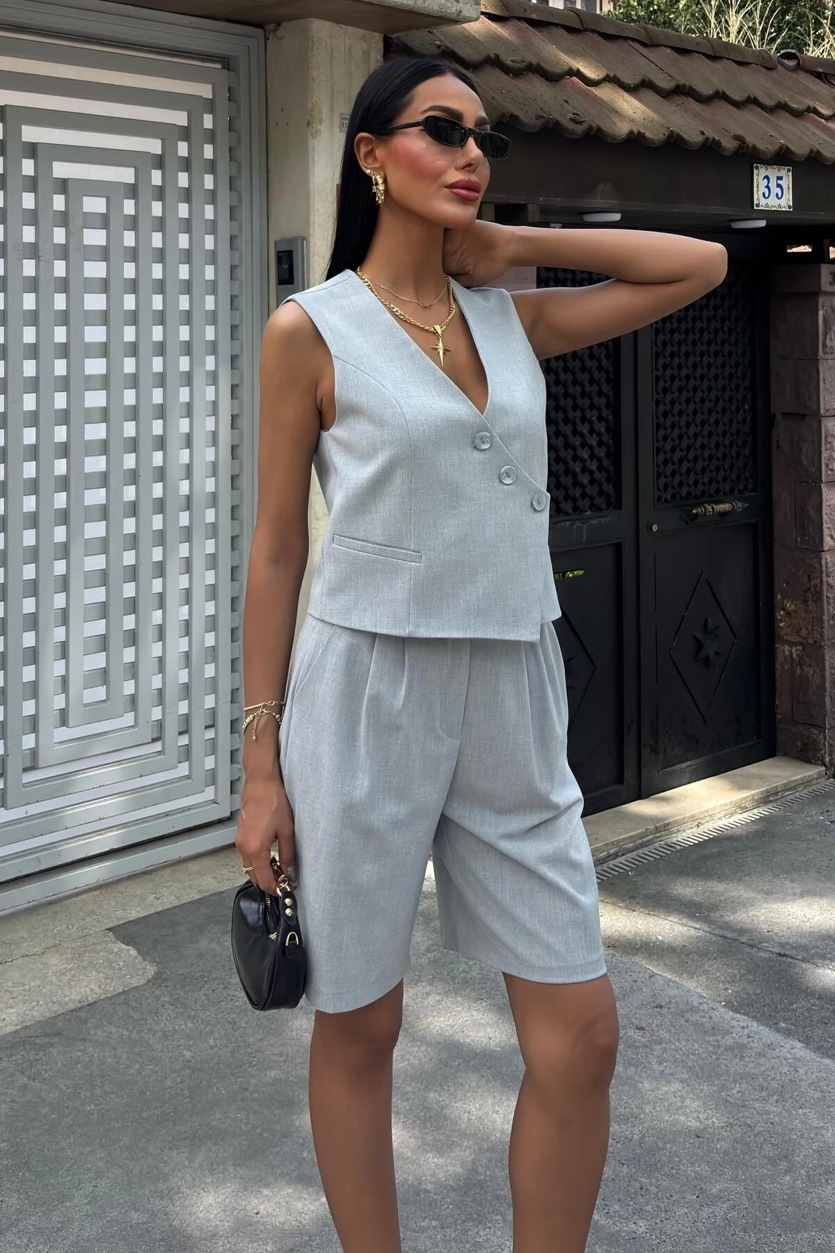 Kadın Gri Poliviskon V Yaka Kolsuz İkili Takım