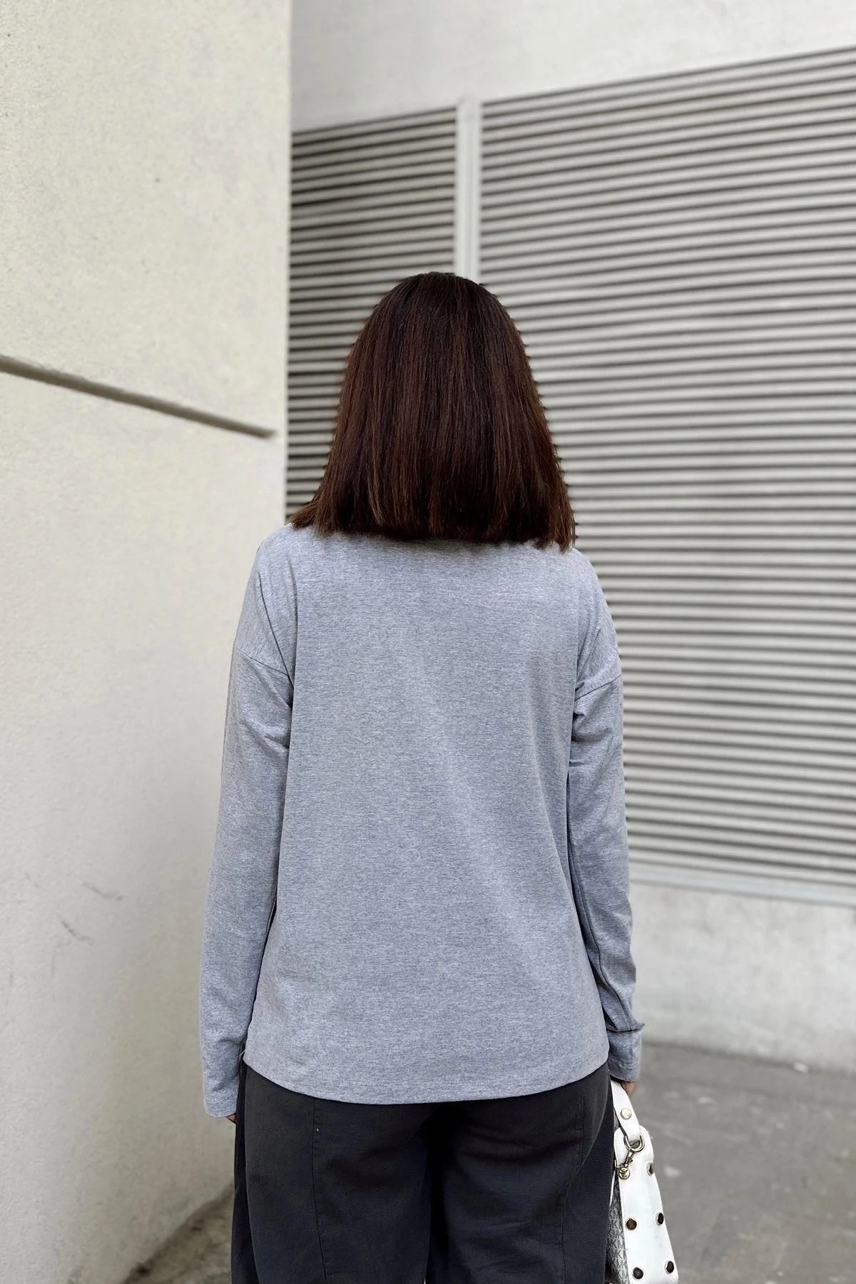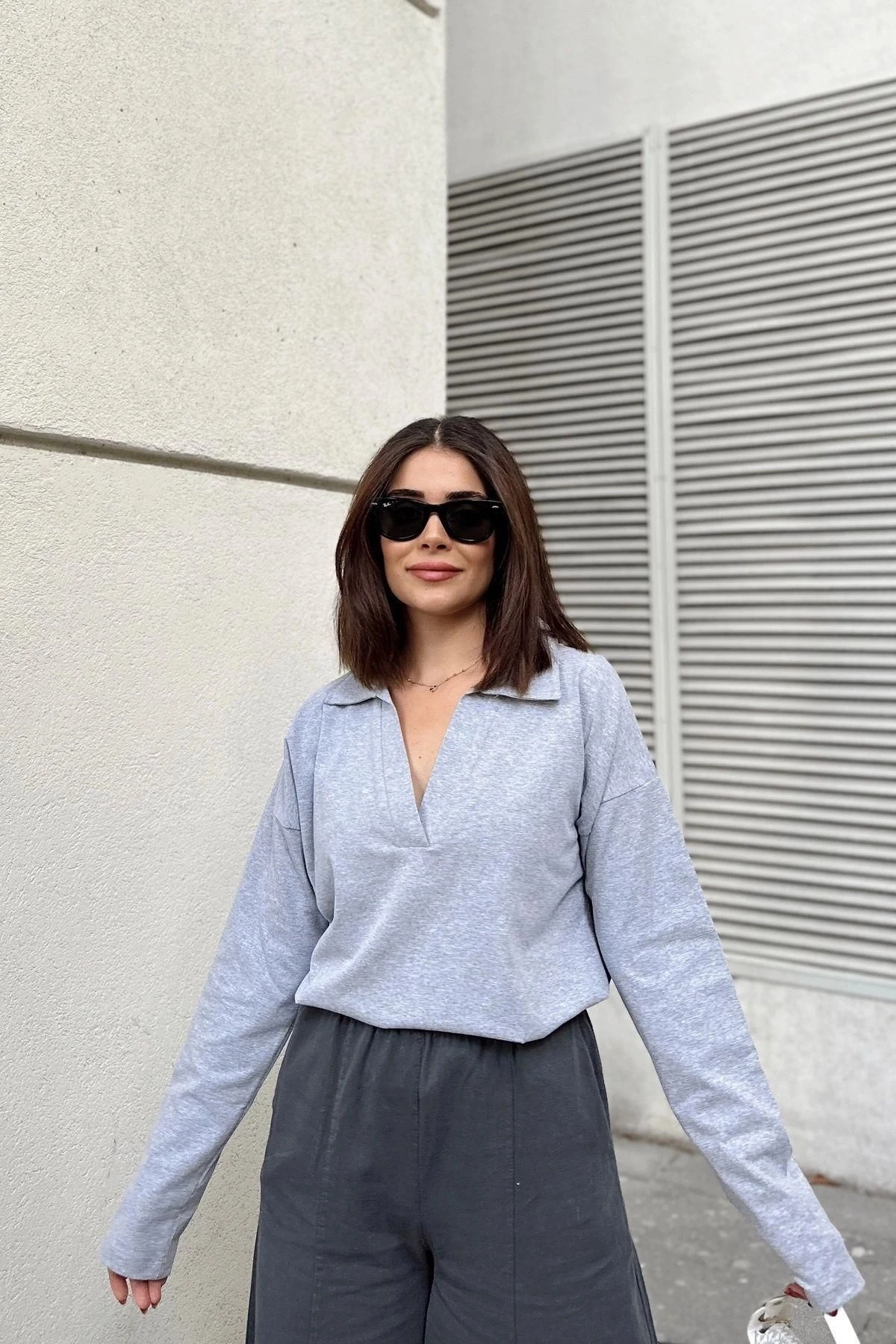 Kadın Gri Polo Yaka Basic Bluz, Uzun Kol, Regular Kesim, Günlük Ve Spor Kaliteli Kumaş Sweatshirt
