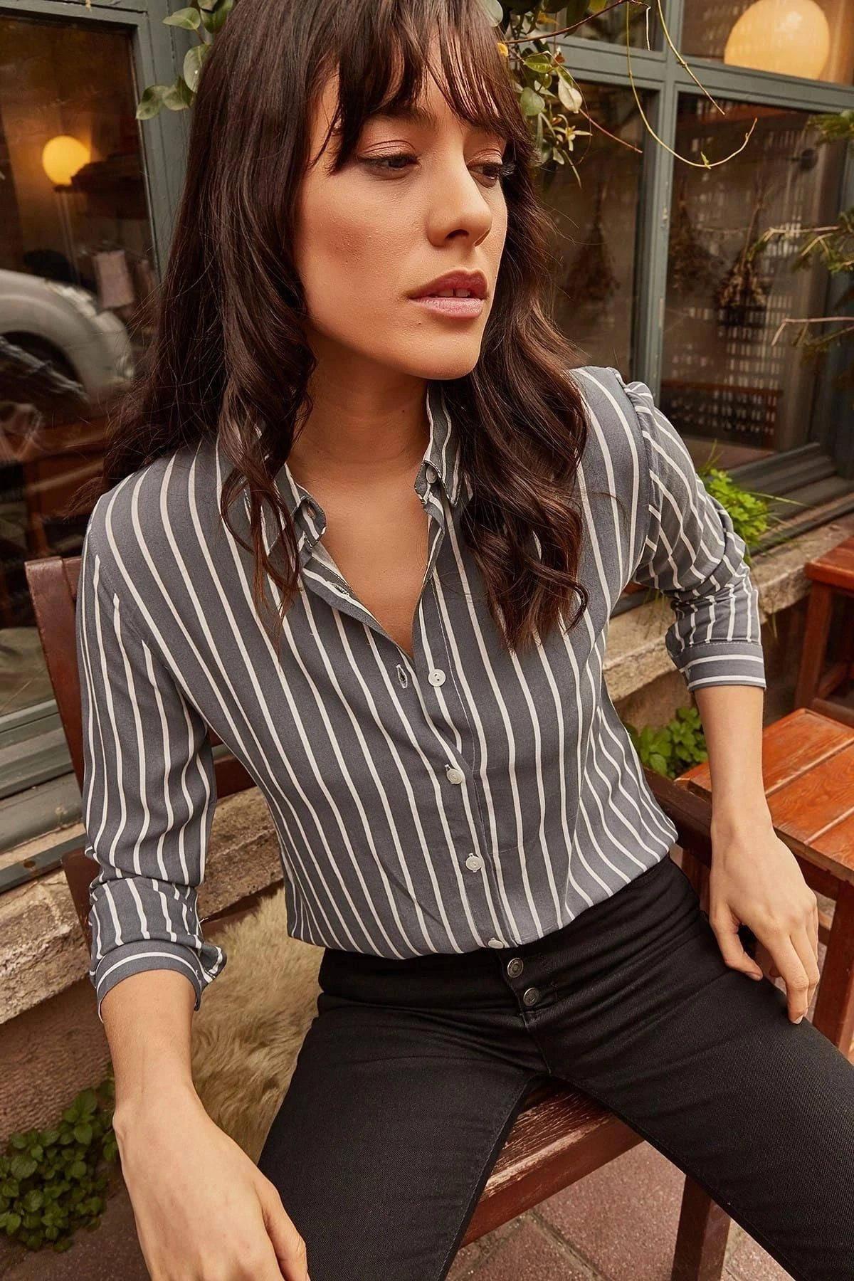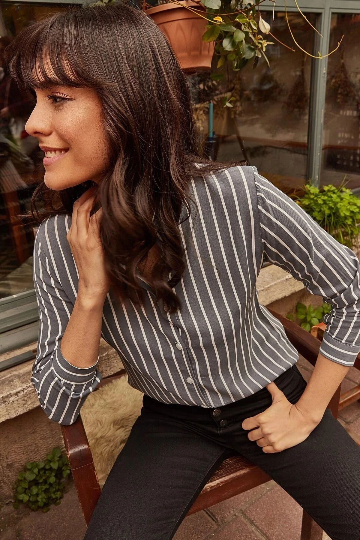 Kadın Gri Stil Çizgili Klasik Yaka Uzun Kol Standart Boy Gömlek