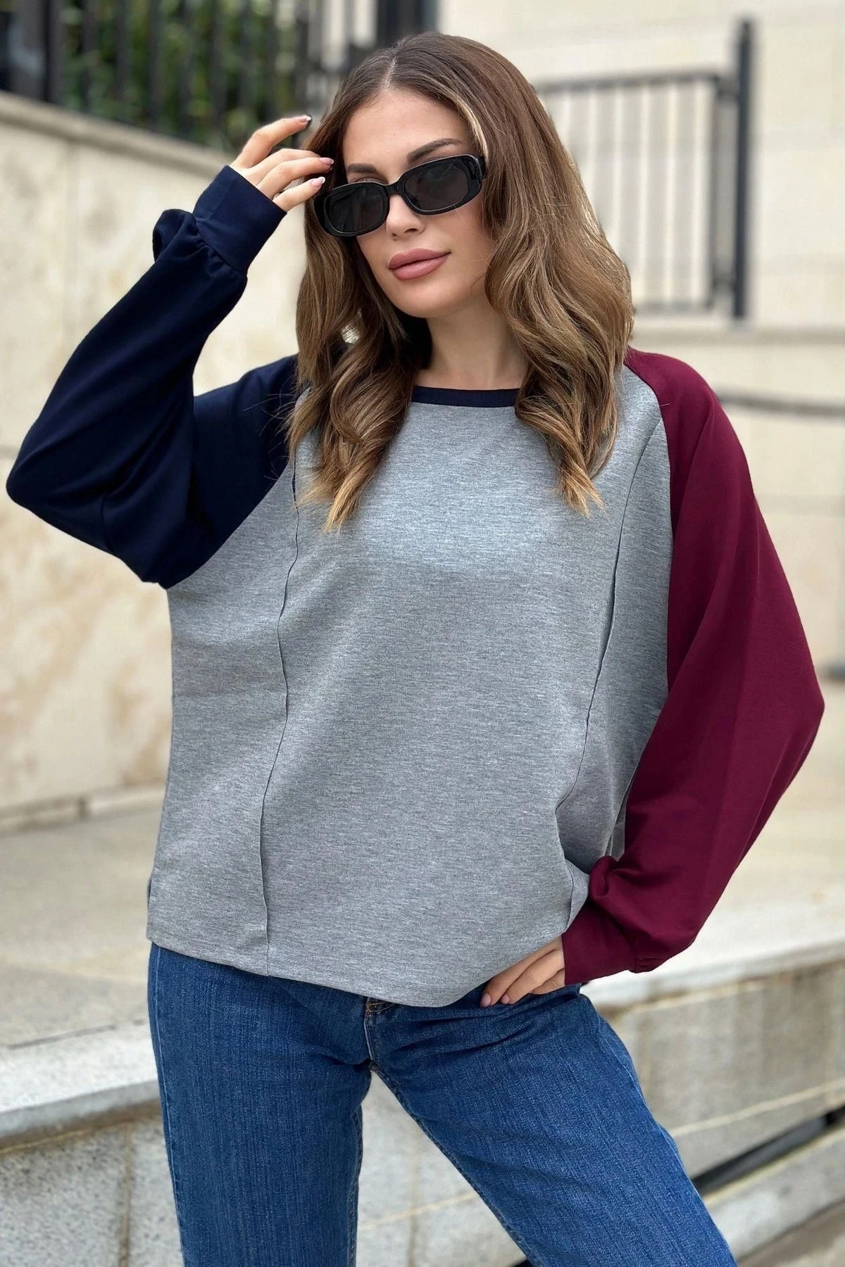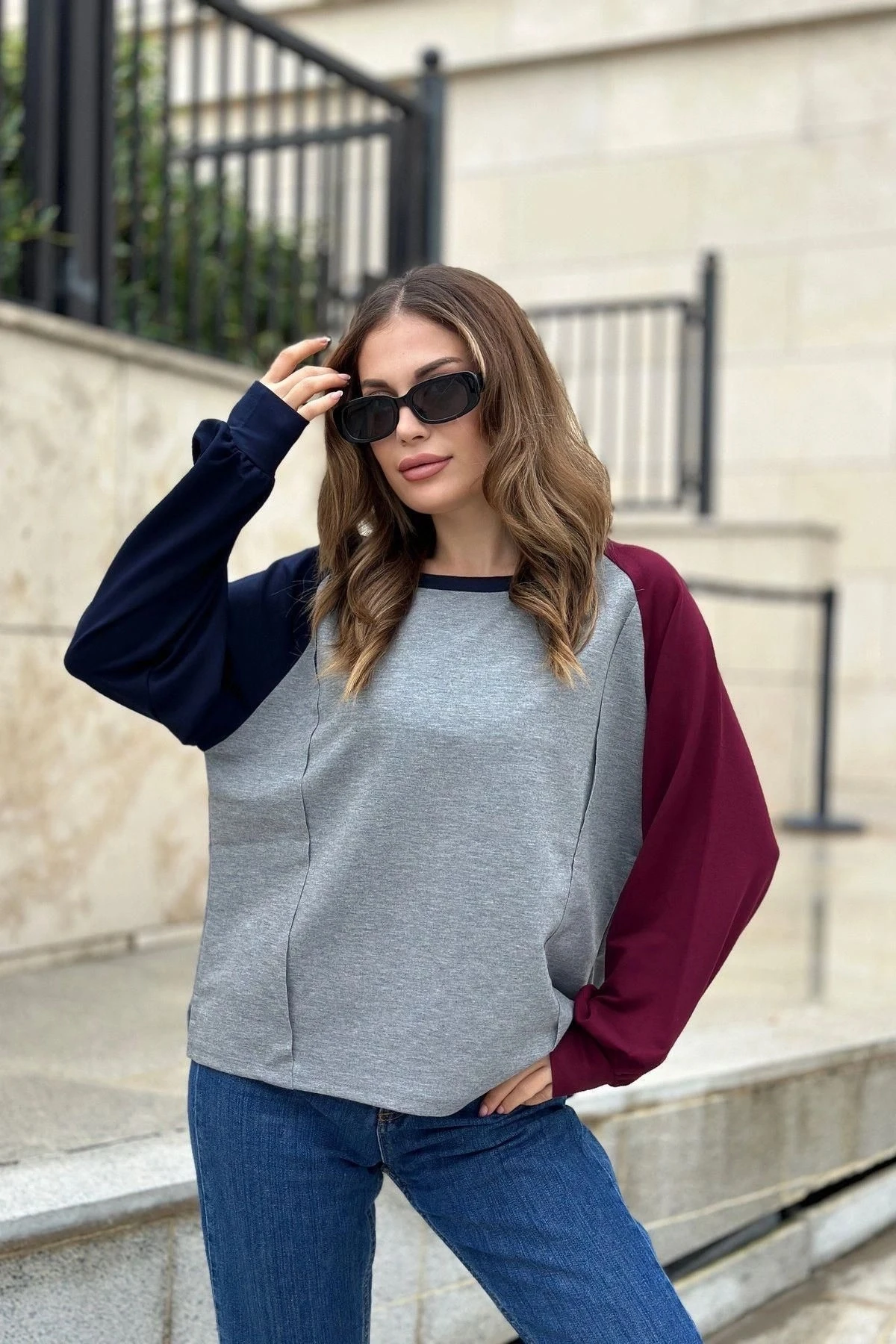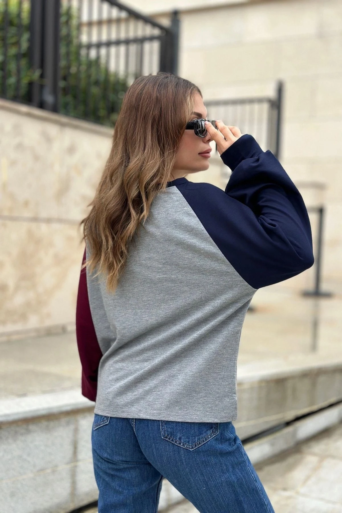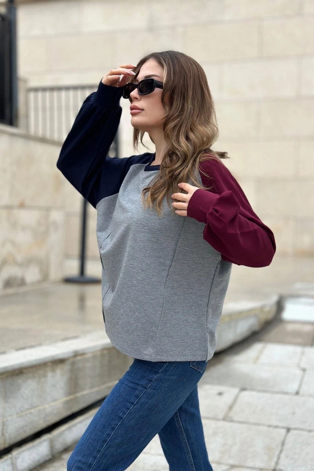 Kadın Gri Uzun Balon Kol, Yuvarlak Yaka, Kolları Double Color Block Basic Sweatshirt Bluz