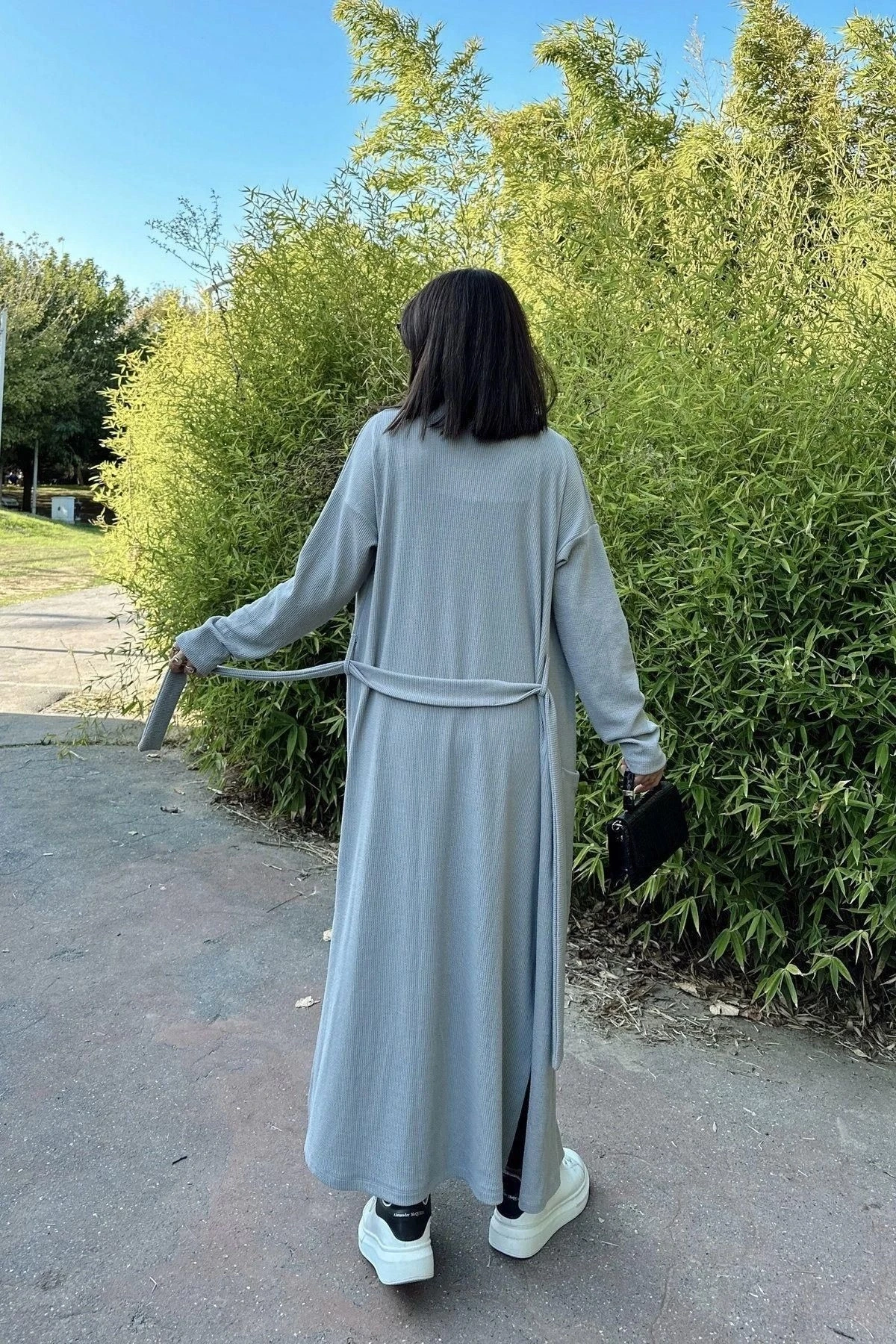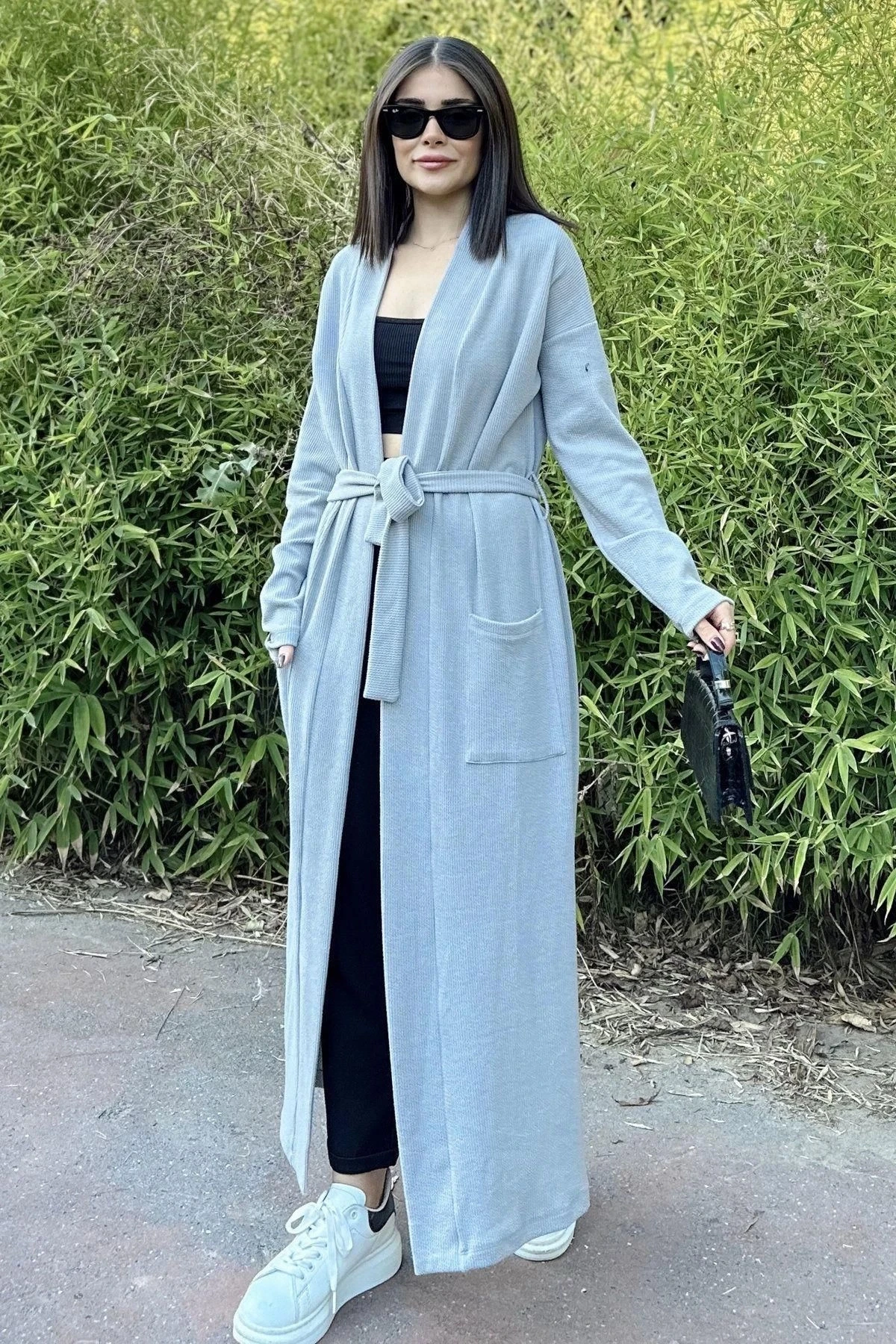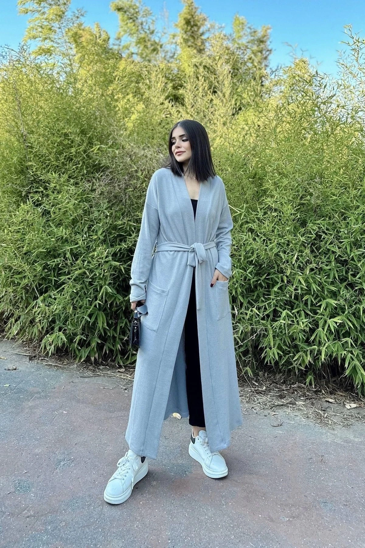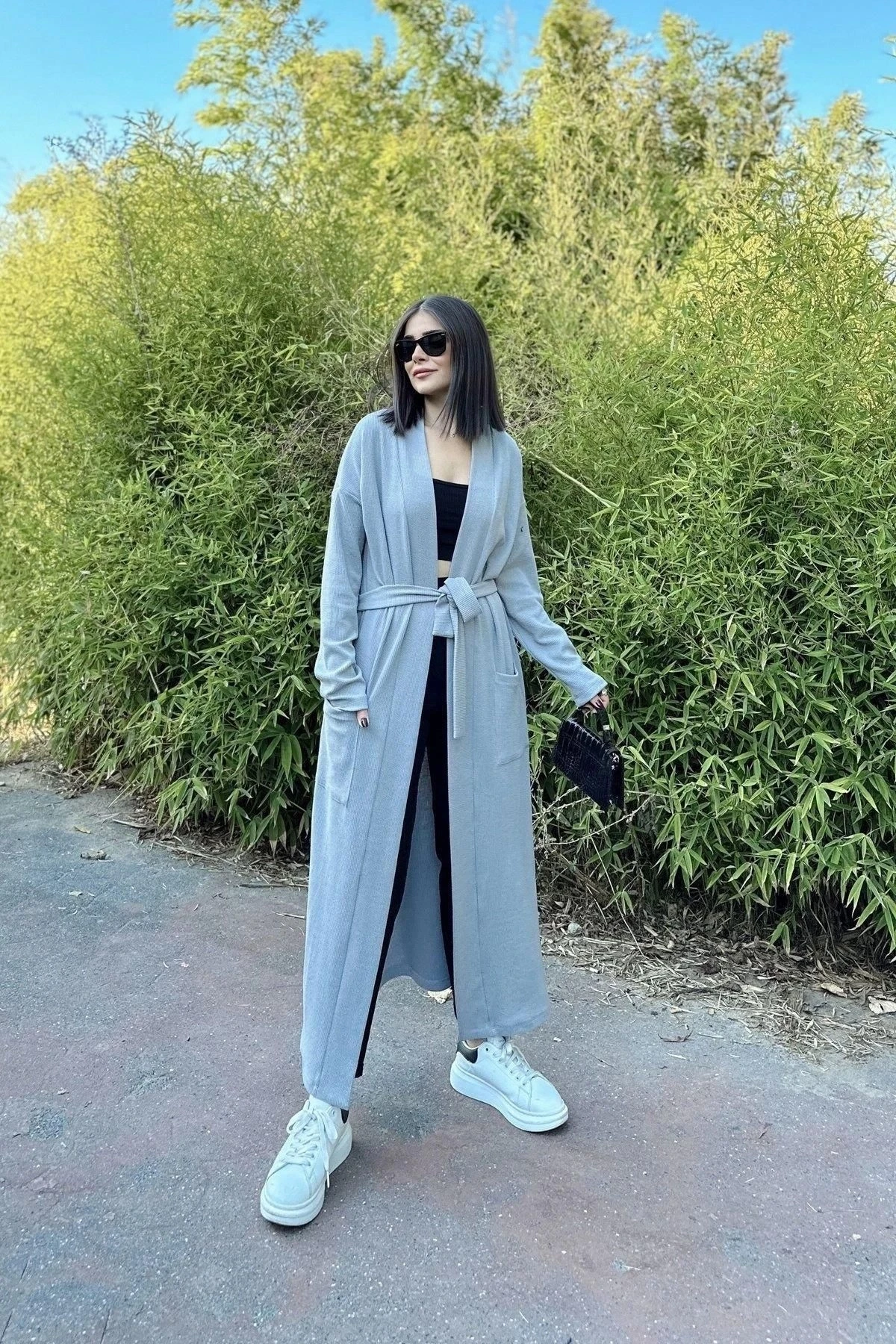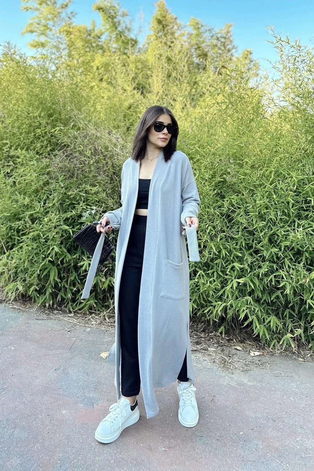 Kadın Gri Uzun Kol, Beli Kemerli, Düğmesiz, Çift Cepli, Uzun Örme Hırka