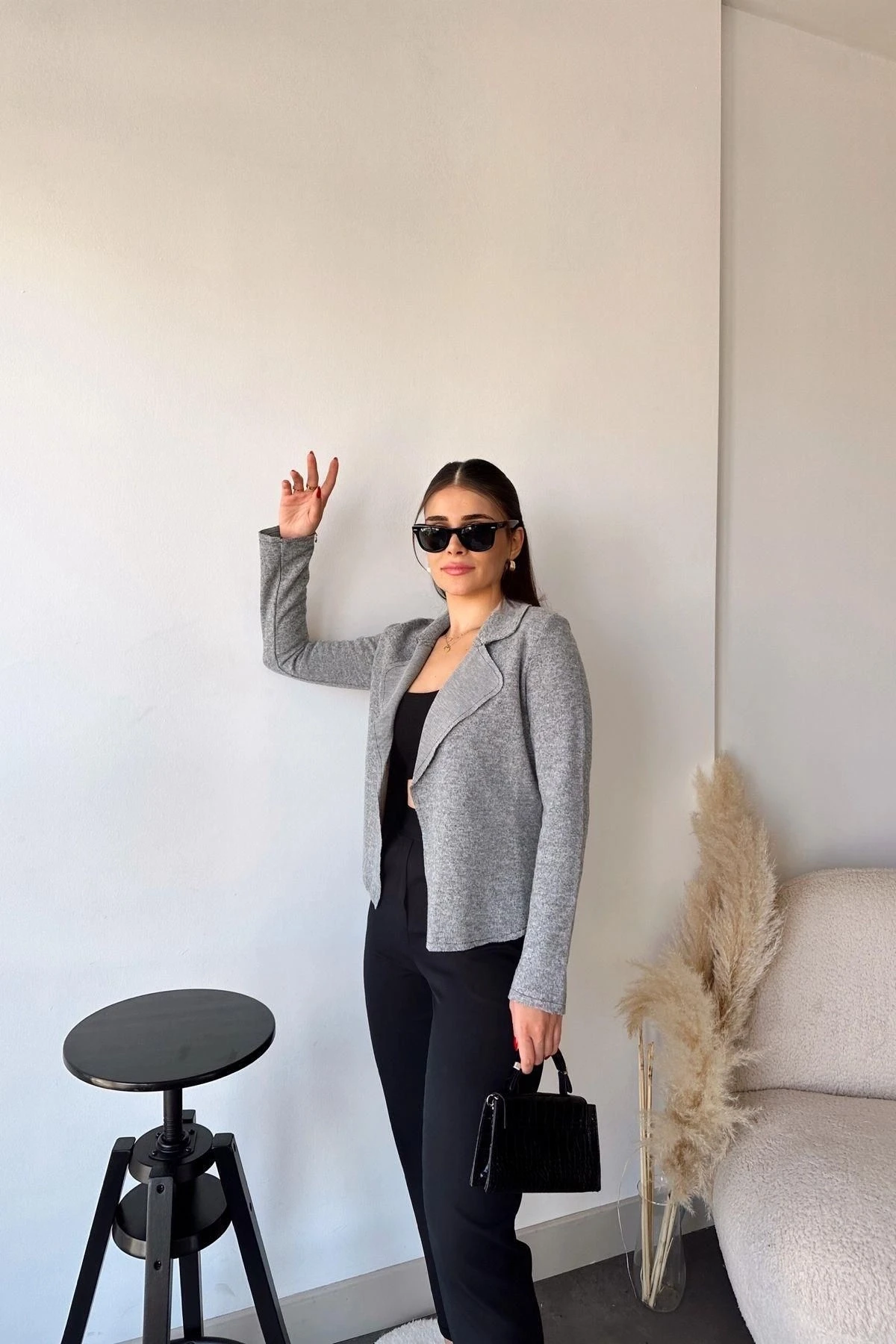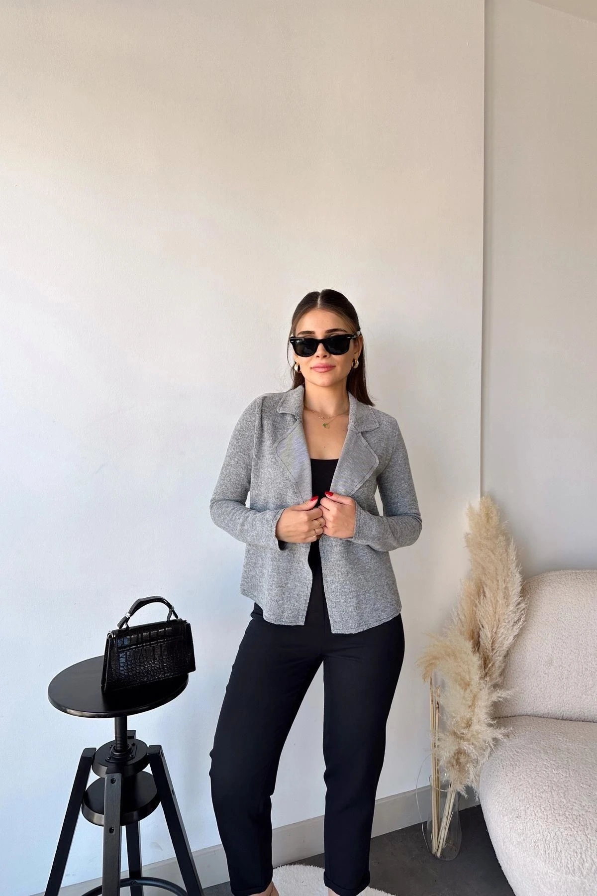 Kadın Gri Uzun Kol, Yumuşak Dokulu, Çift Taraflı Yaka, Hırka Ceket