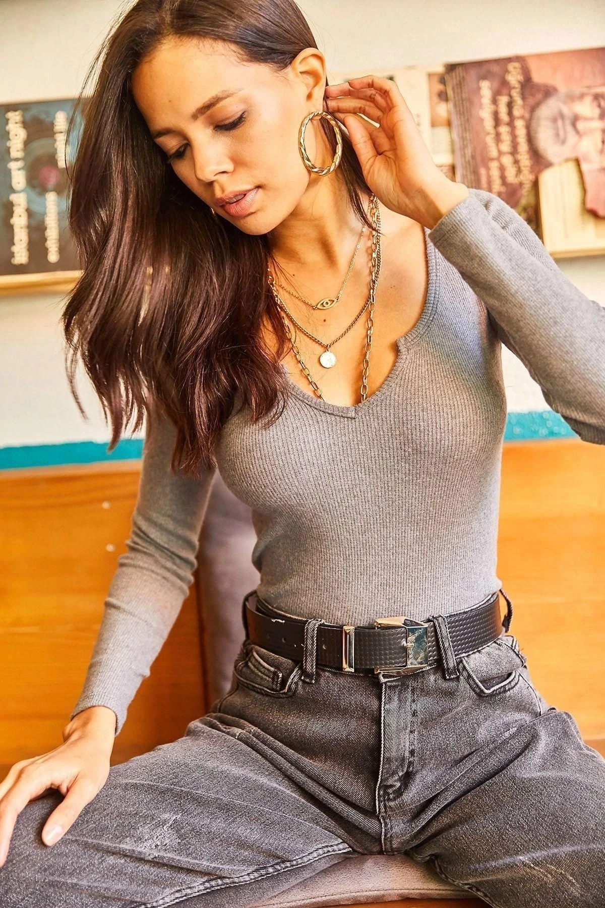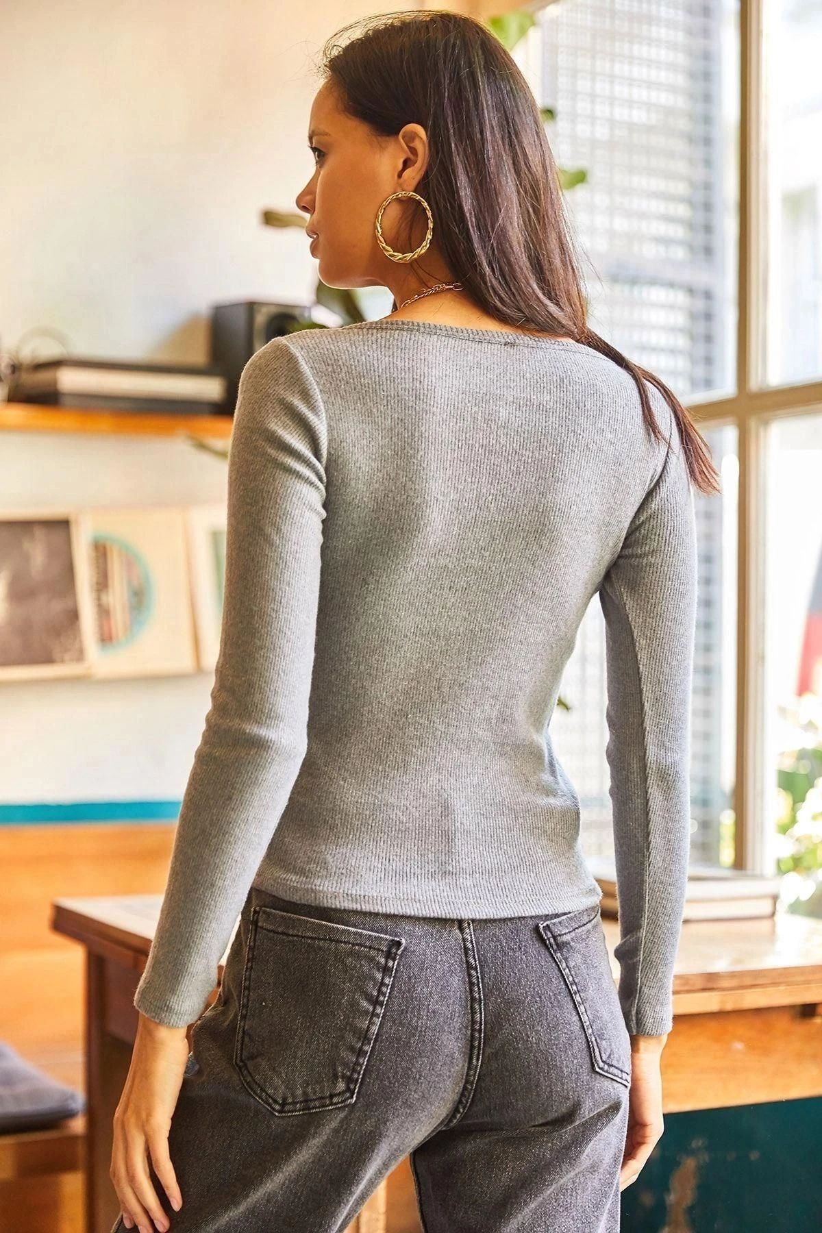 Kadın Gri V Yaka Uzun Kol Basic Regular Kesim Standart Boy Bluz
