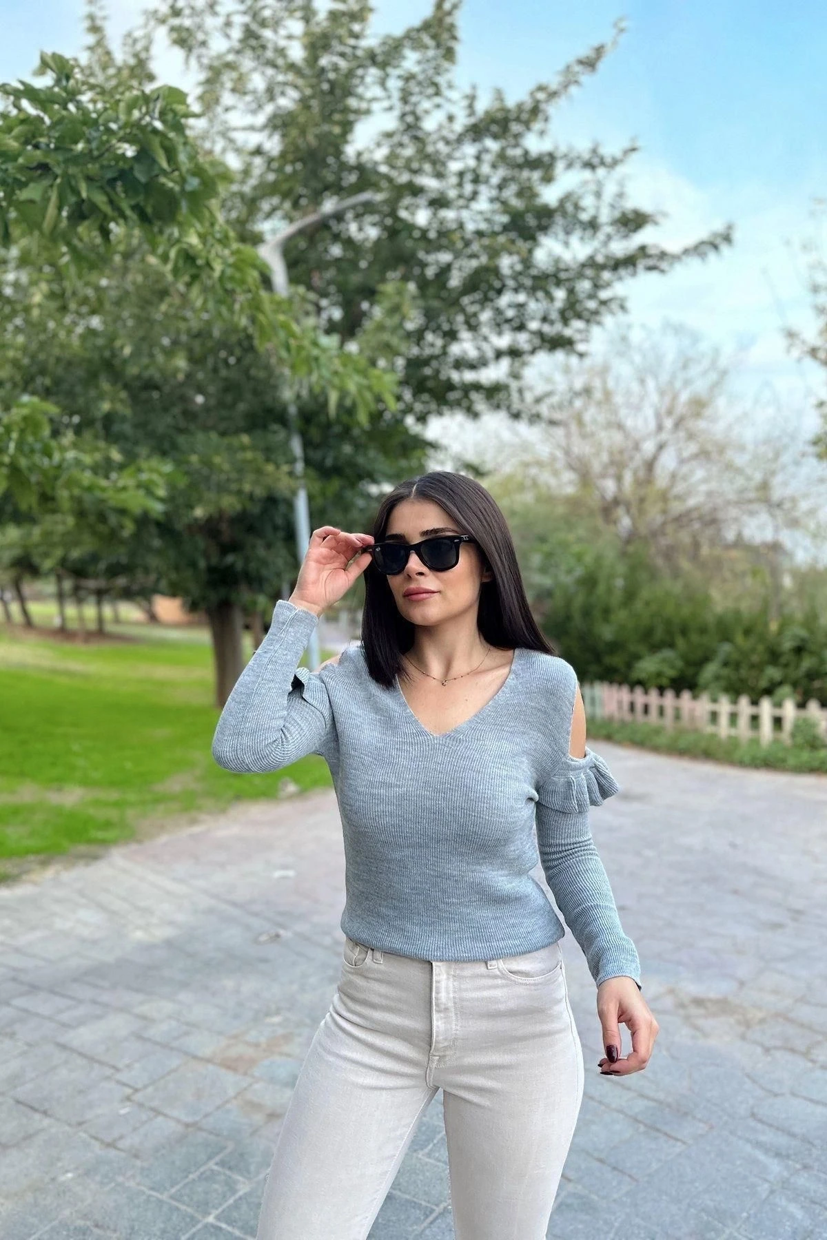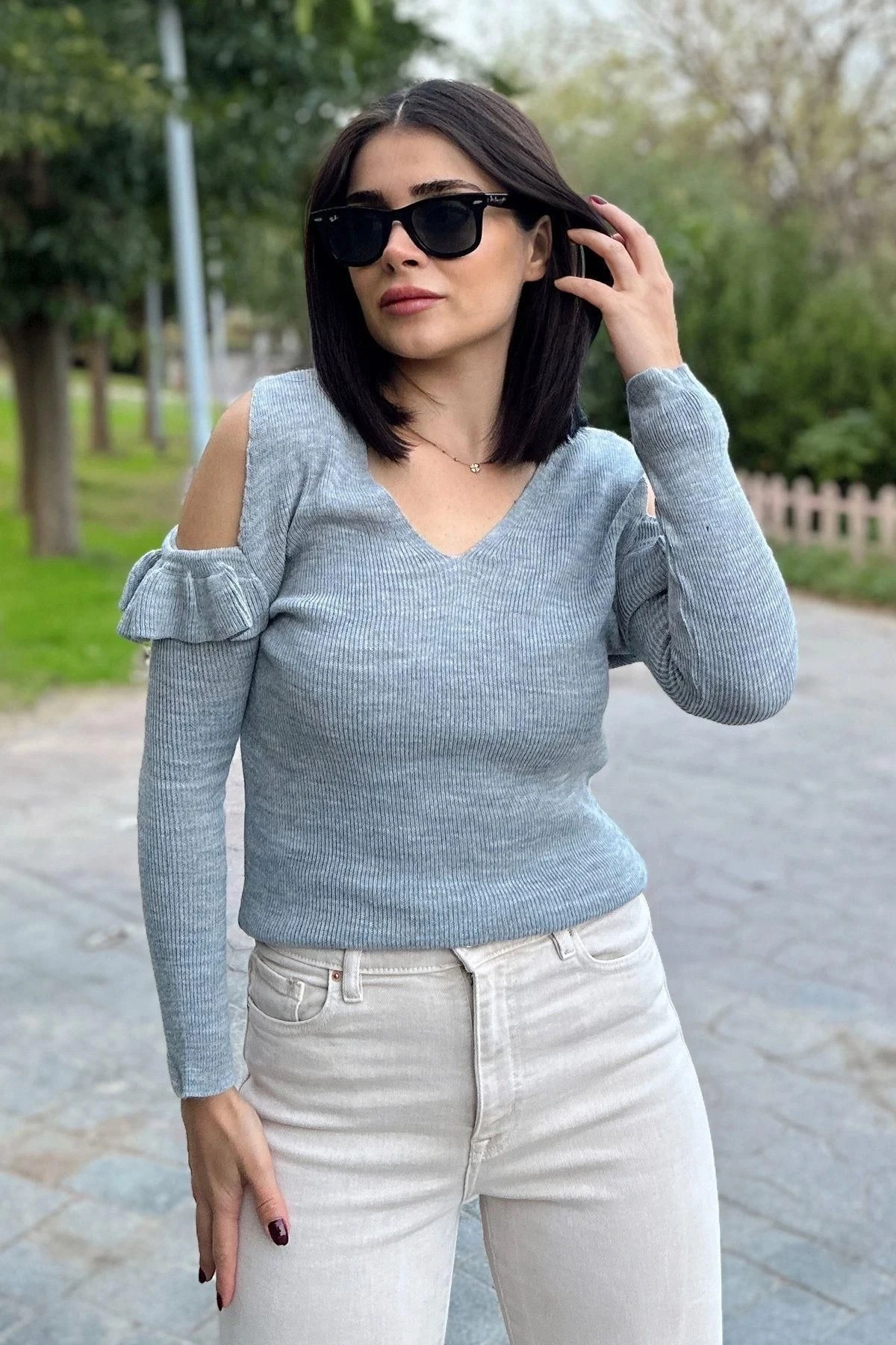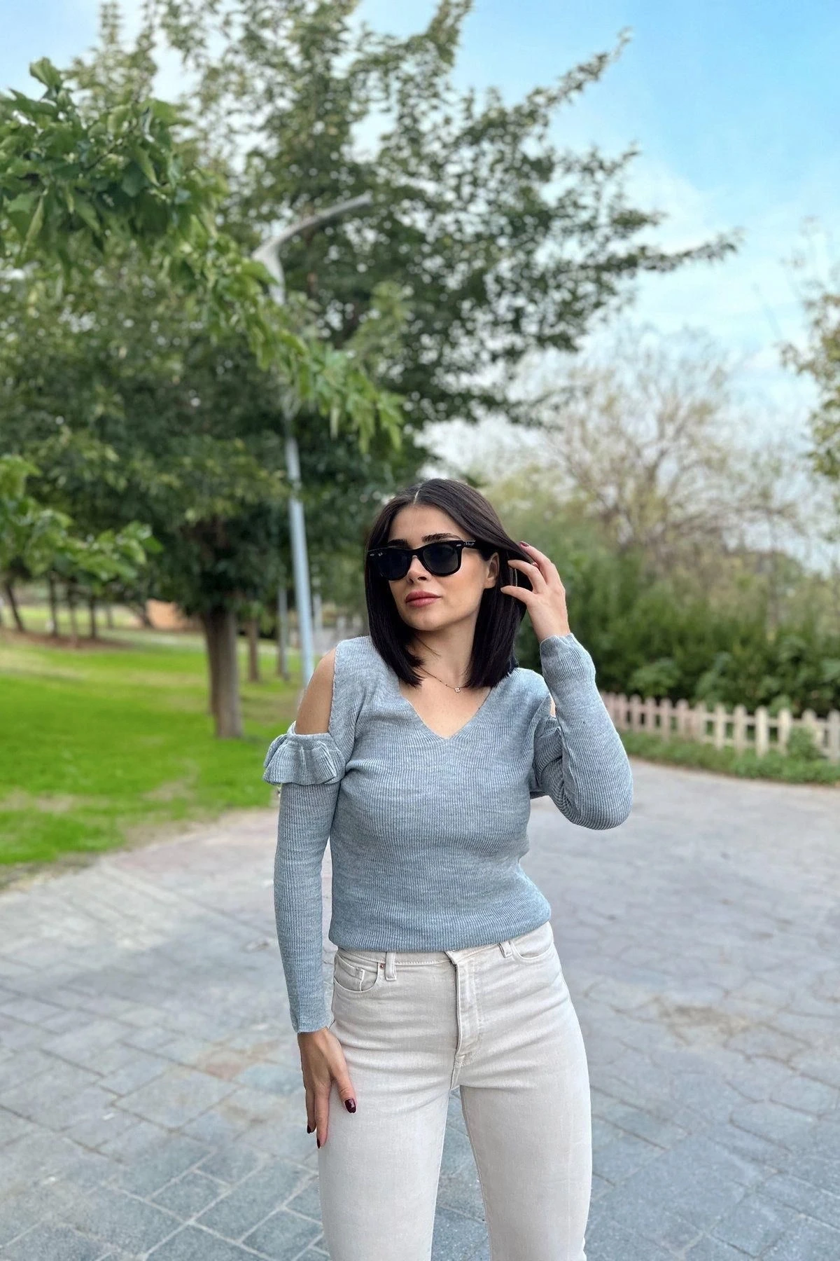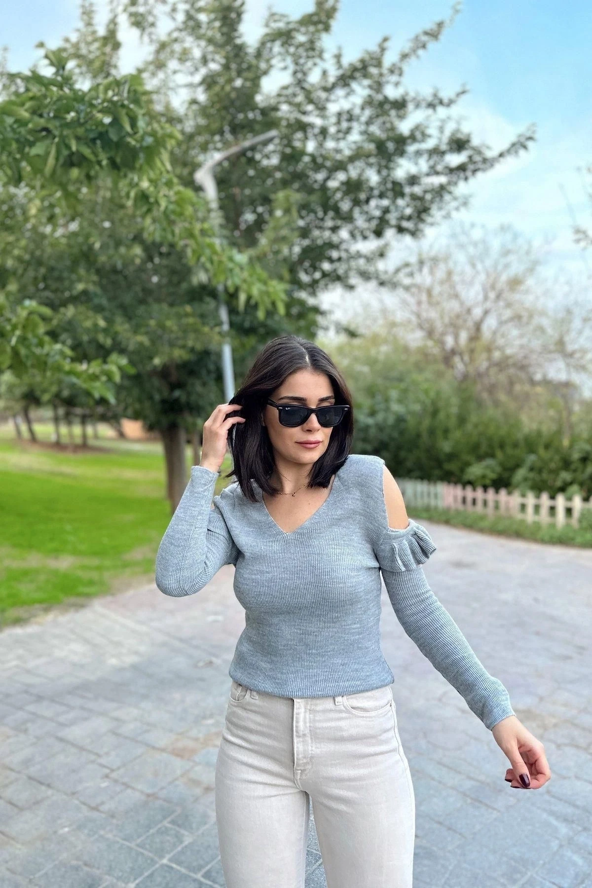 Kadın Gri V Yaka, Uzun Kol, Vucüda Oturan Esnek Kumaş, Omuzları Fırfır Detaylı, Triko Bluz
