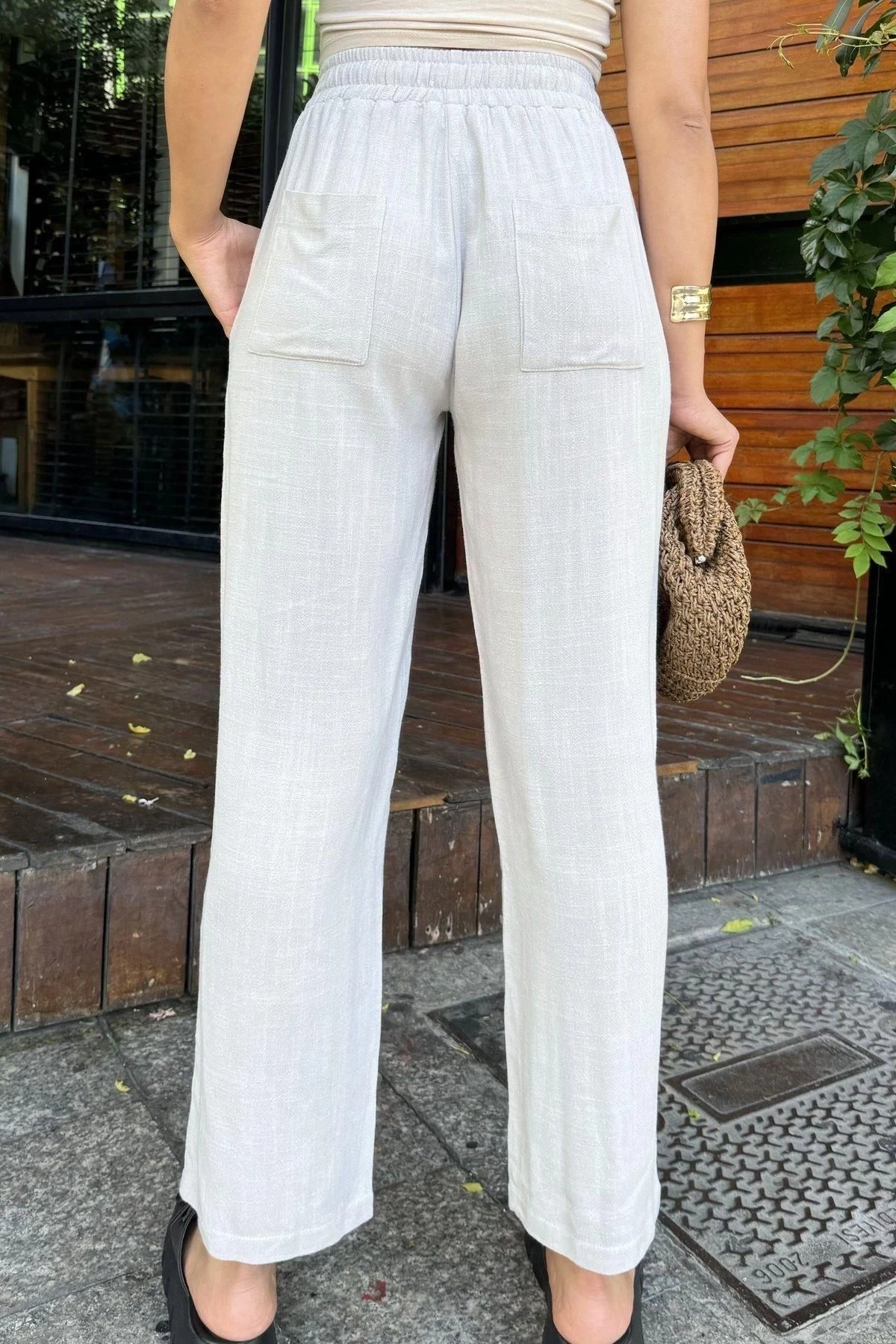 Kadın Gri Yüksek Bel, Cepli, Rahat Kesim, Keten Pantolon