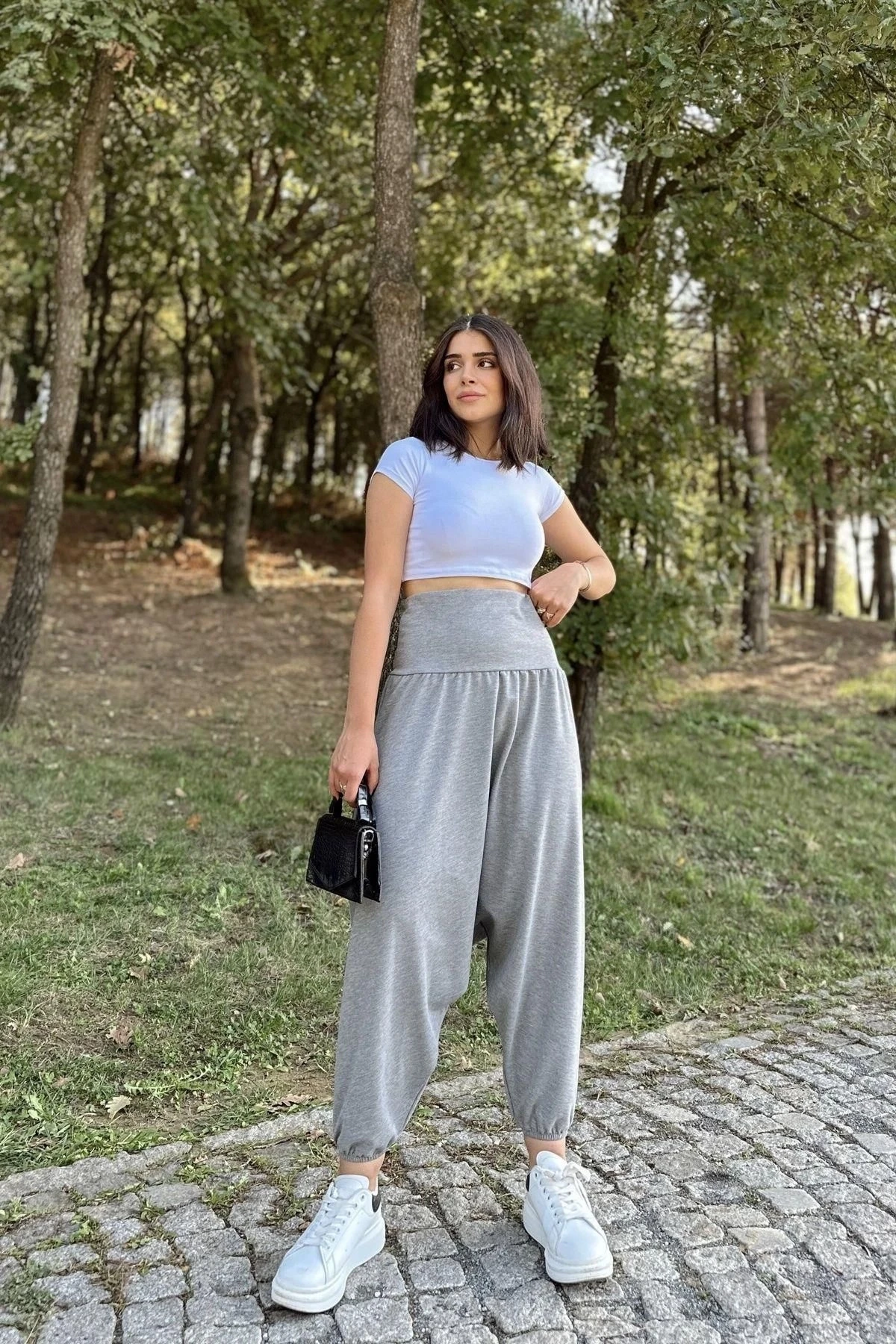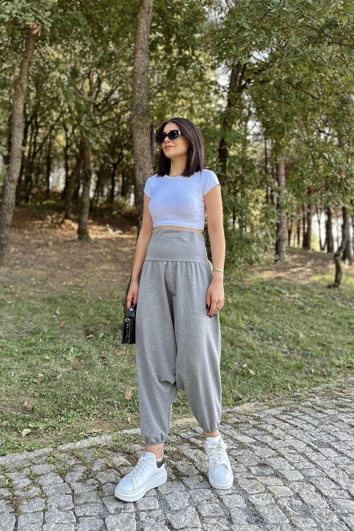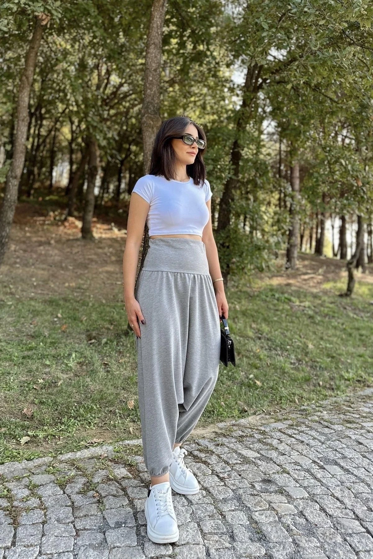 Kadın Gri Yüksek Bel, Paçası Lastikli, Salaş Örme Şalvar Pantolon