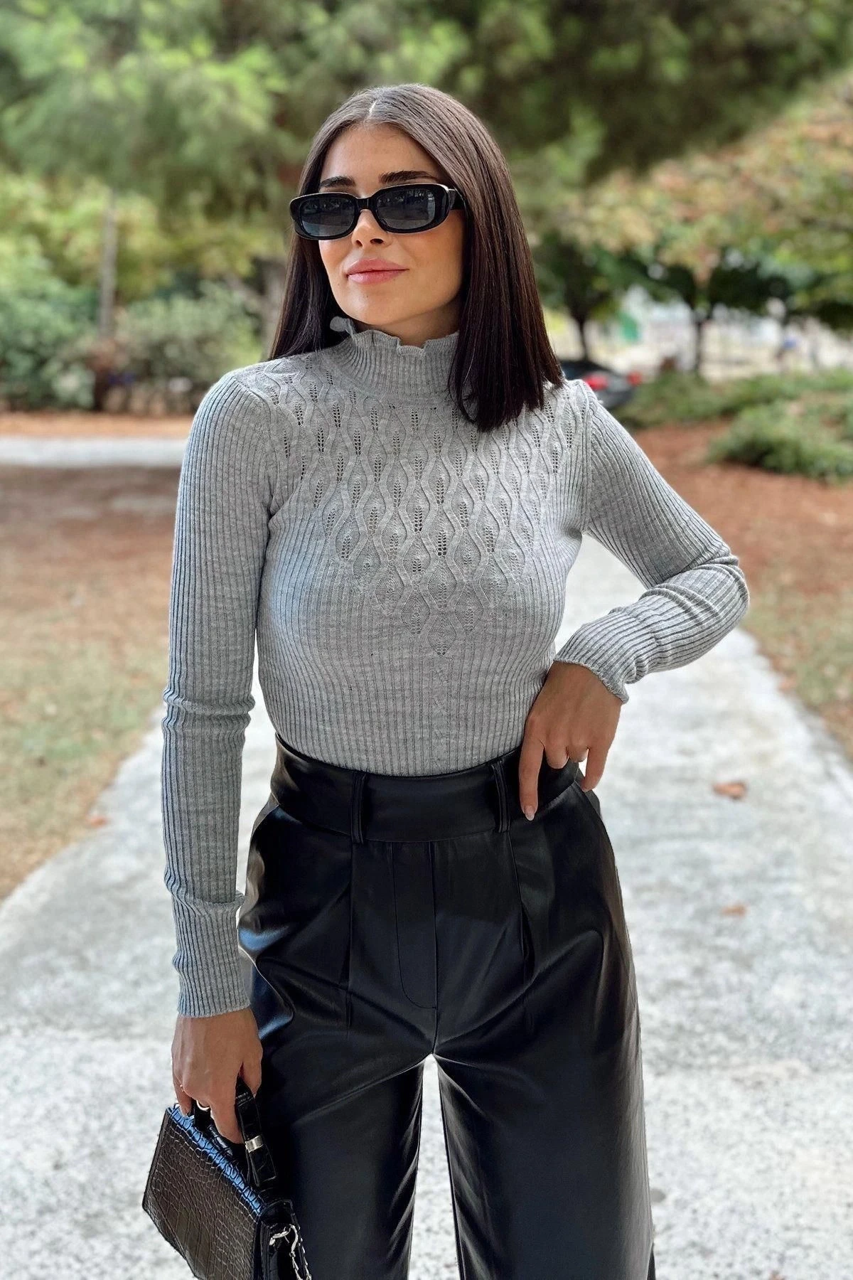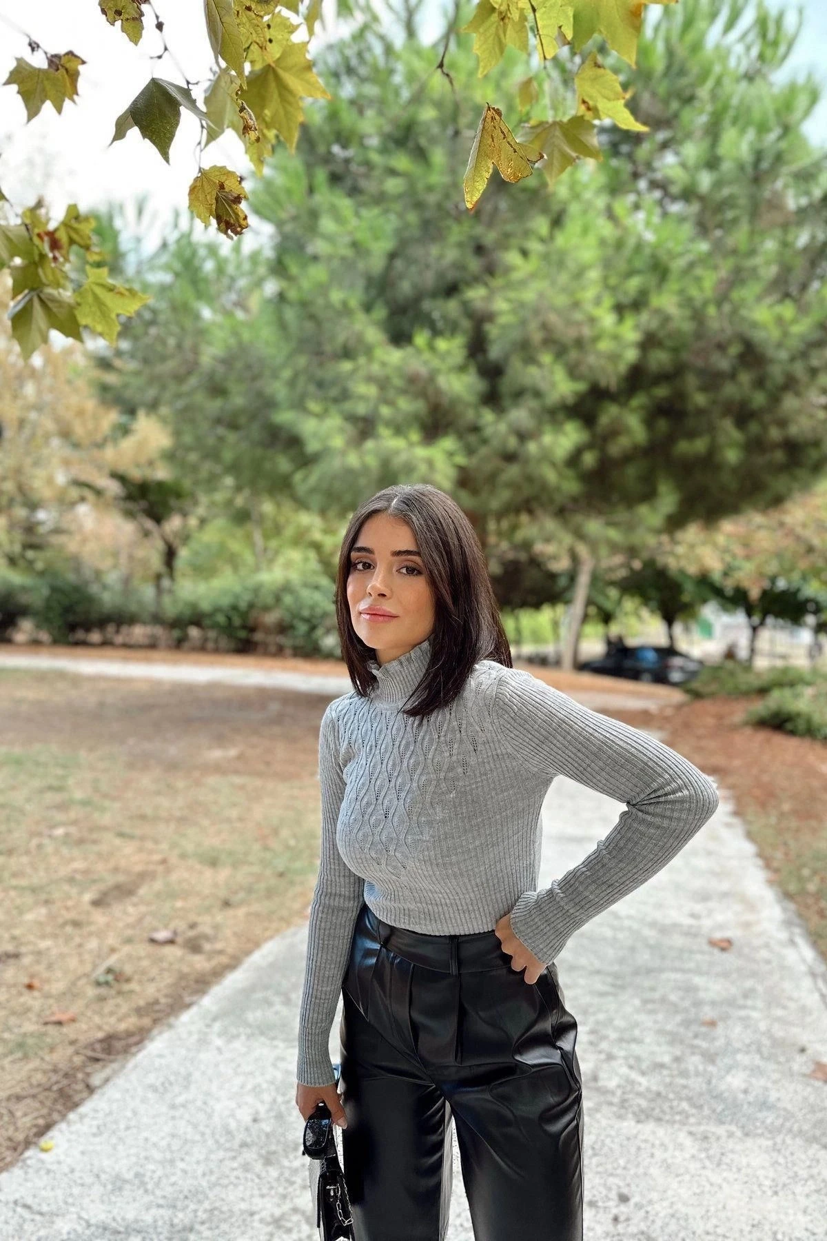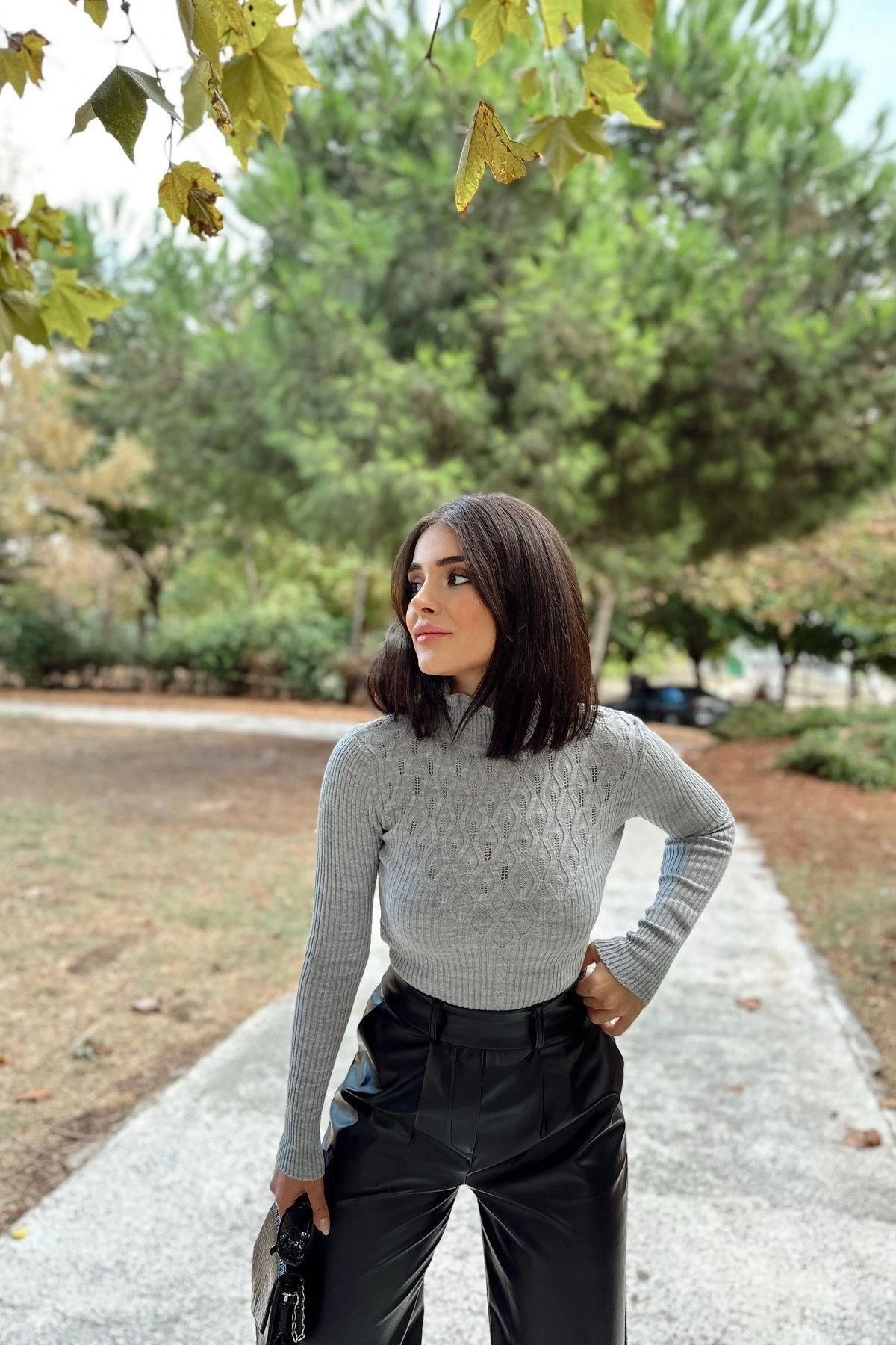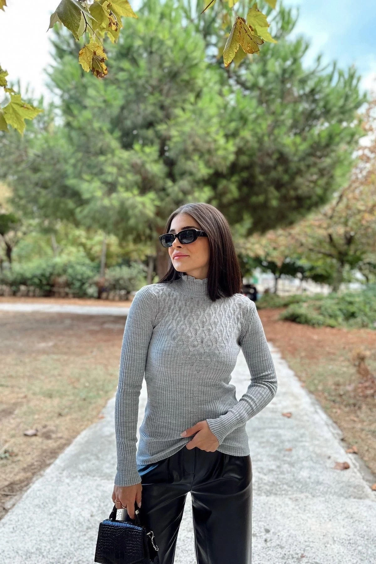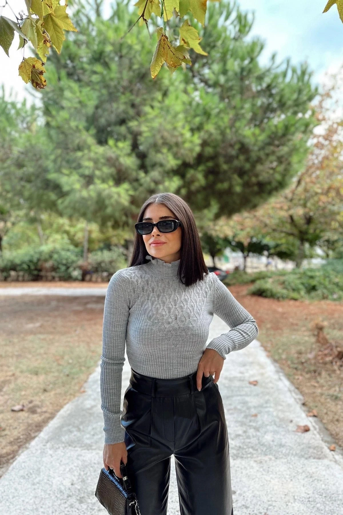 Kadın Gri Yüksek Yaka, Uzun Kol,Vucüda Oturan Kalıp, Esnek Kumaş, Dekolte Detay, Triko Bluz
