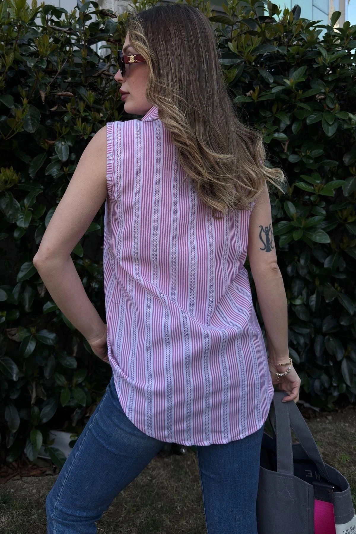 Kadın Gül Kurusu Çizgili, Dokulu Yazlık Kumaş, Yarım Patlı, Sıfır Kollu Bluz