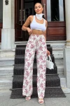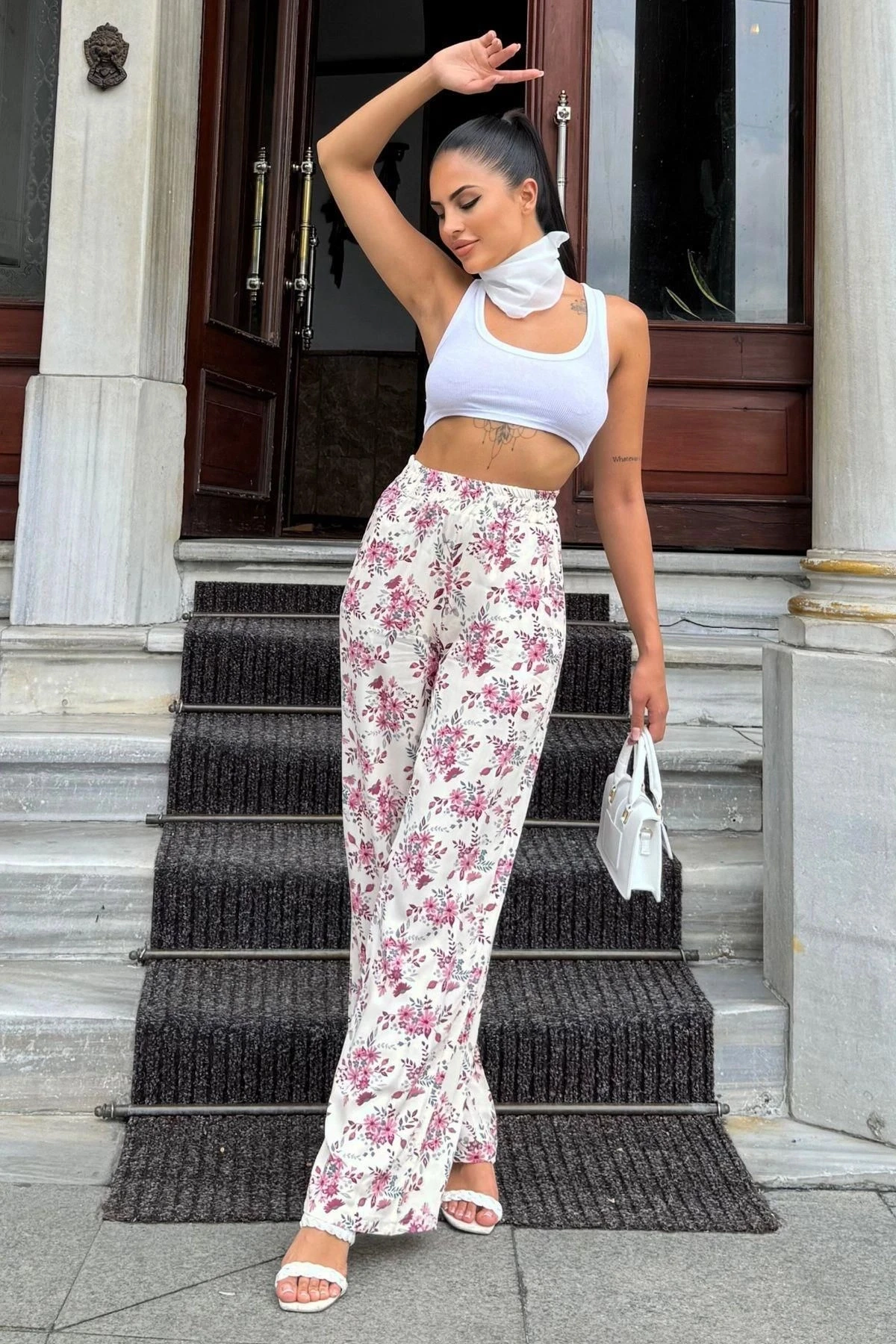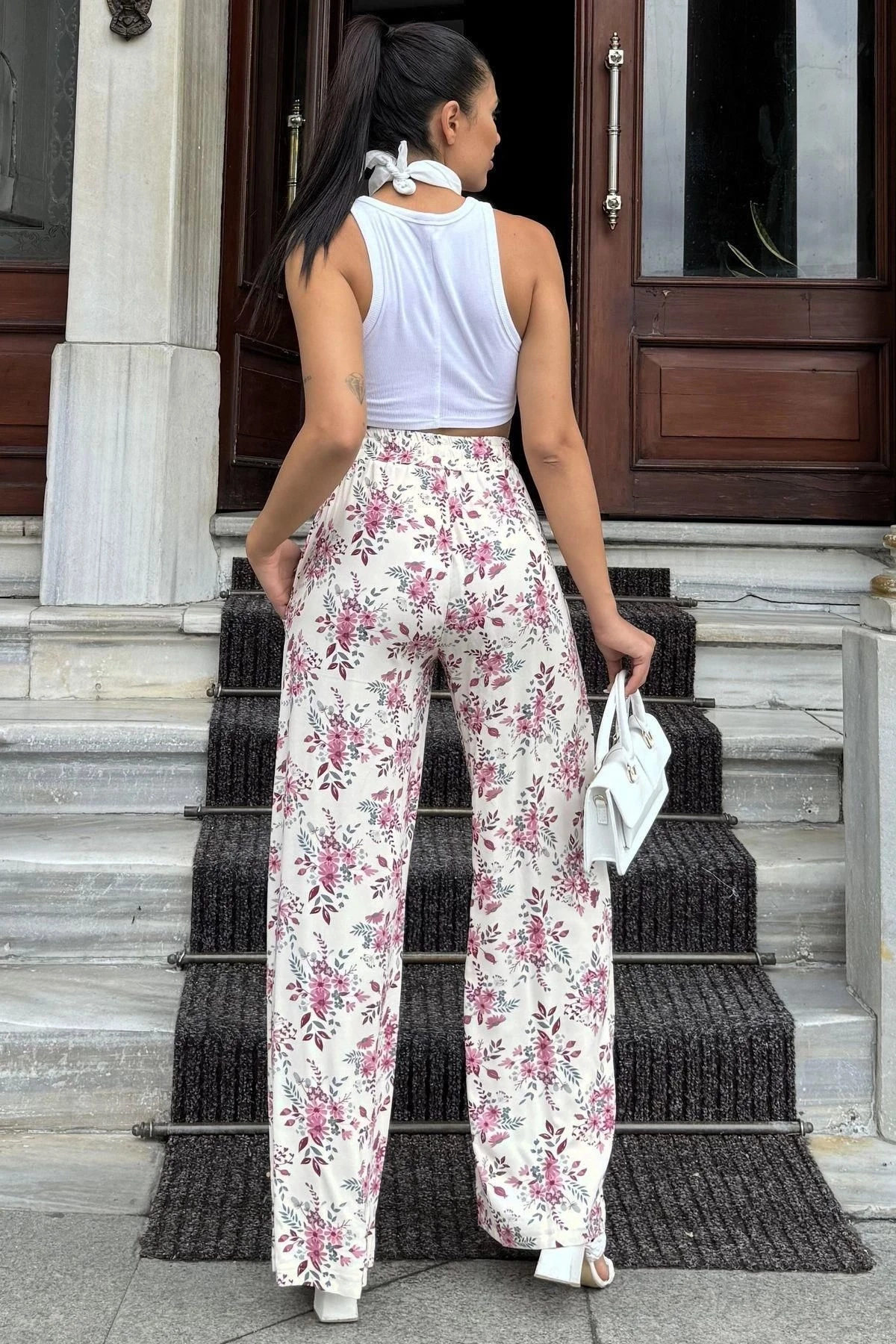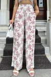 Kadın Gül Kurusu & Ekru Çiçek Desenli, Yüksek Bel, Geniş Paça, Rahat Kesim Pantolon