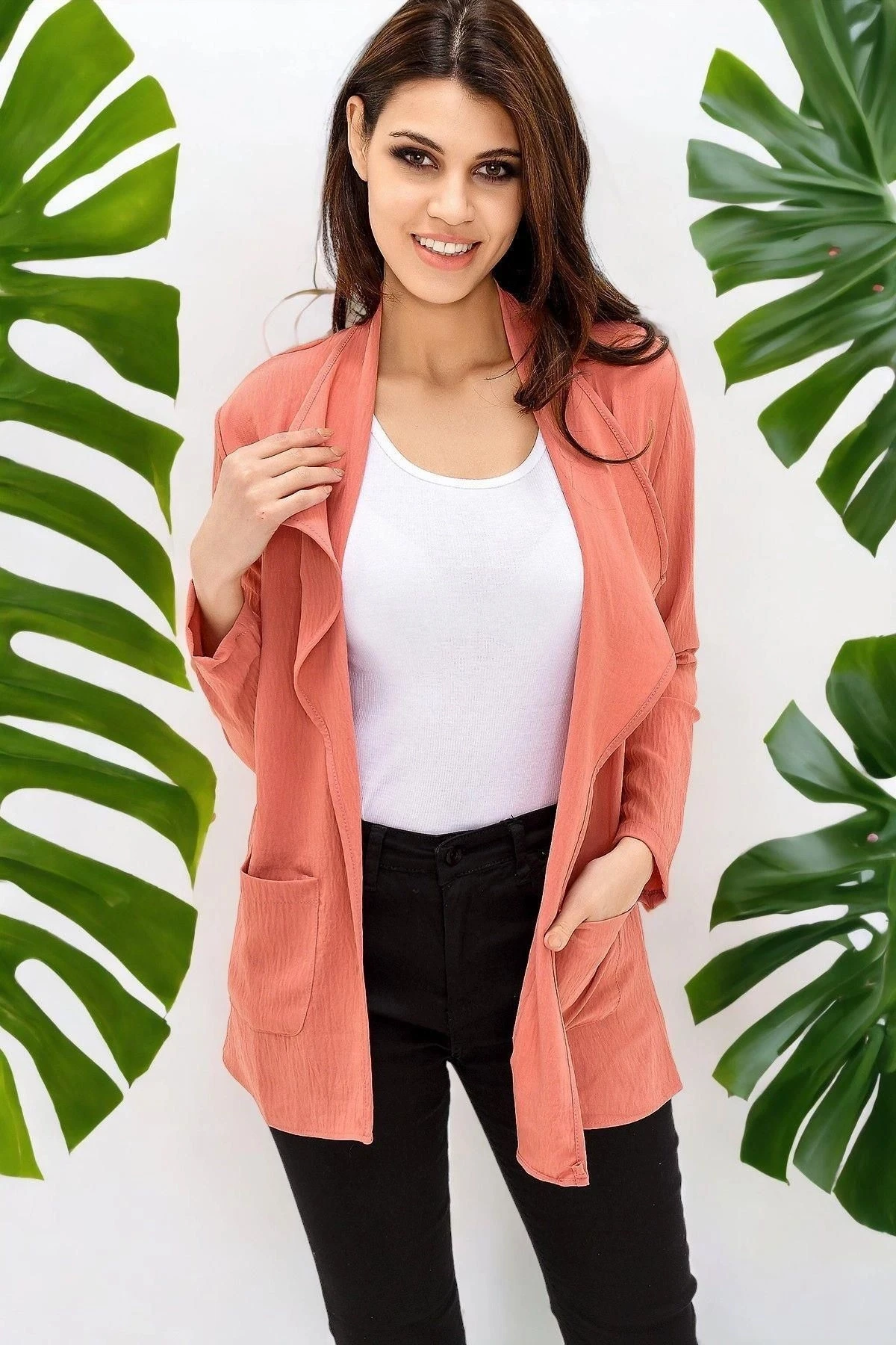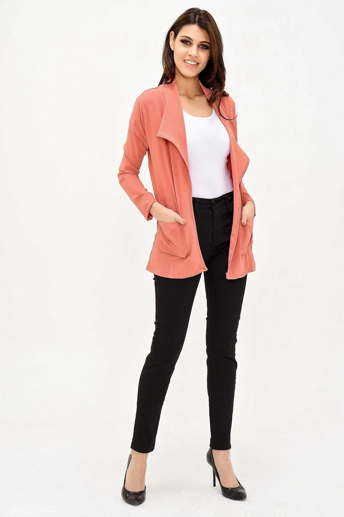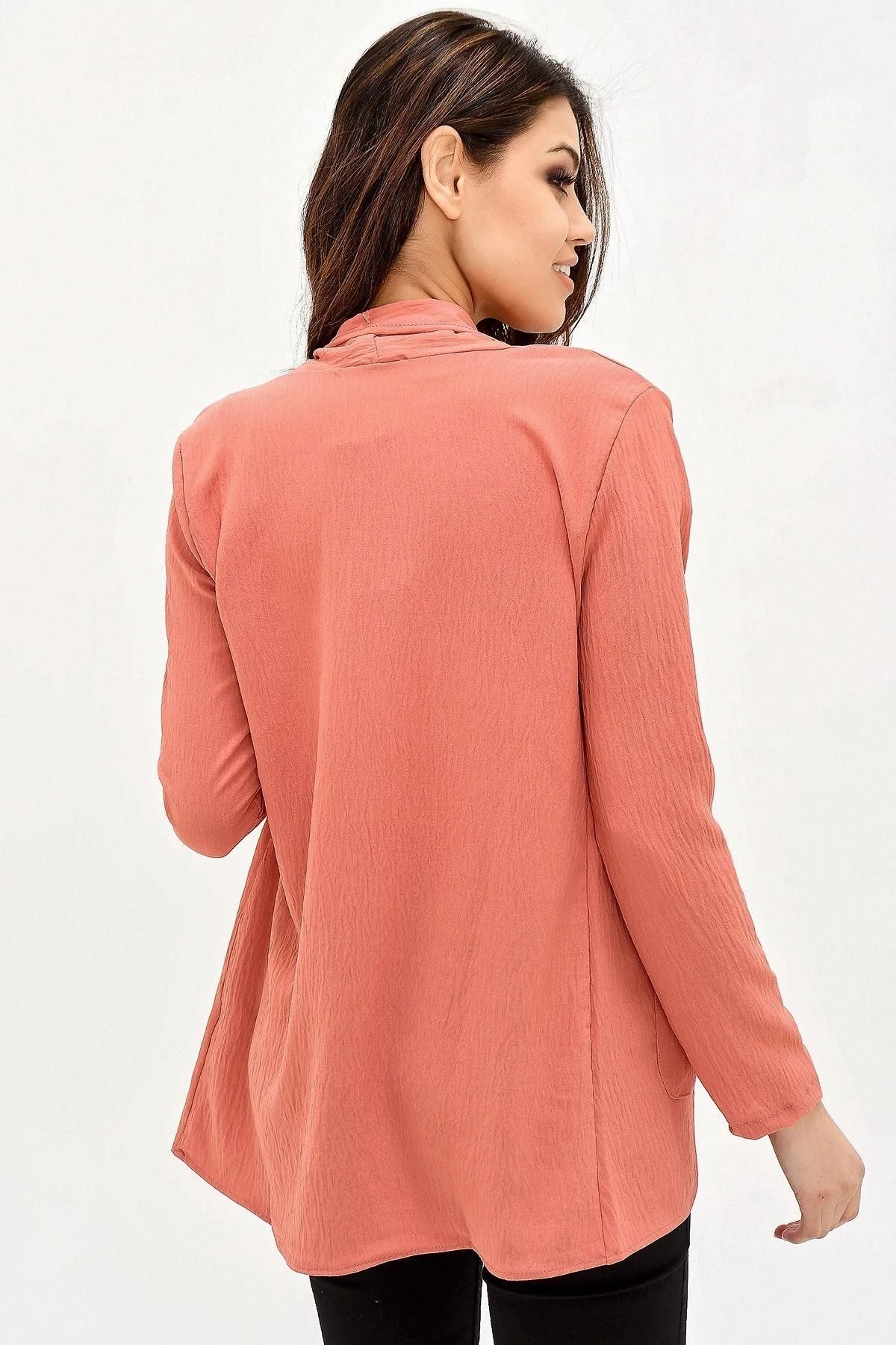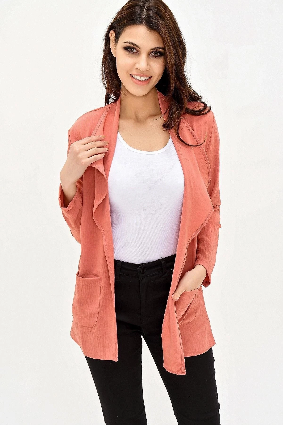 Kadın Gül Kurusu Şal Yaka, Uzun Kol Cep Detaylı, Regular Kesim Ceket Standart Boy - Tesettüre Uygun