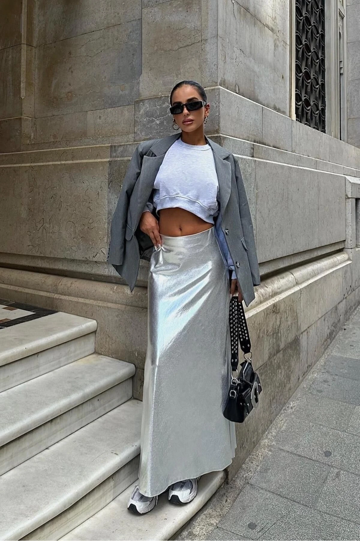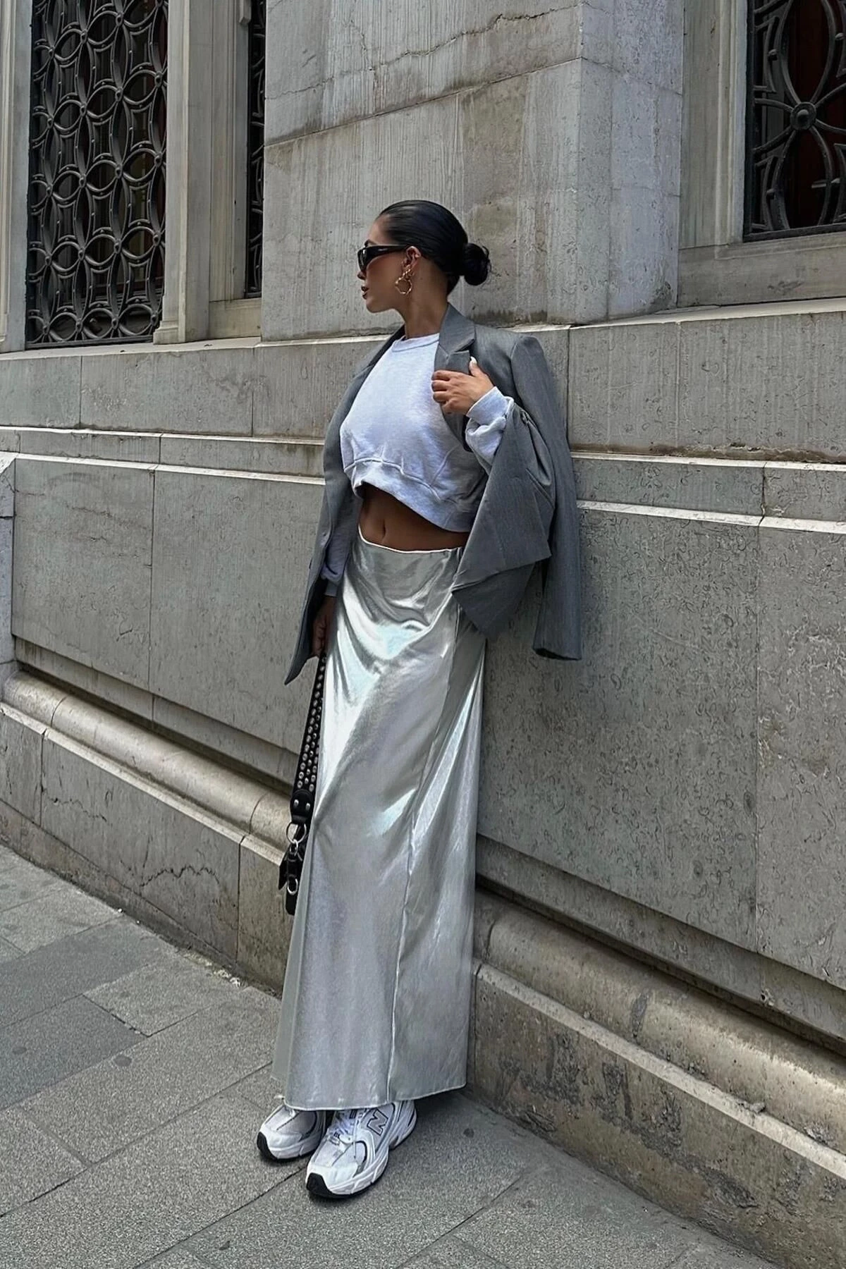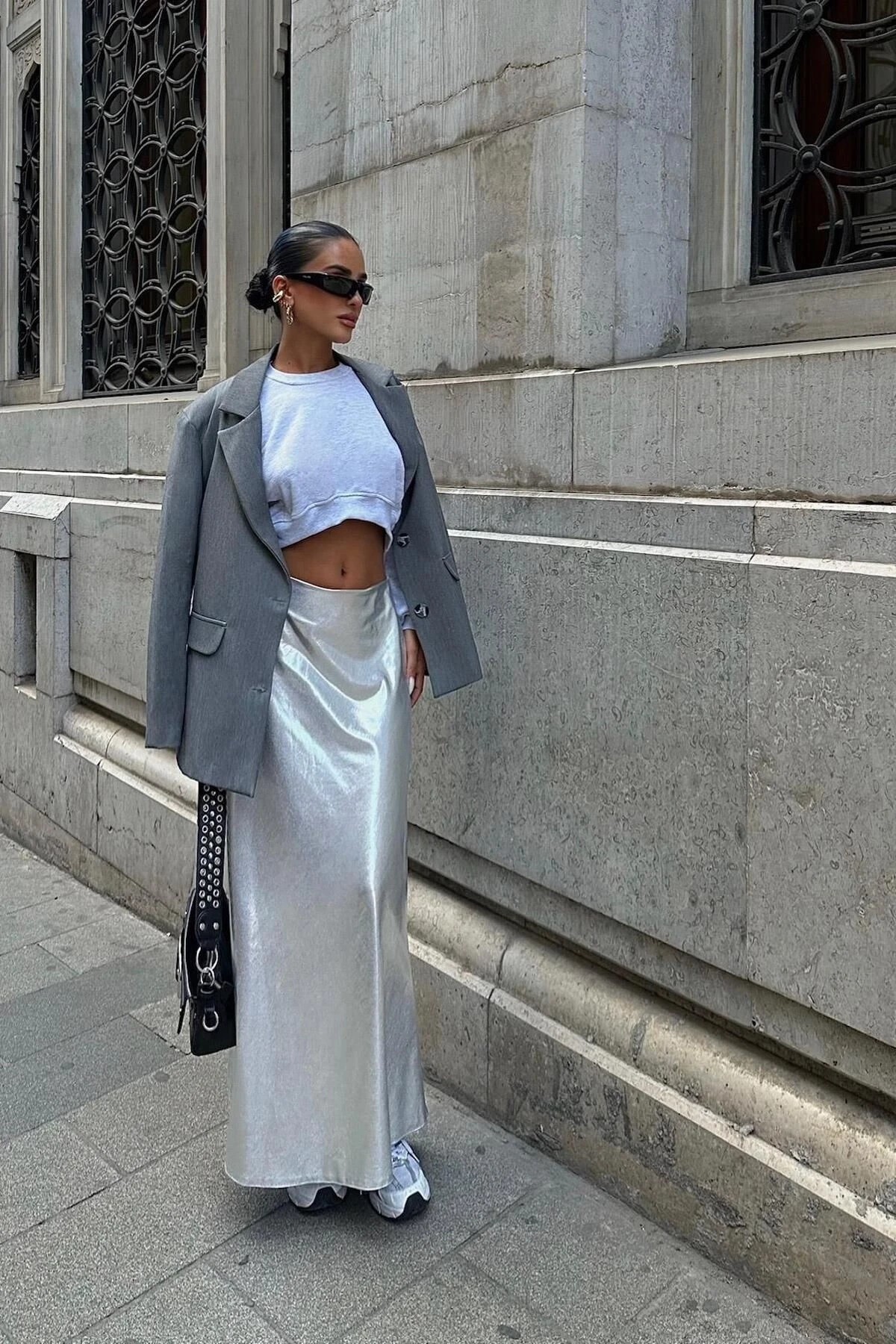 Kadın Gümüş Dokuma Düz Midi Polyester Etek