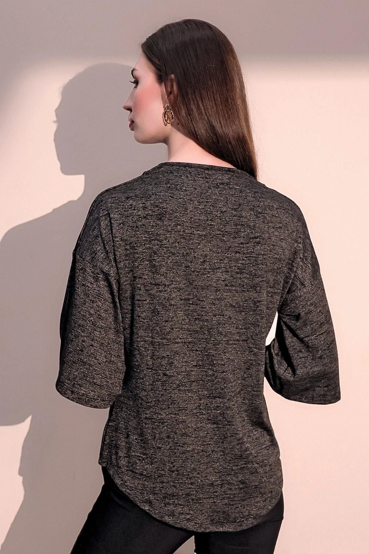 Bu muhteşem bluz, şıklığı ve rahatlığı bir araya getirerek size mükemmel bir stil sunuyor.; Haki antrasit rengi, her mevsimde ve her ortamda zarif bir görünüm sağlar.; V yaka tasarımı, feminen bir çekicilik katarken, sim detayları da bluza özgün ve sofistike bir dokunuş katar.; Oversize kesim, bluzun salaş ve modern bir tarza sahip olmasını sağlar.; Rahatlığı ve hareket özgürlüğü sunan bu kesim, gün boyu konforlu bir deneyim yaşamanızı sağlar.; Bluzun kumaşı %95 polyester ve %5 elastan içeriğiyle üretilmiştir.; Bu malzeme kombinasyonu, yumuşaklık ve esneklik sağlayarak mükemmel bir uyum ve dayanıklılık sunar.; Bu bluz, herhangi bir gardıropta çok yönlü bir parça olacak.; İster günlük hayatta ister özel bir etkinlikte kullanın, bu bluzla her zaman şık ve kendinden emin görüneceksiniz.; Üstün kalıp ve tasarımıyla bu bluz, tarzınıza sofistike bir dokunuş katacak ve sizi özel hissettirecektir.; Haki antrasit renk, sim detaylar, oversize kesim ve şık V yaka tasarımıyla bu bluz, gardırobunuzun vazgeçilmez bir parçası olacak.; Üstelik, %95 polyester ve %5 elastan içeriği sayesinde uzun ömürlü ve kolay bakımlıdır.; Bu bluzu tercih ederek tarzınızı yansıtın ve şıklığınızı ön plana çıkarın.