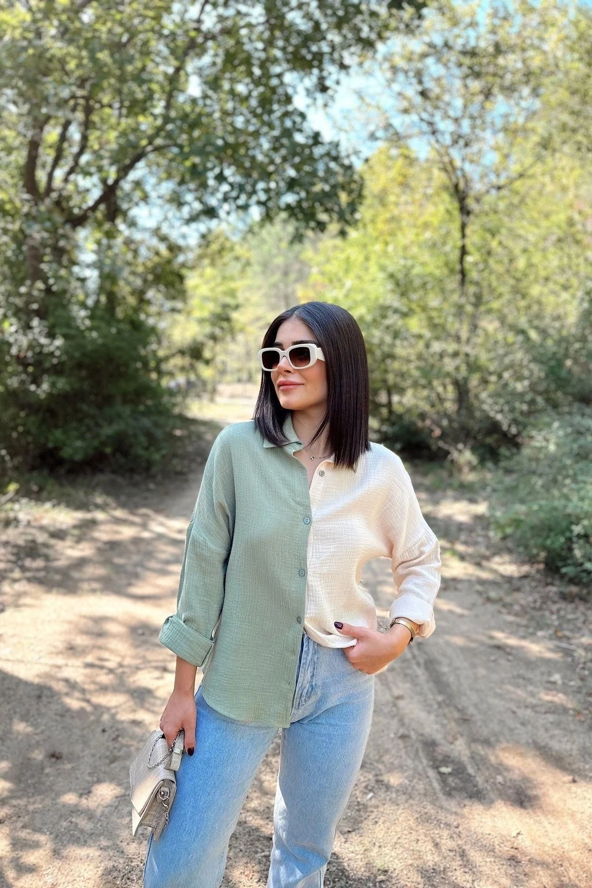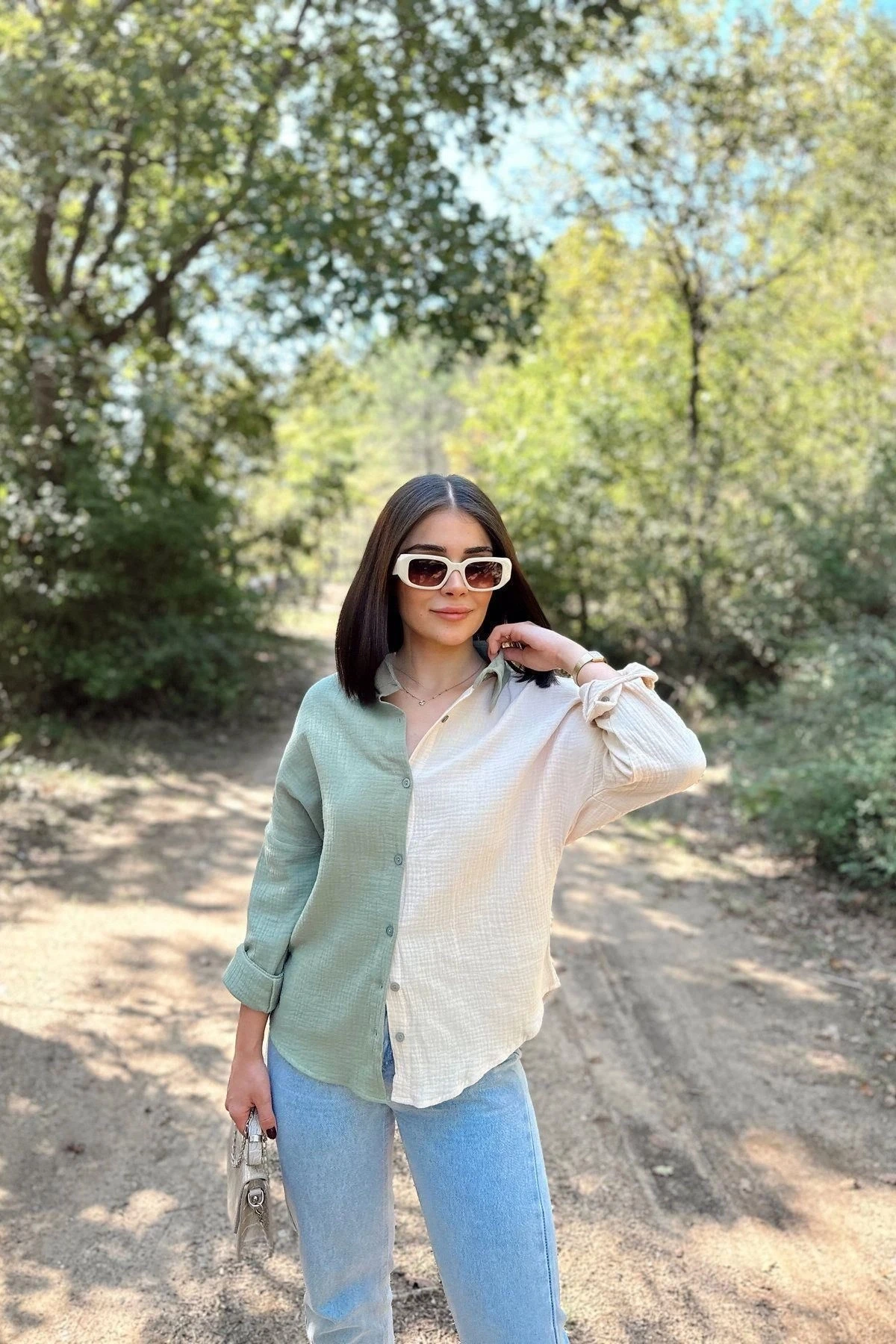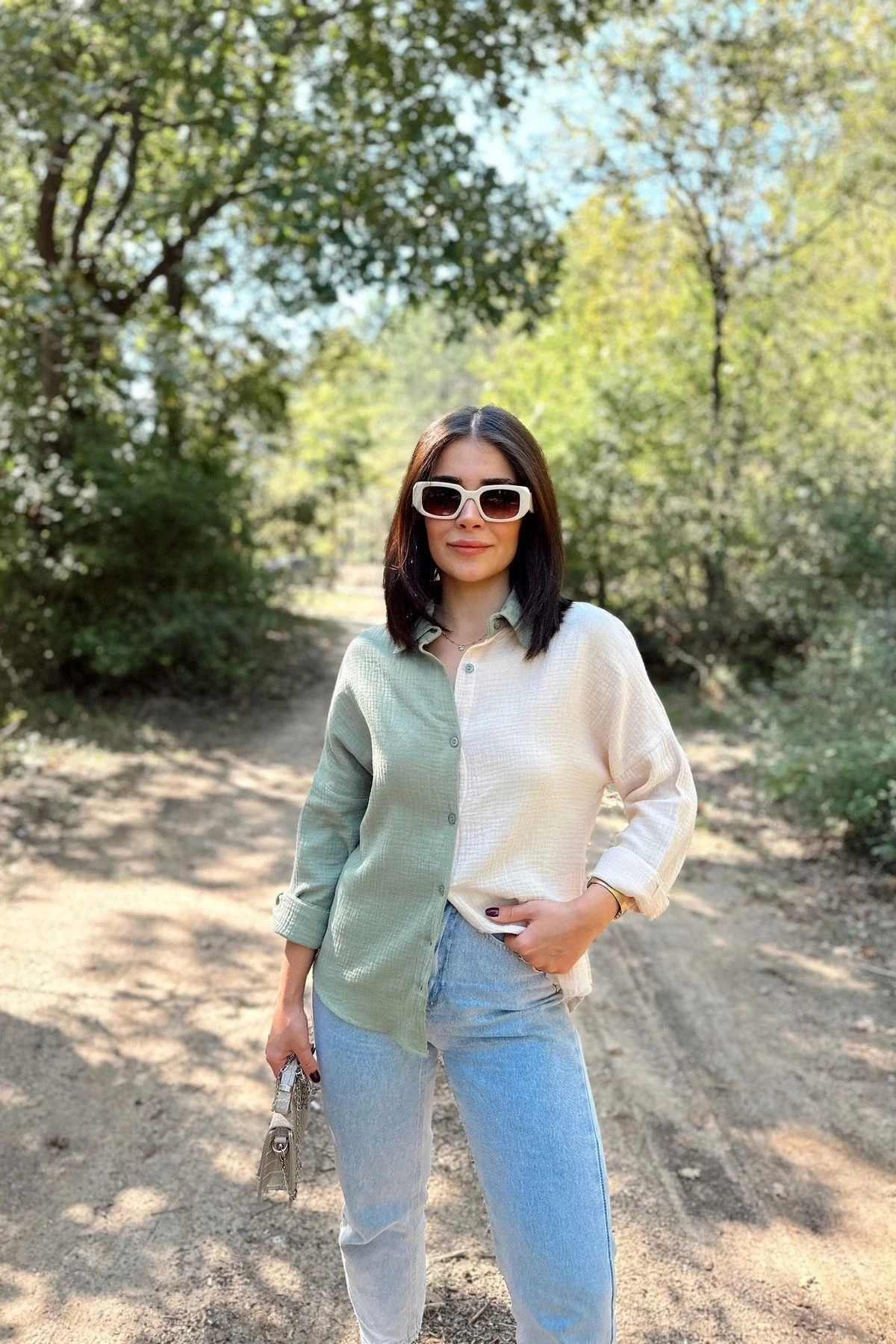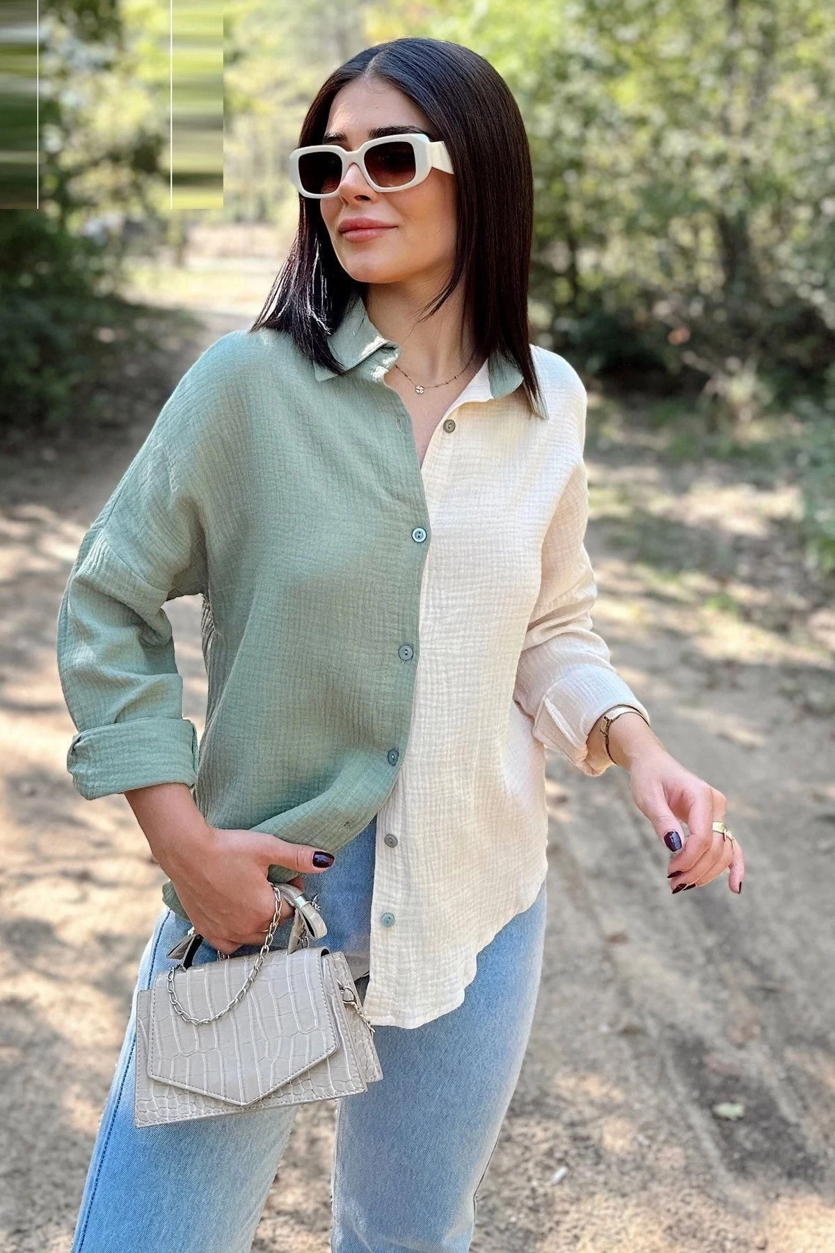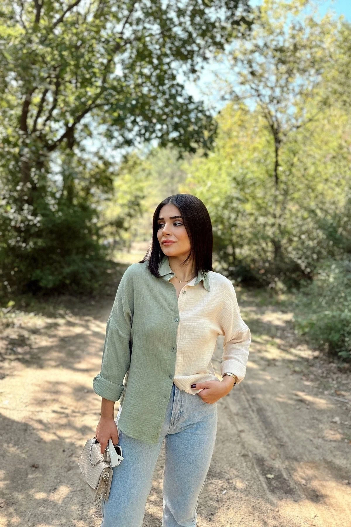 Kadın Haki & Bej Muslin Kumaş, Çift Bloklu, Eteği Oval, Uzun Kol, Regular Kesim Gömlek