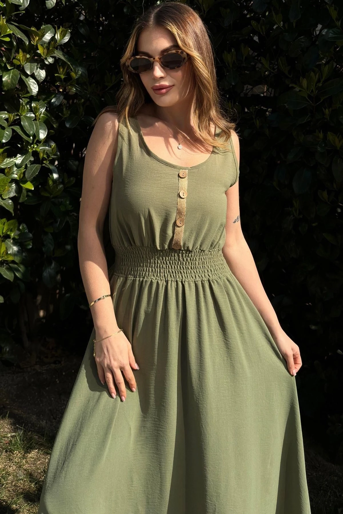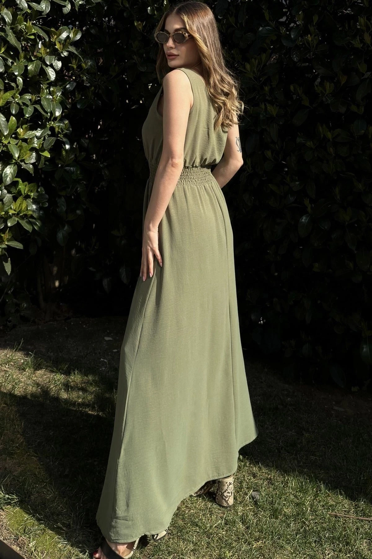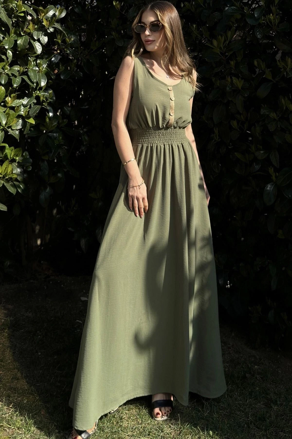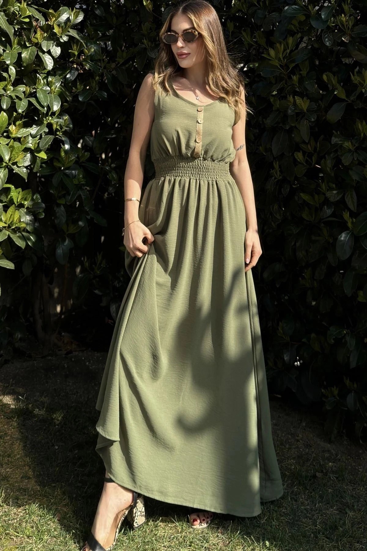 Kadın Haki Beli Gipeli, Askılı, Salaş Kesim, Airobin Uzun Elbise