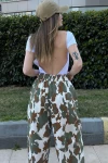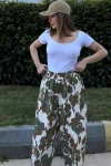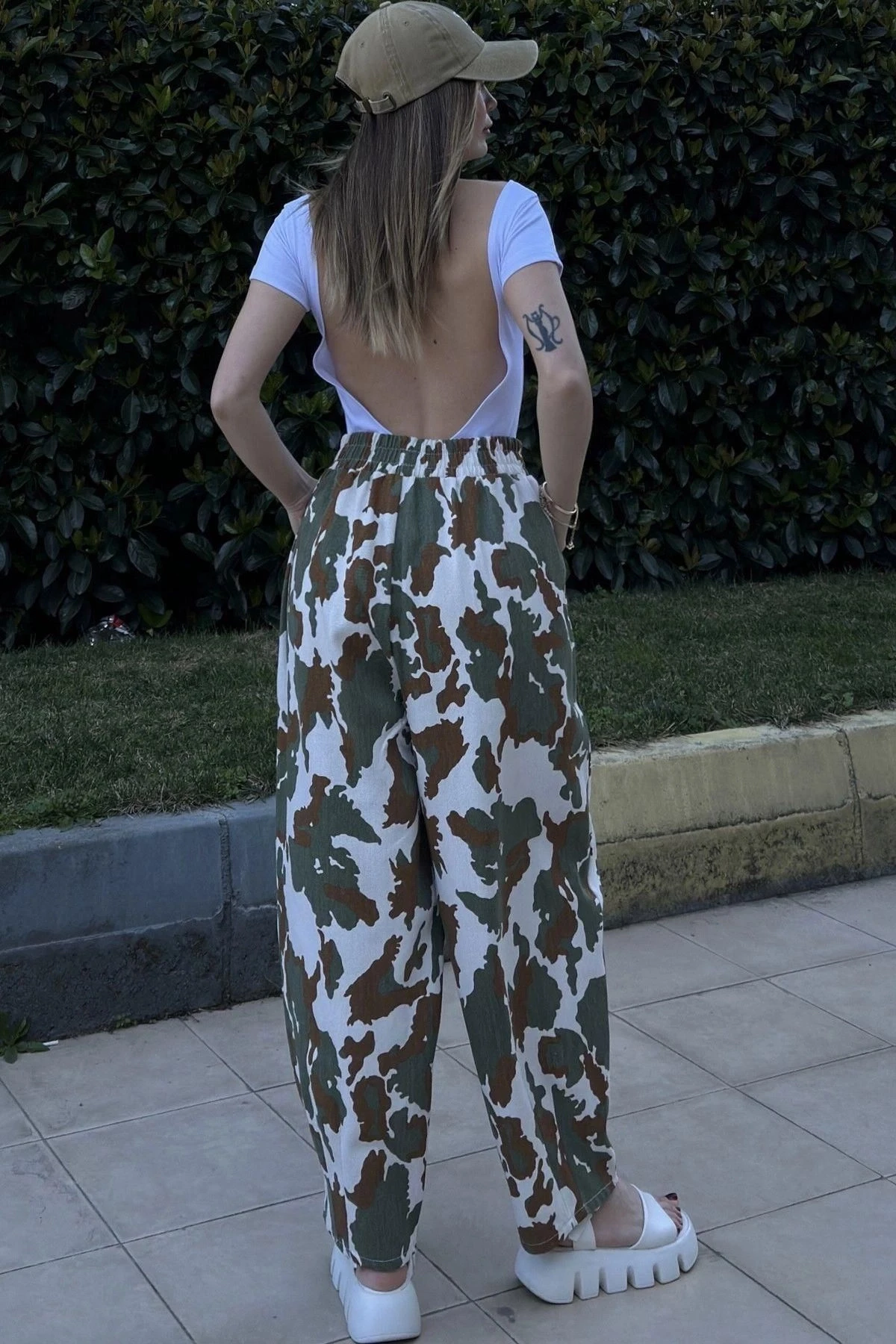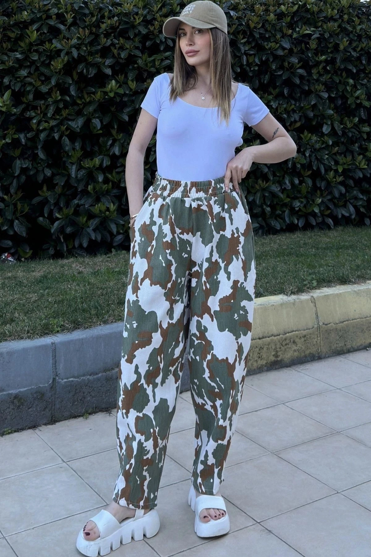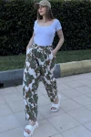Kadın Haki Beli Lastikli, Cepli, Desenli Gabardin Kumaş, Salaş Pantolon