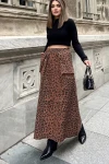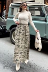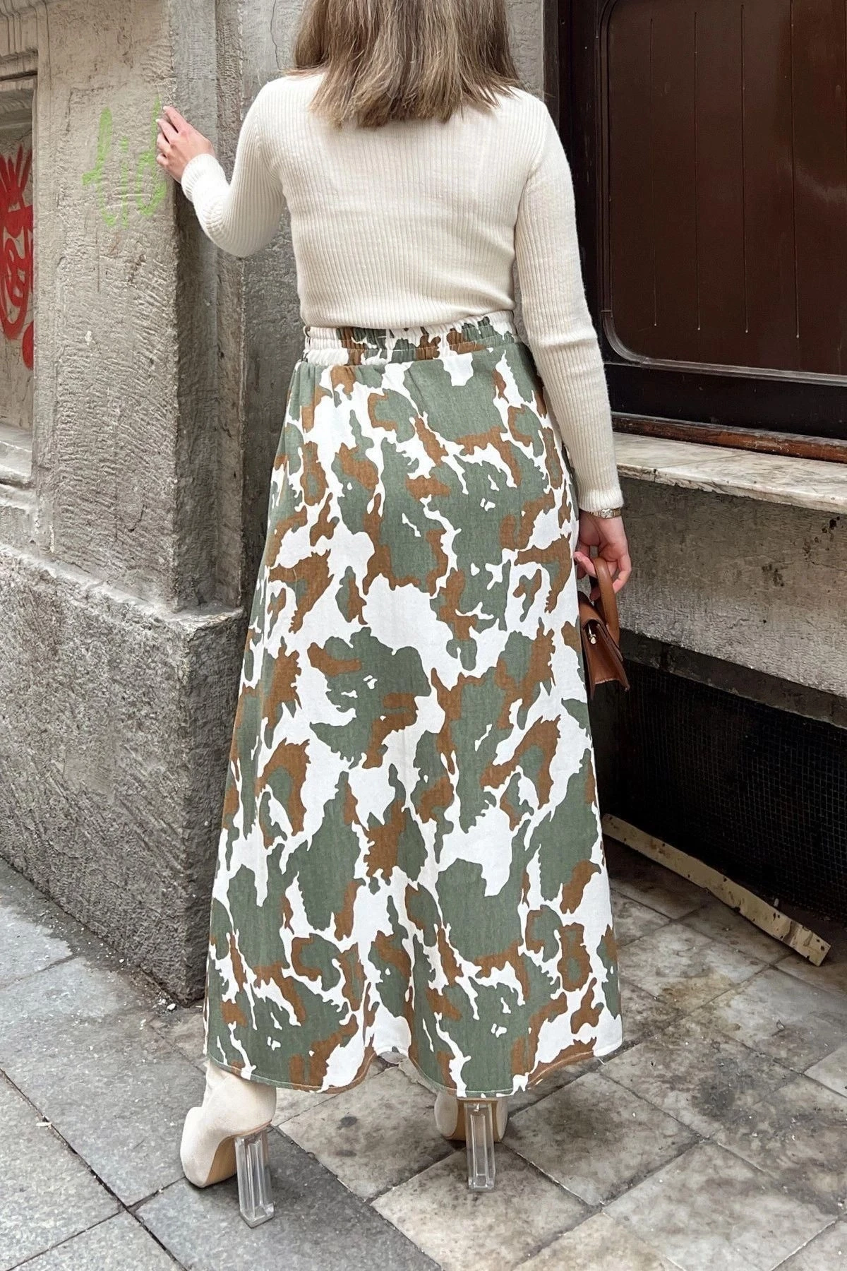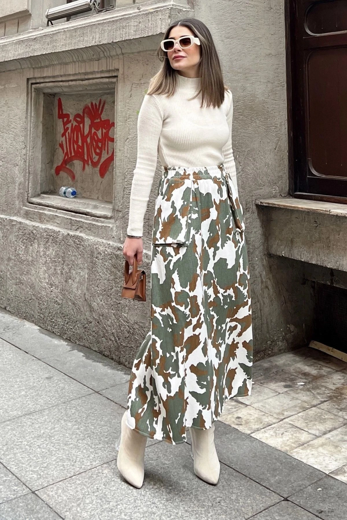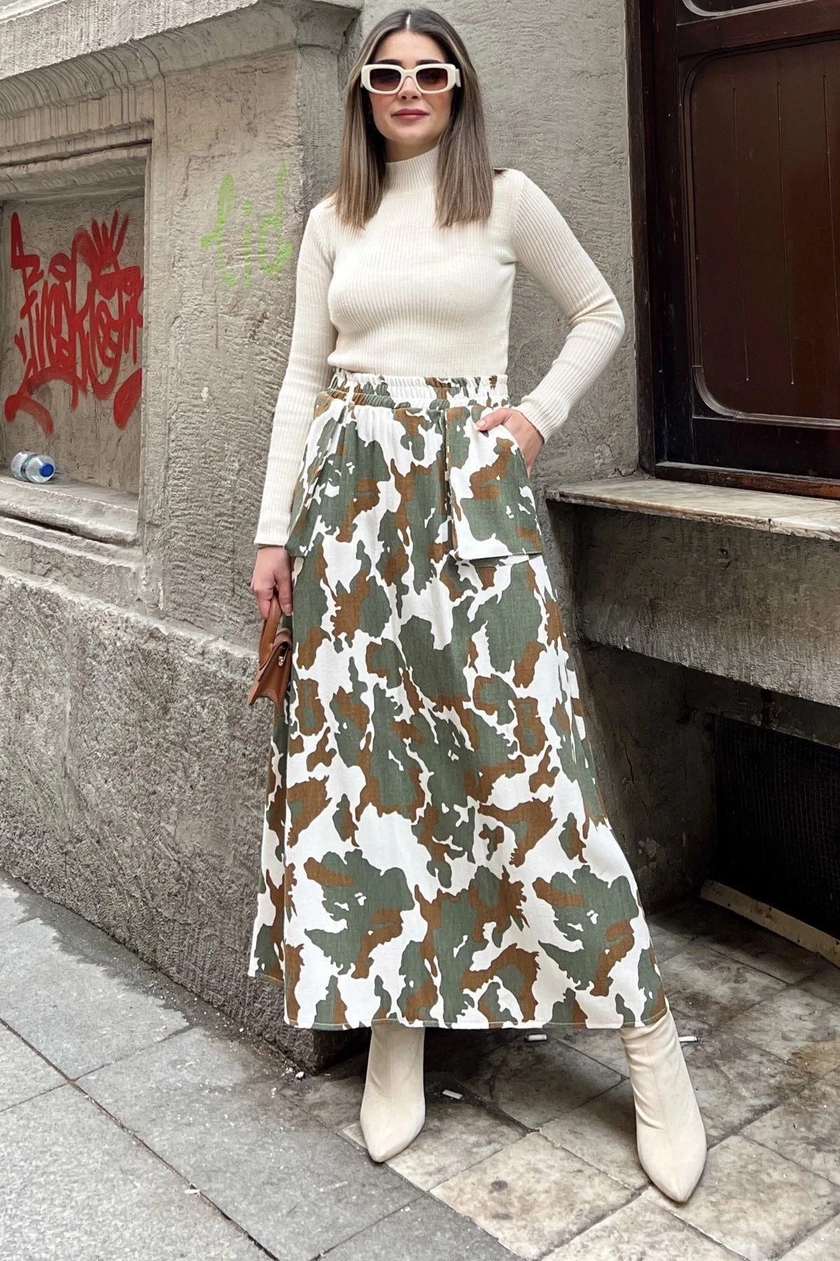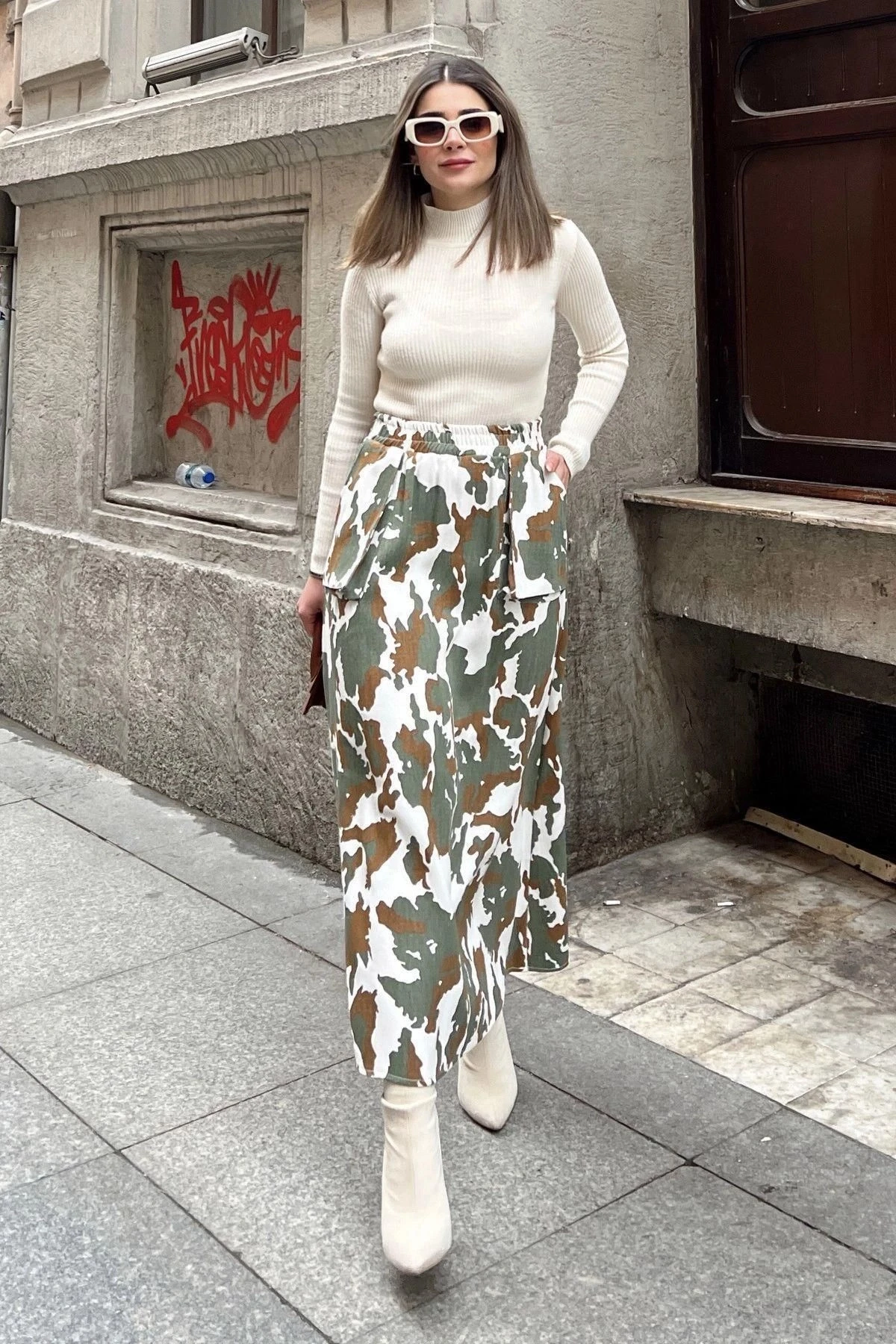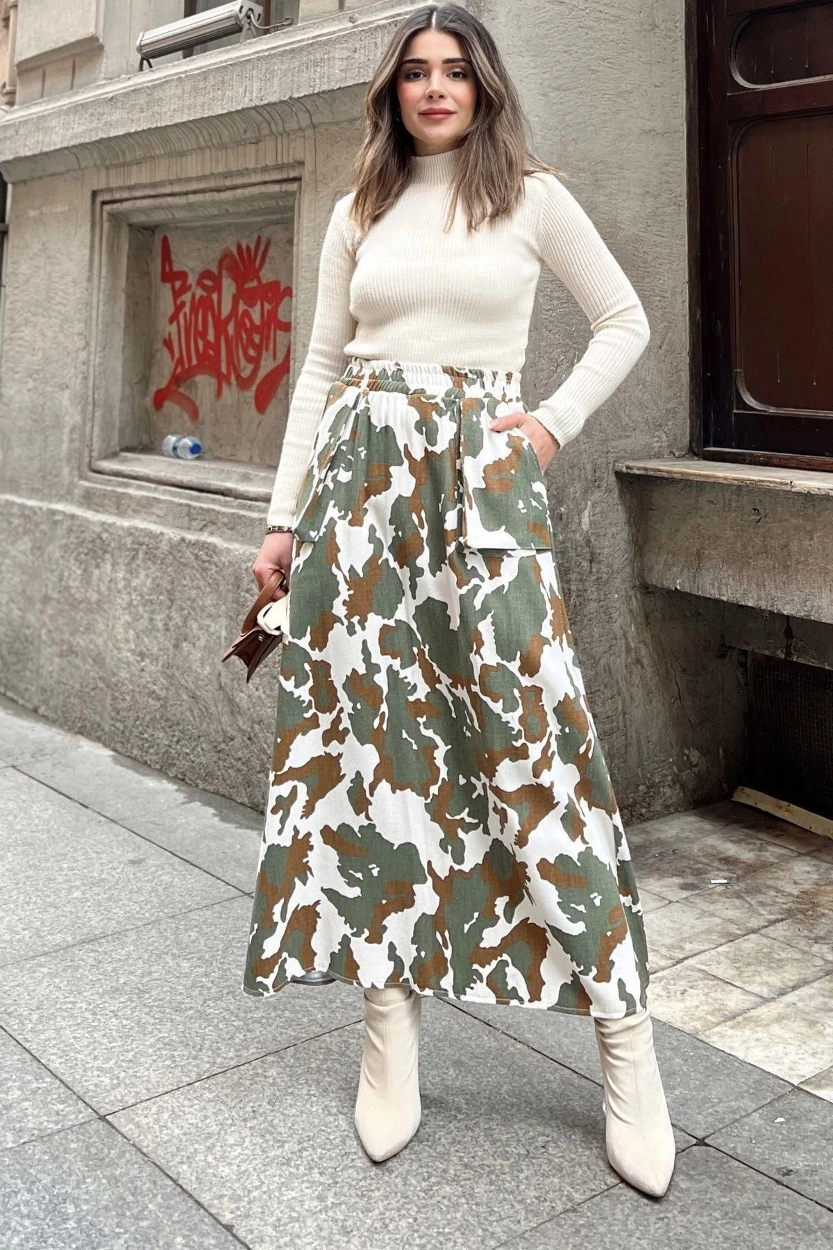 Kadın haki Beli Lastikli, Kargo Cepli, Rahat, Uzun Gabardin Kiloş Etek