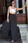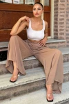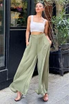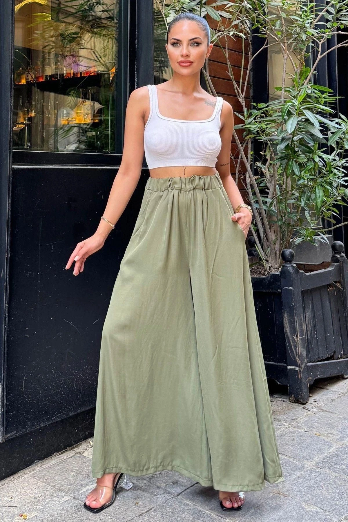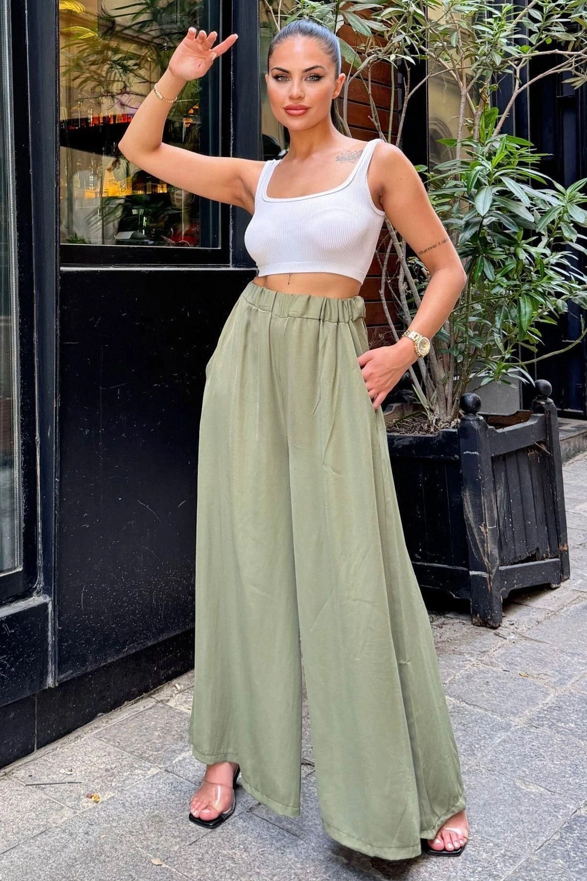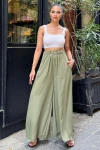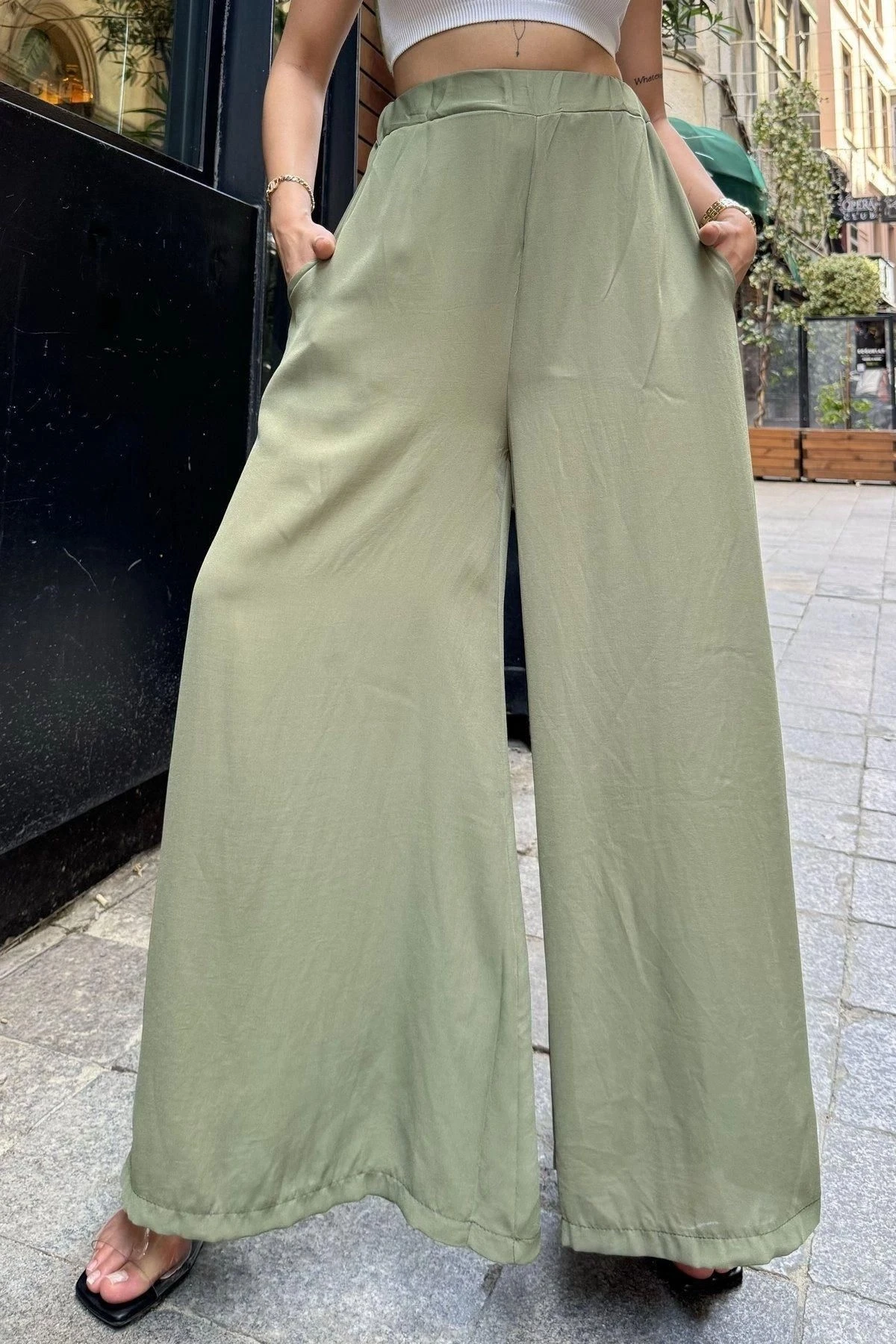 Kadın Haki Beli Lastikli,Cepli, Bol Paça, Salaş Krep Pantolon - Tesettüre Uygun