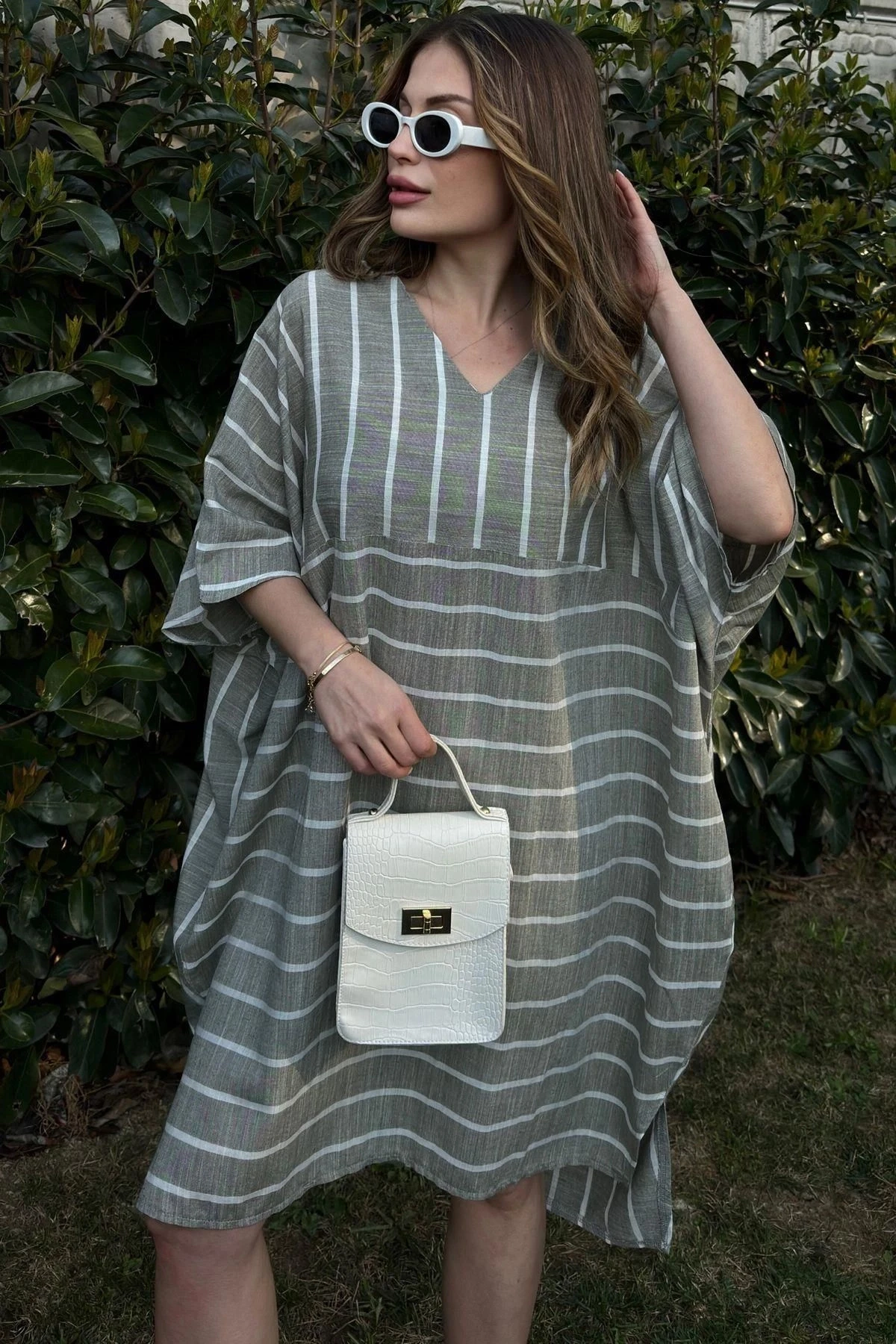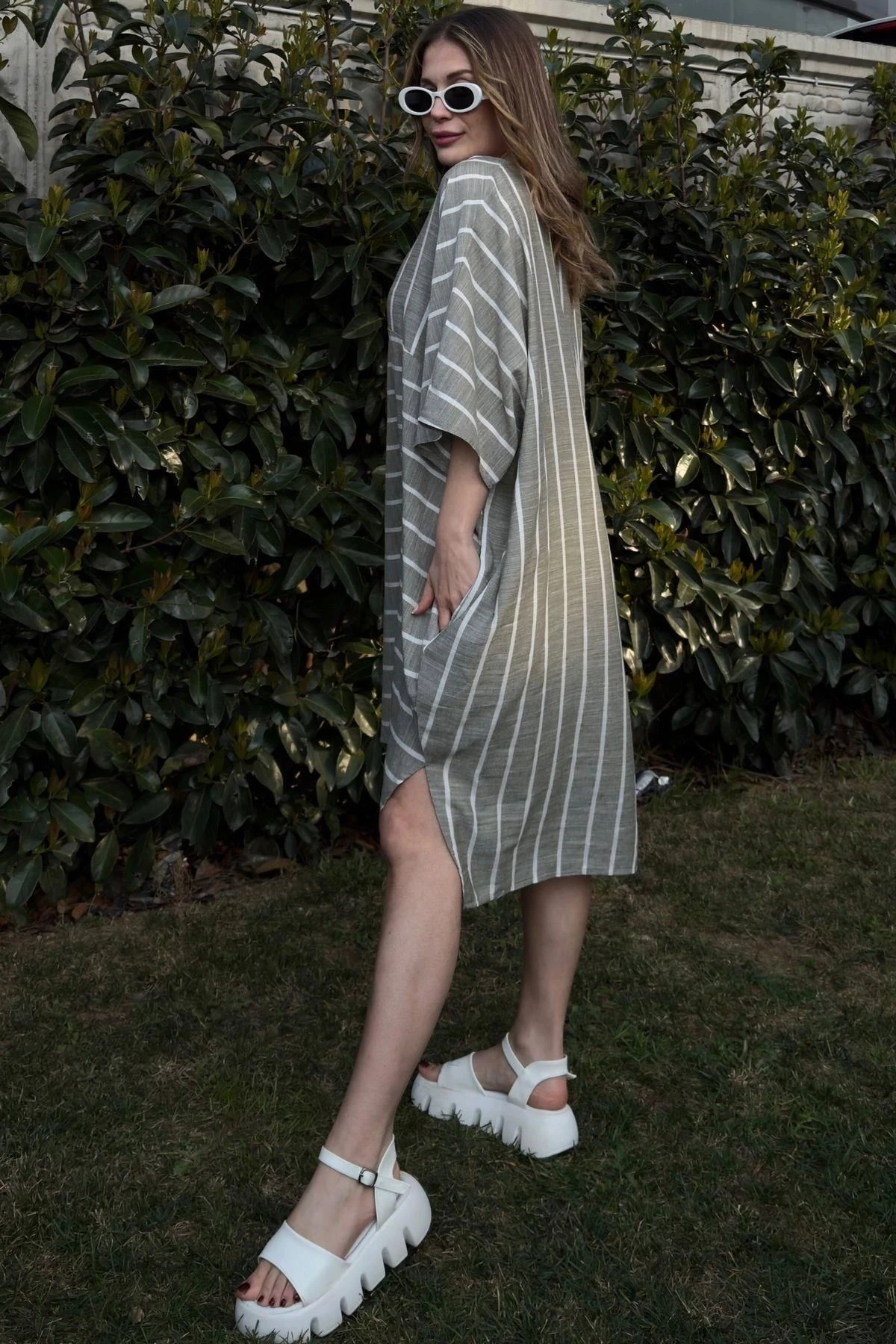 Kadın Haki Çizgili Keten, Yarım Kol, V Yaka, Cepli, Salaş Midi Elbise