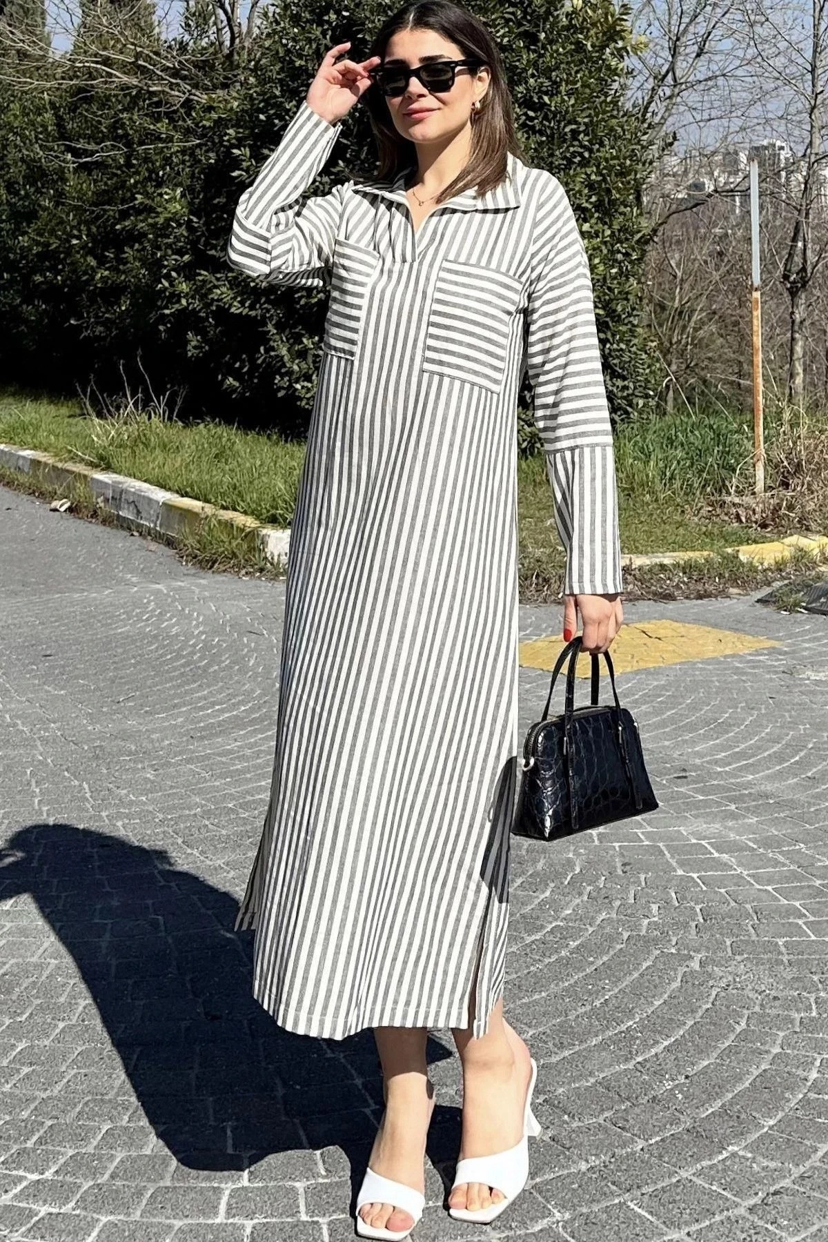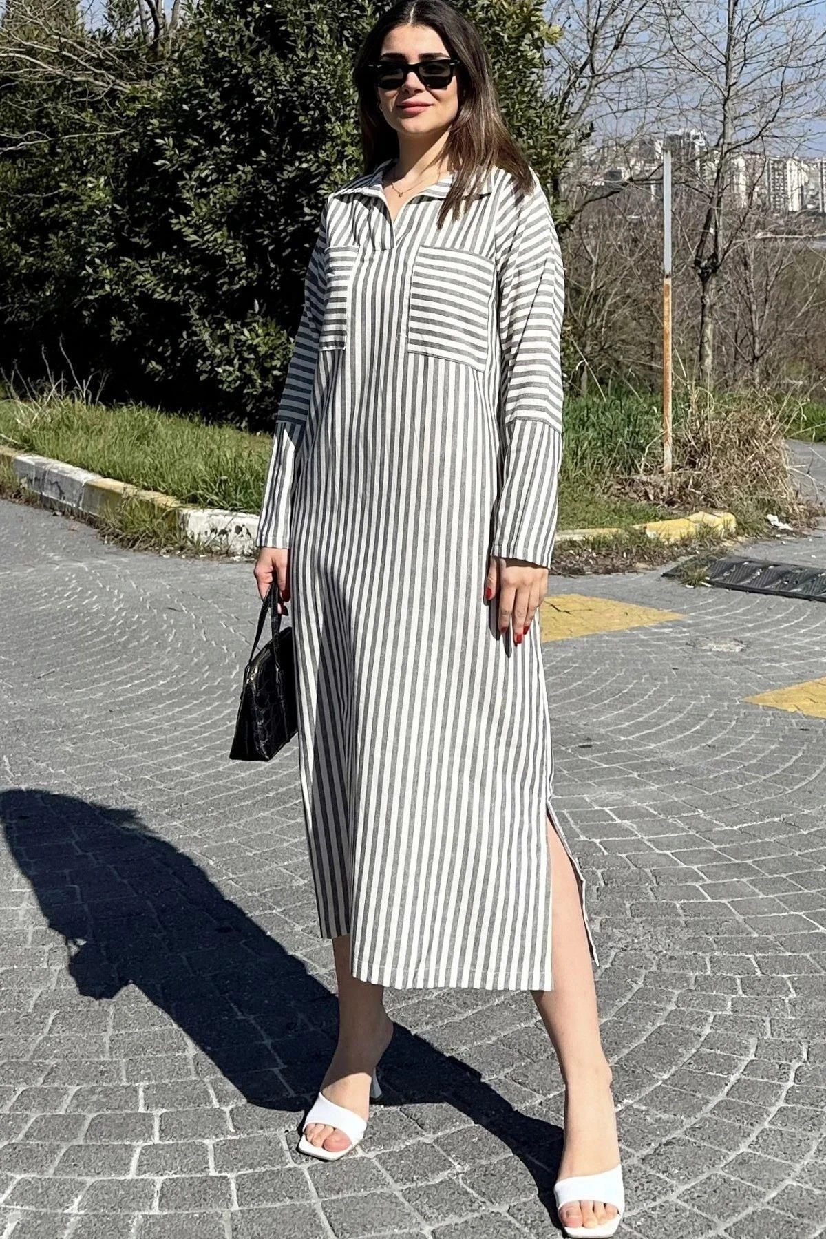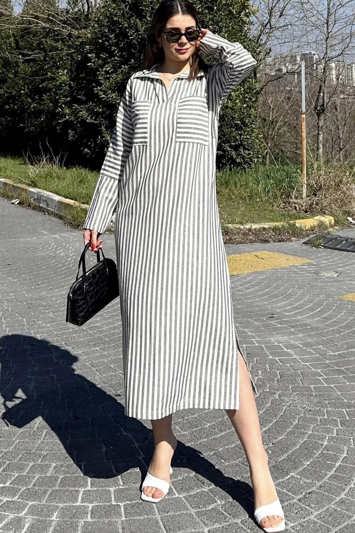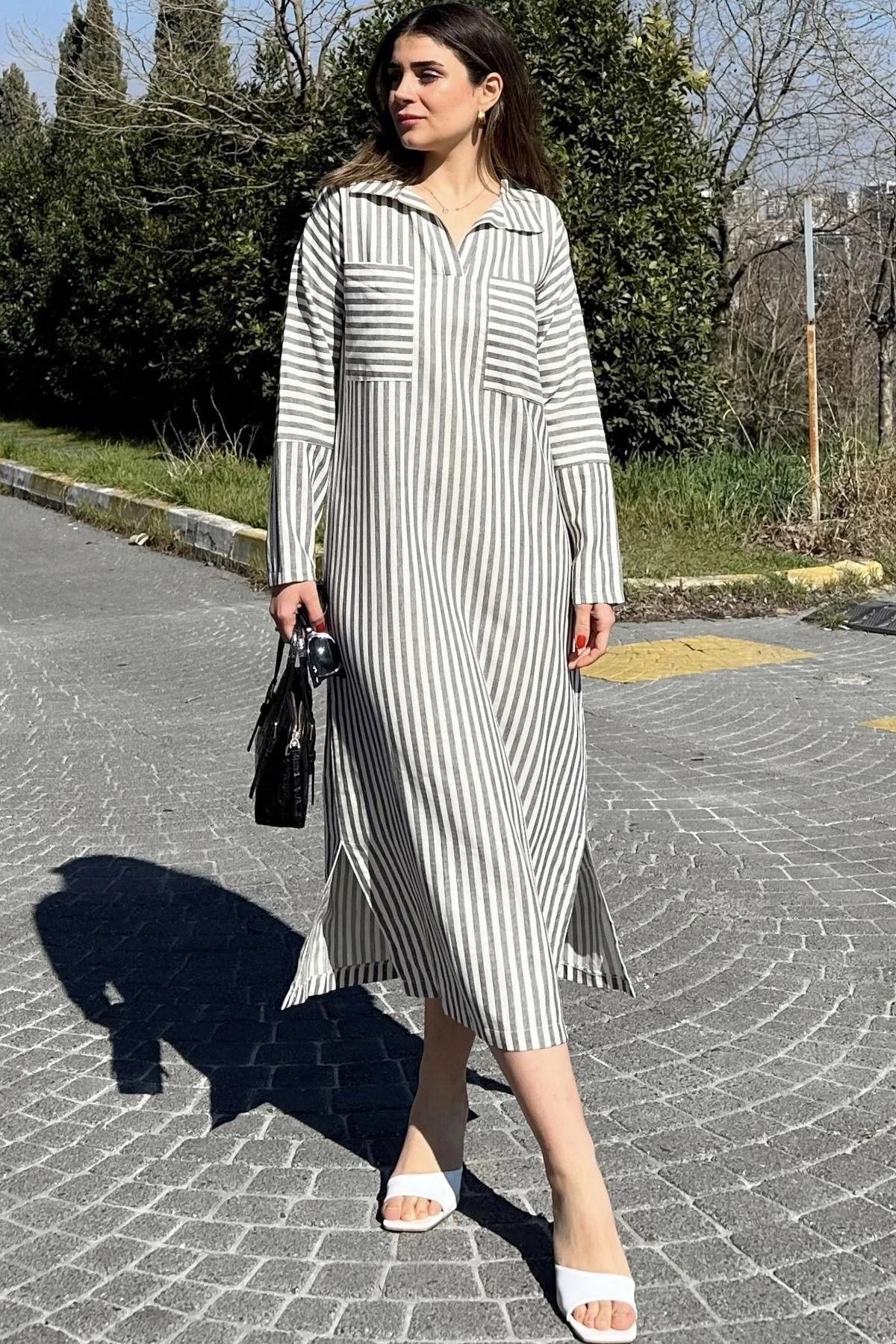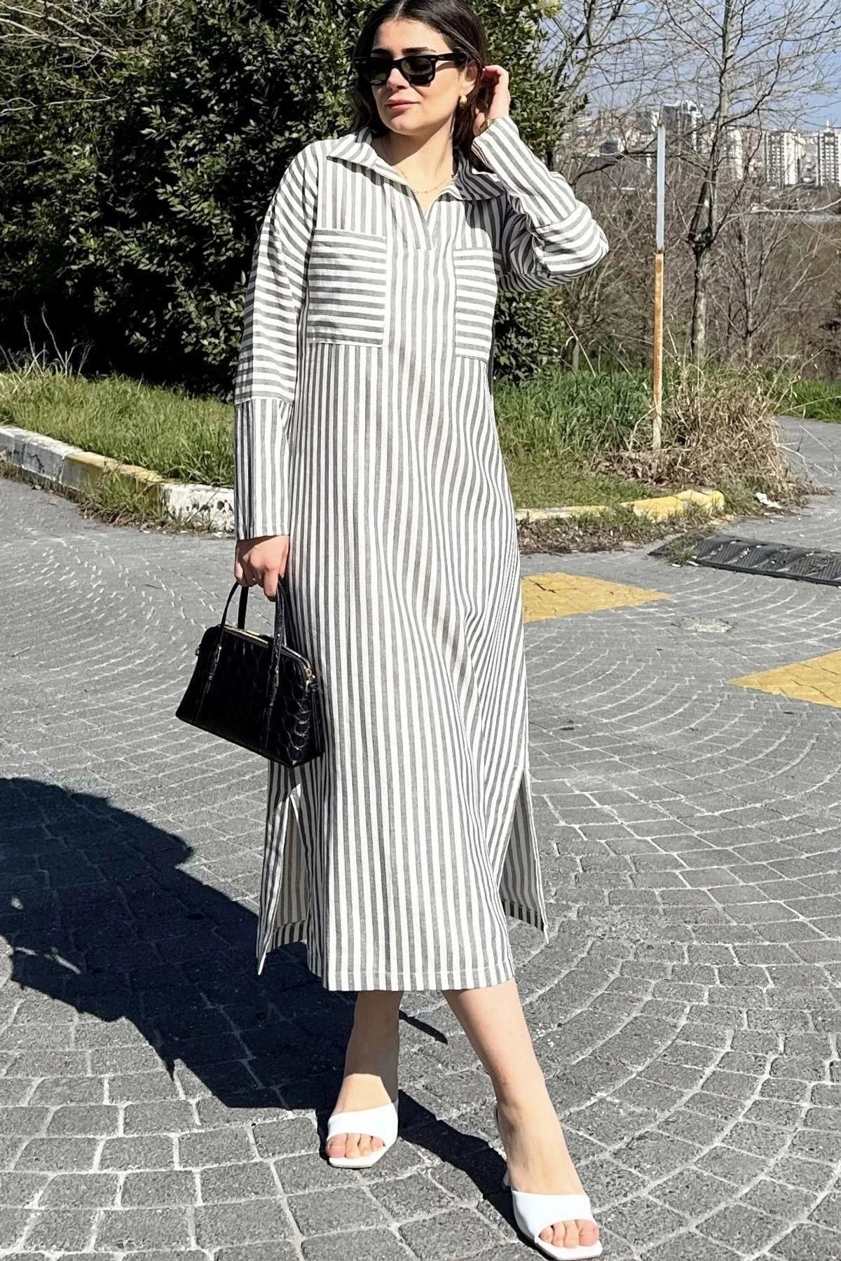 Kadın Haki Çizgili, Polo Yaka, Yırtmaçlı, Çift Cepli, Salaş Keten Elbise