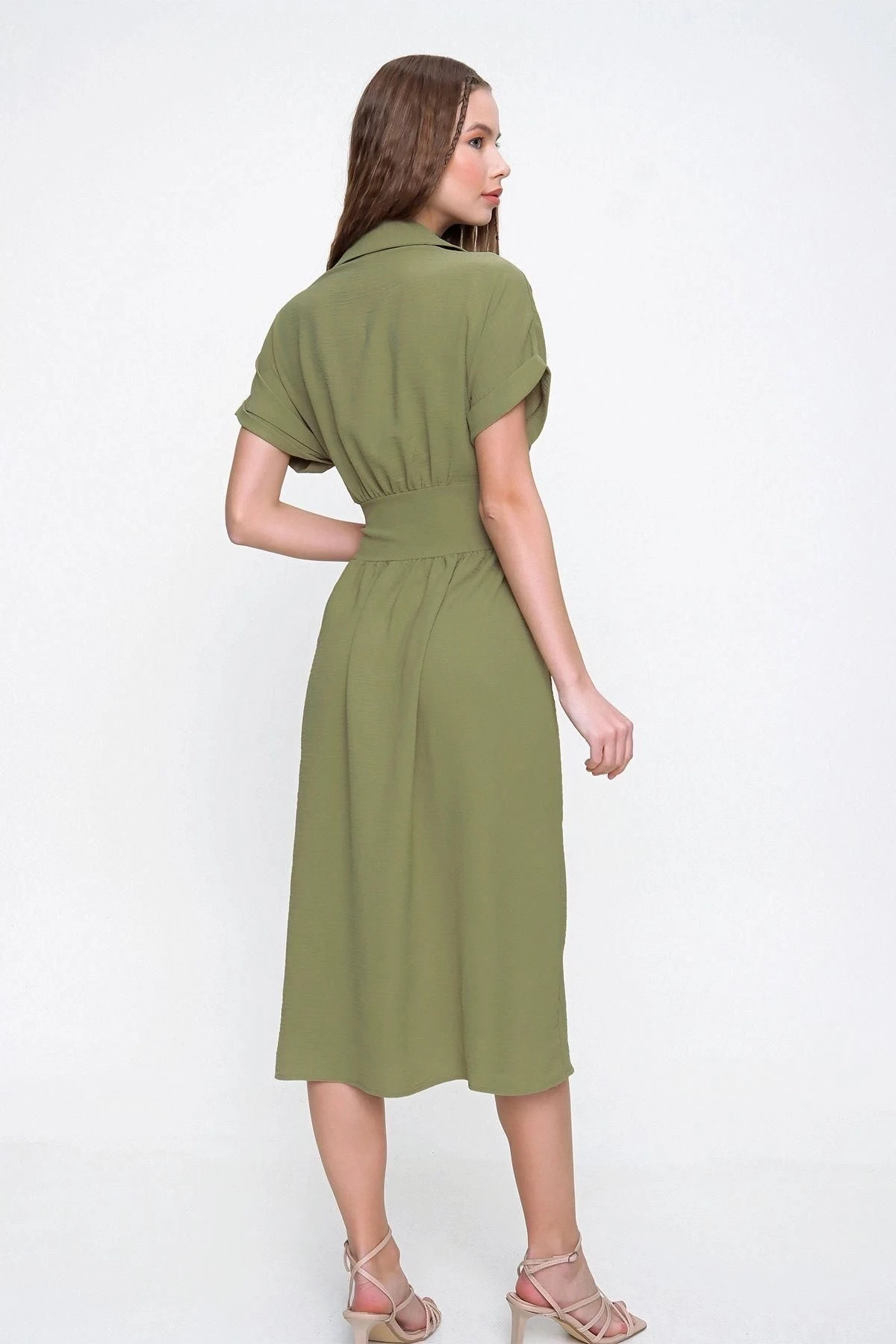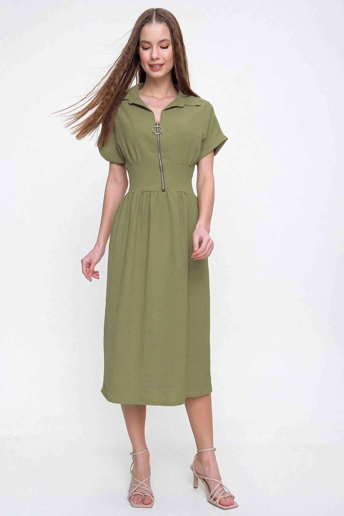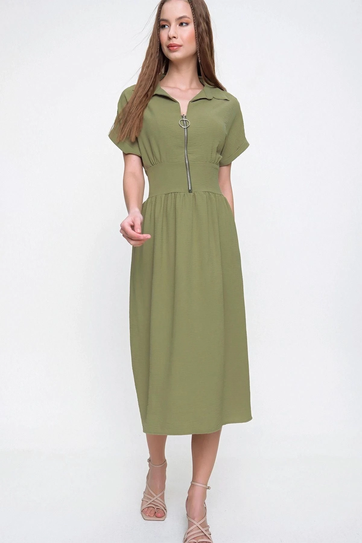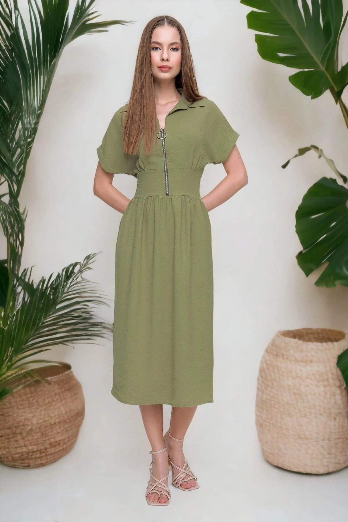 Bu Haki Renk Fermuarlı Beli Büzgülü Airobin Elbise, hem şık hem de rahat bir seçimdir.; Ürün, yüksek kaliteli kumaş kullanılarak özenle tasarlanmıştır.; %60 Polyester ve %40 Cotton içeriği sayesinde, kumaşın dayanıklılığı ve nefes alabilirlik özellikleri bir araya gelmiştir.; Elbisenin haki rengi, zamansız bir şıklık sunar.; Bu renk, her mevsimde ve her durumda giyilebilecek bir seçenek olup, gardırobunuzun vazgeçilmez parçası olmaya adaydır.; Fermuarlı tasarımı, kolay giyilip çıkarılabilirlik sağlarken, beli büzgülü detayıyla da vücut hatlarınızı hoş bir şekilde vurgular.; Bu özellik, zarafeti ve şıklığı bir arada sunarak size özgün bir tarz yaratma imkanı verir.; Elbisenin polo yaka tasarımı, modern ve sofistike bir hava katarken, düz kesimi ve maksi boyu sayesinde uzun ve zarif bir siluet oluşturur.; Hem günlük hayatta hem de özel etkinliklerde rahatlıkla tercih edebileceğiniz bir parça olduğunu söyleyebiliriz.; Kaliteli kumaşı, dayanıklılığı ve uzun ömürlü kullanımı garantiler.; Aynı zamanda kumaşın nefes alabilir özelliği, gün boyu rahat etmenizi sağlar.; Hem stil hem de konfor açısından sizi memnun edecek bir tercih olduğunu vurgulamak isteriz.; Bu Haki Renk Fermuarlı Beli Büzgülü Airobin Elbise, kusursuz bir tasarım ve yüksek kaliteyle bir araya gelerek size mükemmel bir stil sunuyor.; Her detayı düşünülmüş olan bu elbise, gardırobunuzun vazgeçilmezi olacak ve size her ortamda güvenle kullanabileceğiniz bir seçenek sunacak.