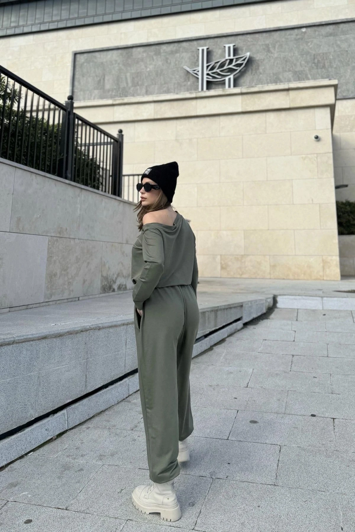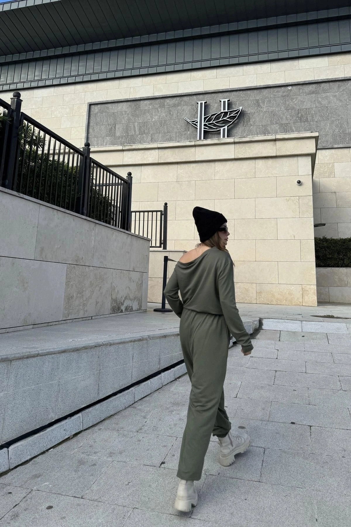 Kadın Haki Geniş Yaka, Beli Bağcıklı, Paçaları Lastikli Uzun Kol Salaş Tulum