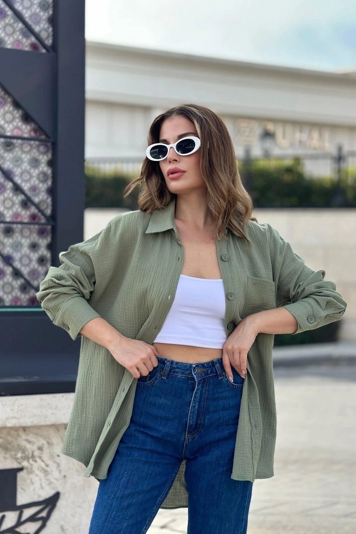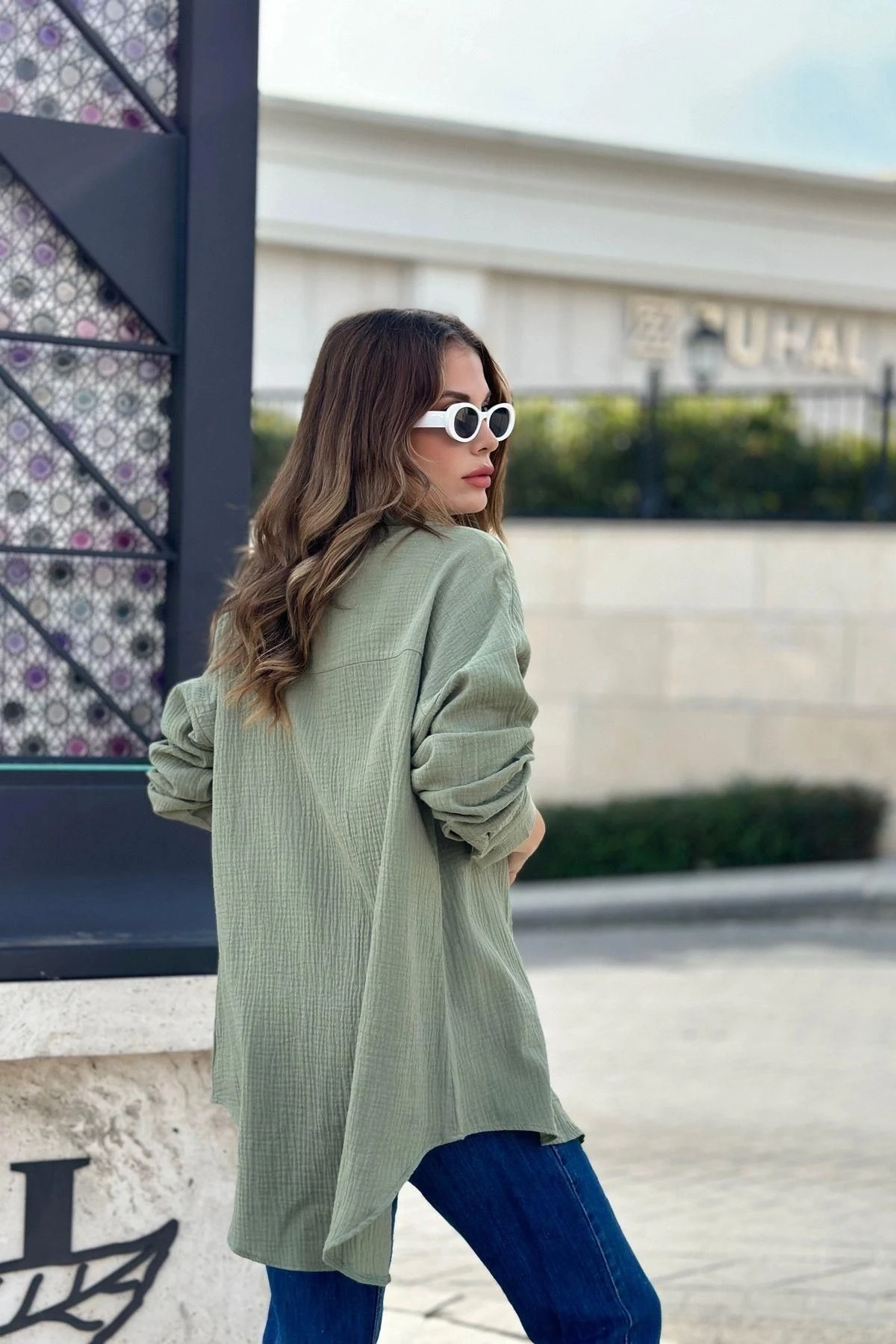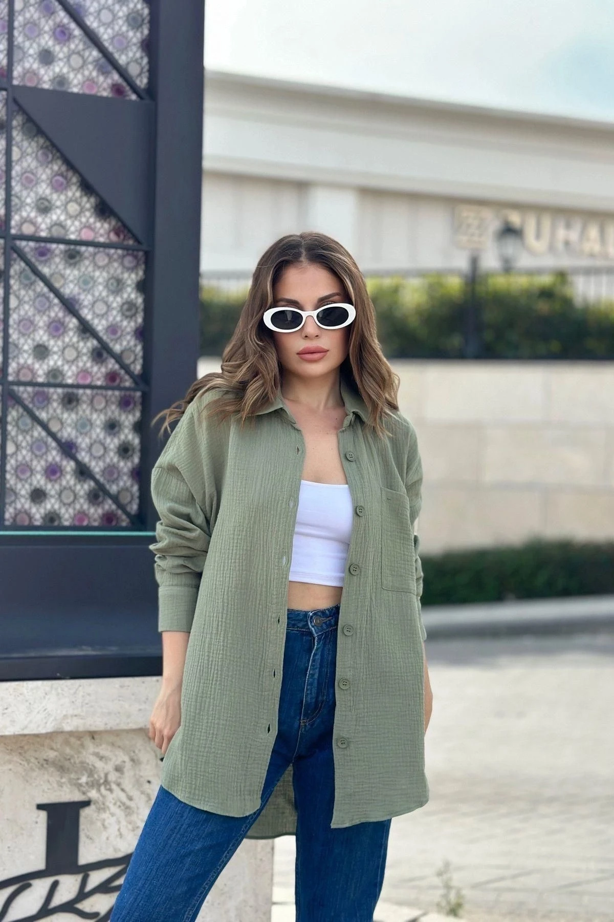 Kadın Haki İthal Müslin Kumaş, Cepli Uzun Ve Salaş Tunik Gömlek