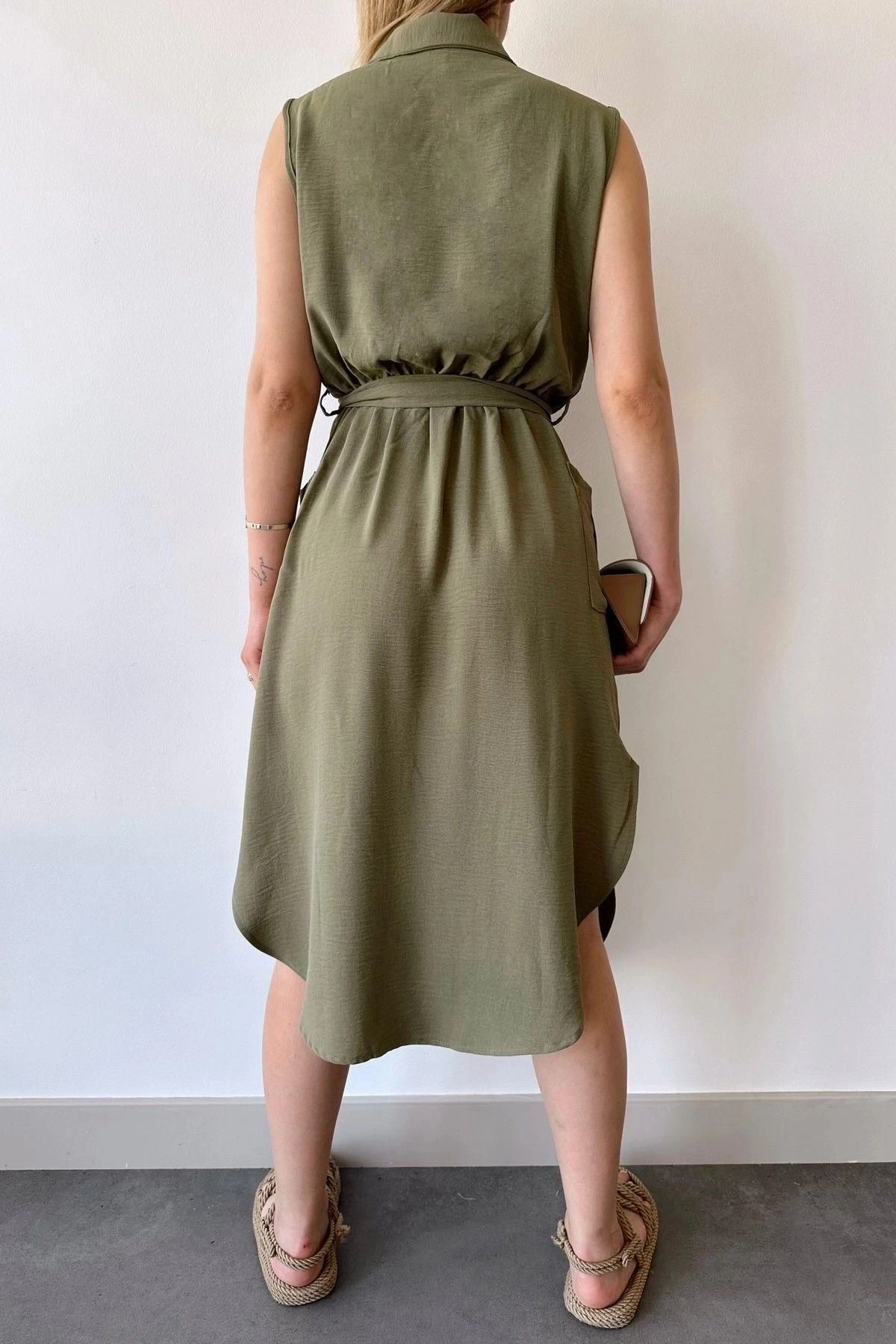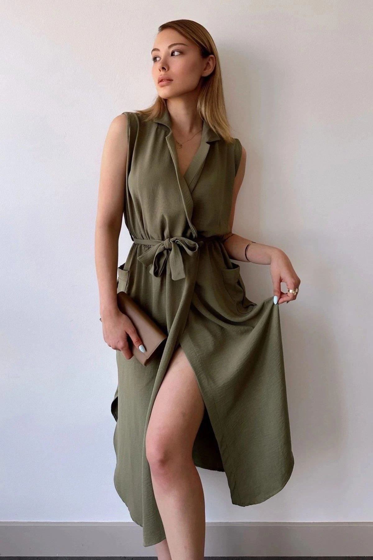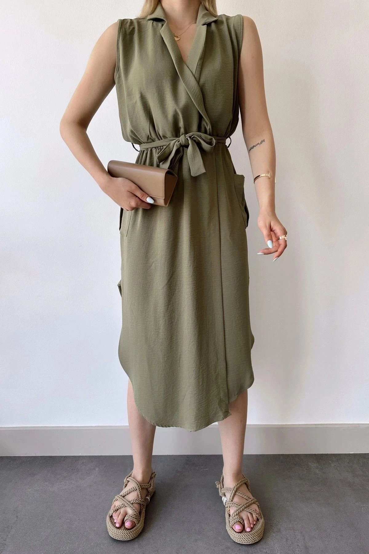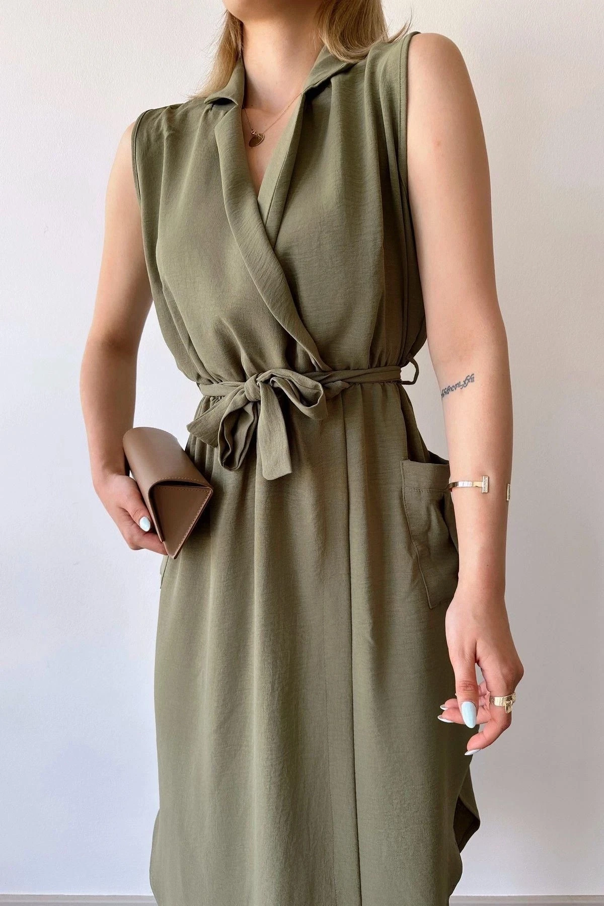 Bu kadın haki kalın askılı midi elbise, şıklığı ve rahatlığı bir arada sunuyor.; Elbisenin kumaşı %60 polyester ve %40 pamuk karışımından oluşur.; Bu karışım, elbiseye dayanıklılık sağlarken aynı zamanda yumuşaklık ve konfor sunar.; Kruvaze yaka tasarımı, elbiseye zarif bir dokunuş katar ve dekolte bölgesini çekici bir şekilde vurgular.; Düz deseni, sade ve minimalist bir tarz sunar.; Haki rengi, doğal tonlarıyla uyumlu ve şık bir seçimdir.; Relaxed kalıp ve kesimi, elbisenin rahat bir oturuş sağlar ve giyen kişiye geniş bir hareket özgürlüğü sunar.; Aerobin yırtmaçlı detayı, elbiseye hareketli bir dokunuş katar ve aynı zamanda feminen bir görünüm sağlar.; Bu detay, bacaklarda hafif bir serinlik hissi yaratır.; Elbisenin bel kısmında bulunan kemer detayı, beli vurgular ve elbiseye şekil verir.; Aynı zamanda kişisel tercihinize göre kemerin bağlama şeklini ayarlayabilirsiniz, böylece farklı stiller yaratabilirsiniz.; Bu haki kalın askılı kruvaze yaka midi elbise, rahatlık ve şıklığı bir arada arayan kadınlar için mükemmel bir seçenektir.; %60 polyester ve %40 pamuk içeriğiyle, elbise konforlu bir giyim deneyimi sunar.; Aerobin kumaşının hafifliği ve karışım içeriğiyle gün boyu rahatlık sağlar.; Kruvaze yaka tasarımı, düz deseni ve kemer detayıyla bu elbise, tarzınızı tamamlamak için ideal bir seçenektir.; Gardırobunuzun vazgeçilmez bir parçası olacak.