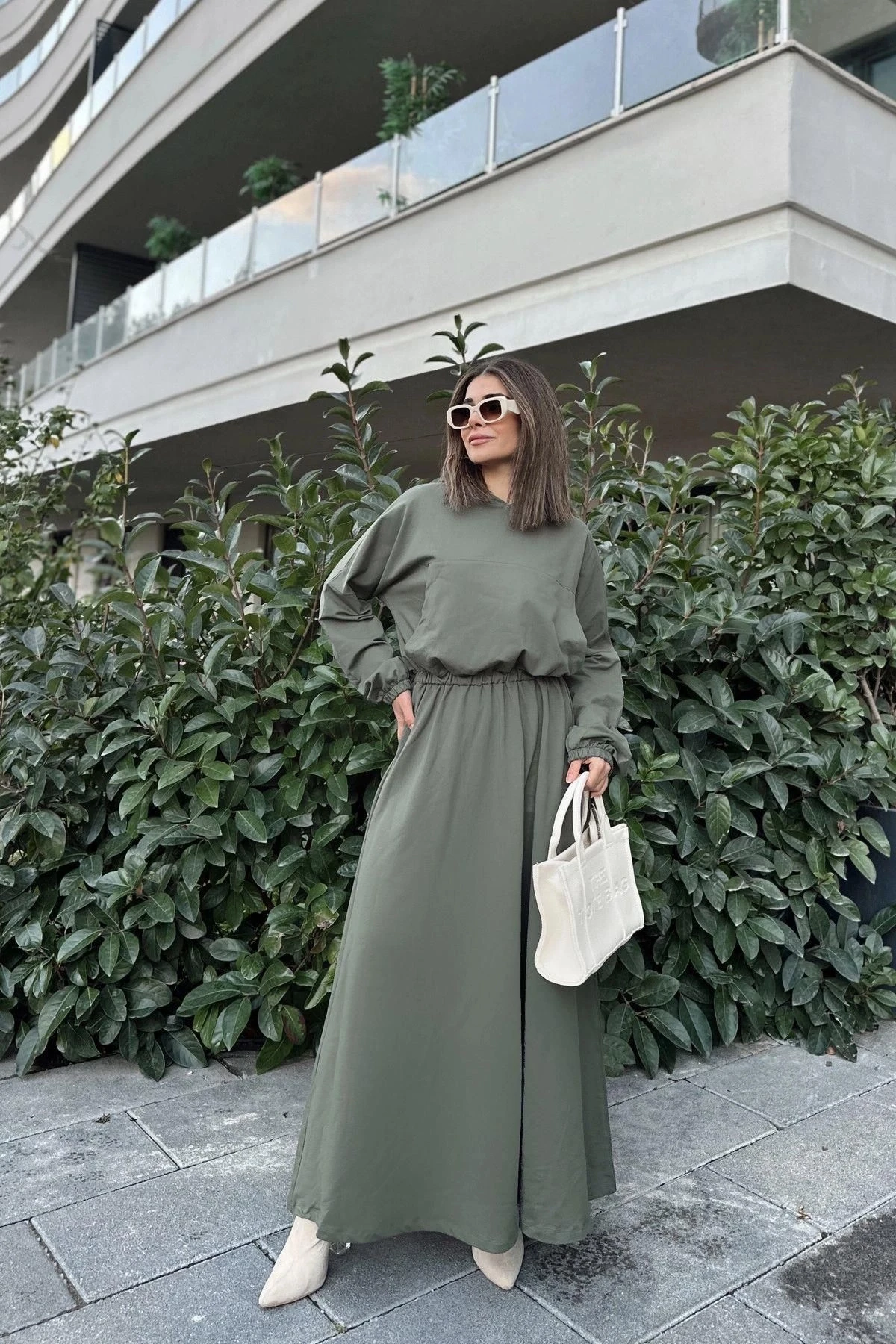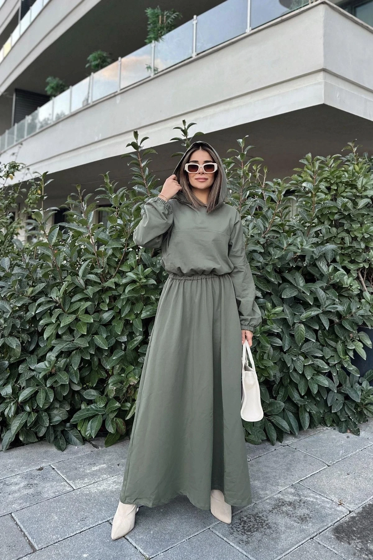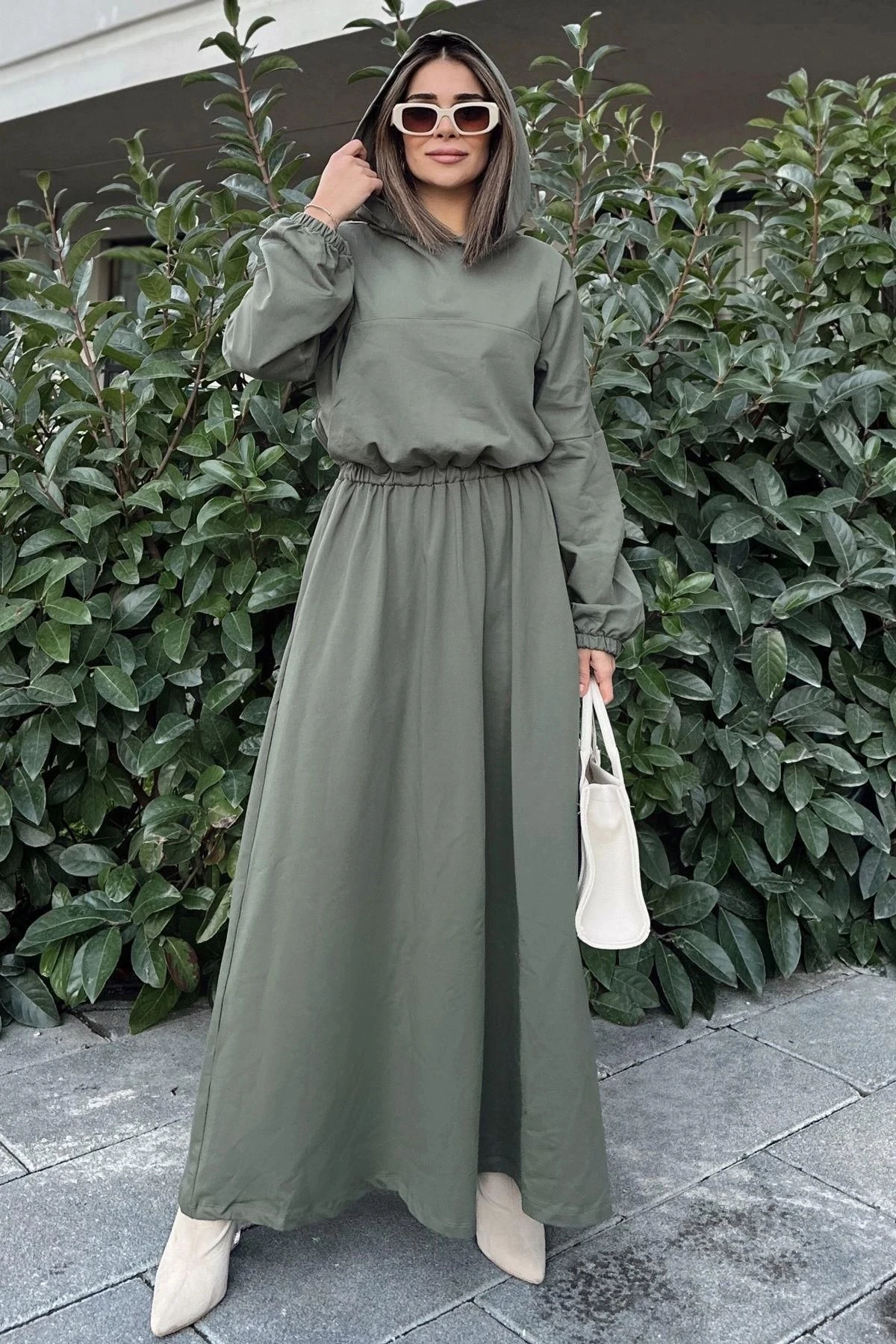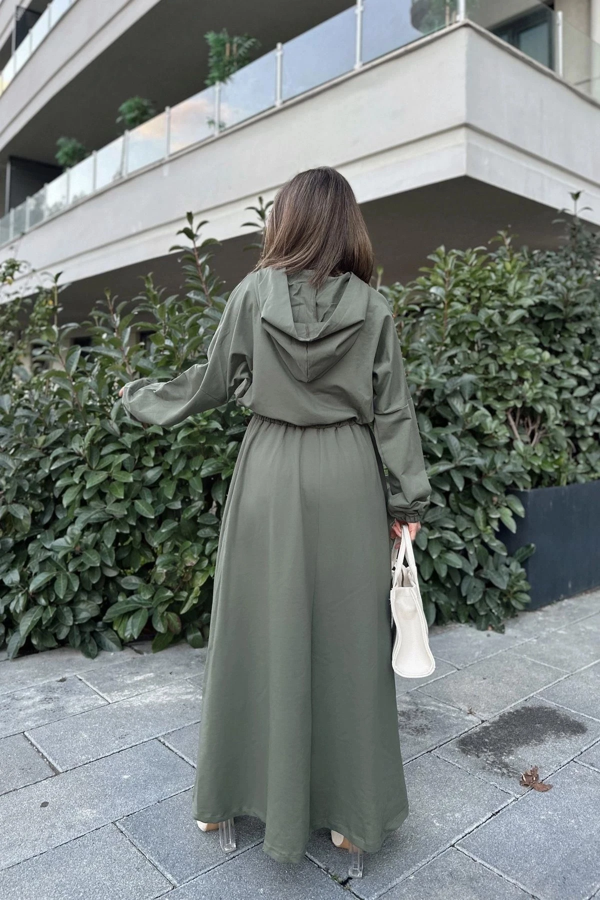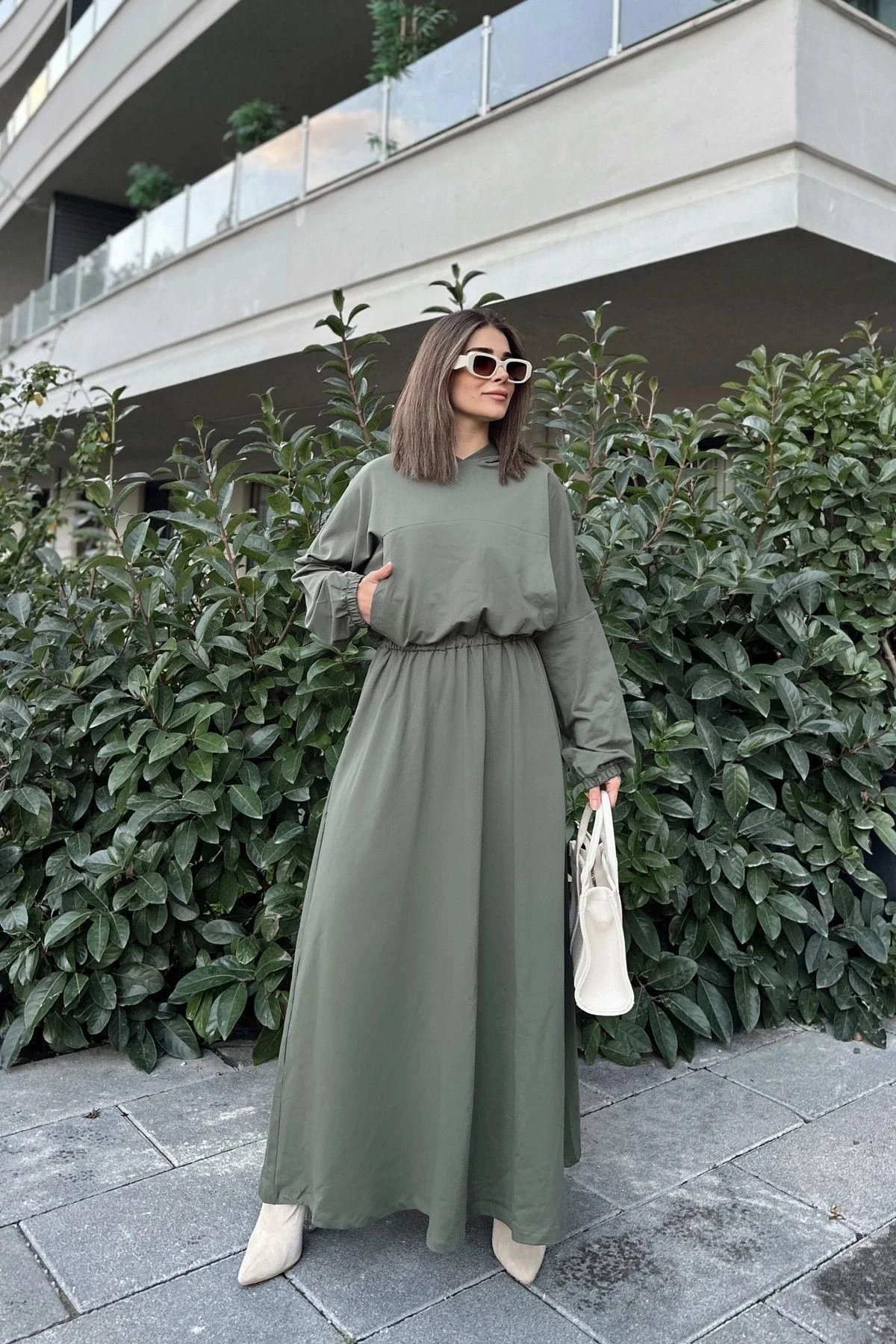 Kadın Haki Kapüşonlu, Kanguru Cep Detaylı, Beli Lastikli, Salaş Uzun Elbise