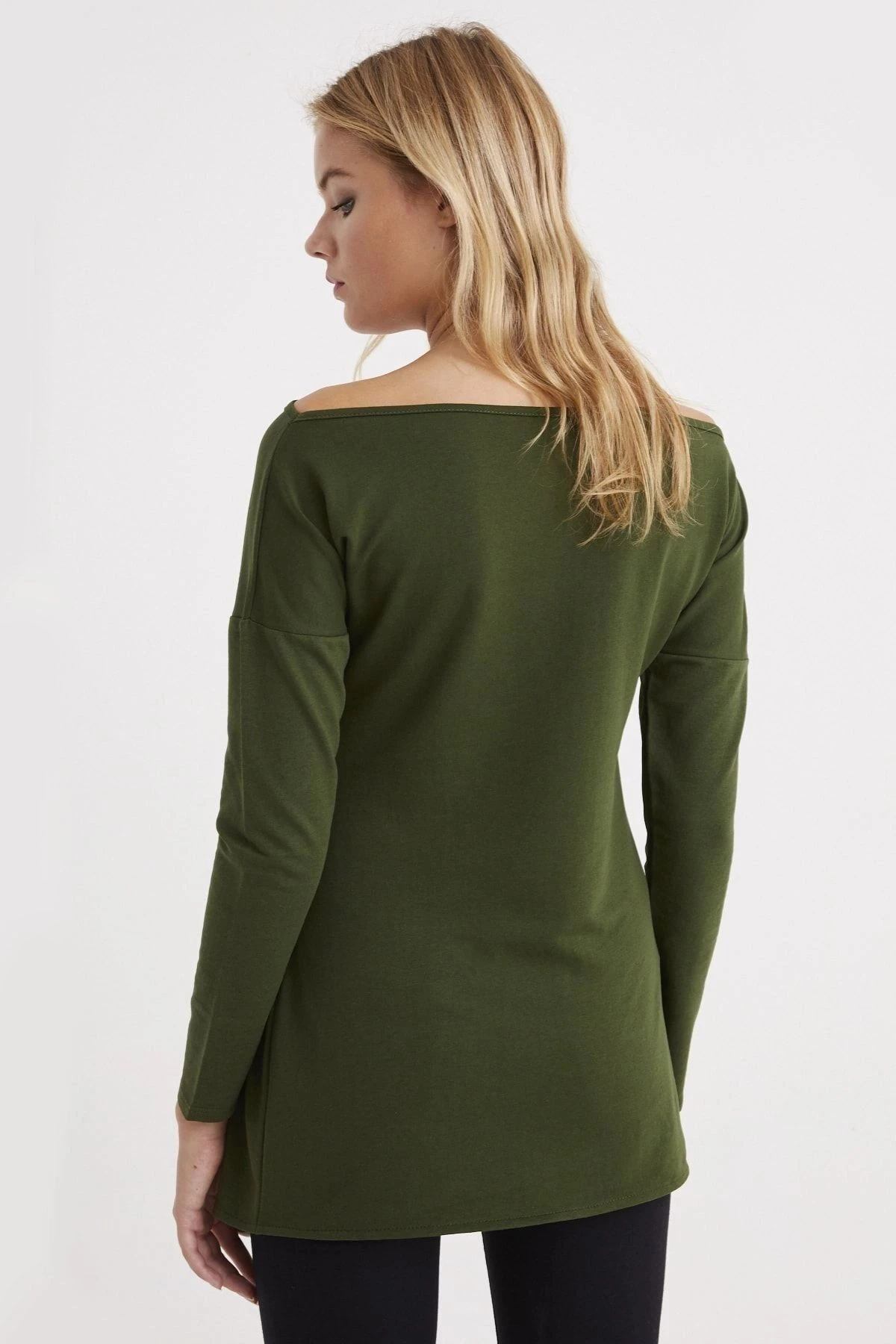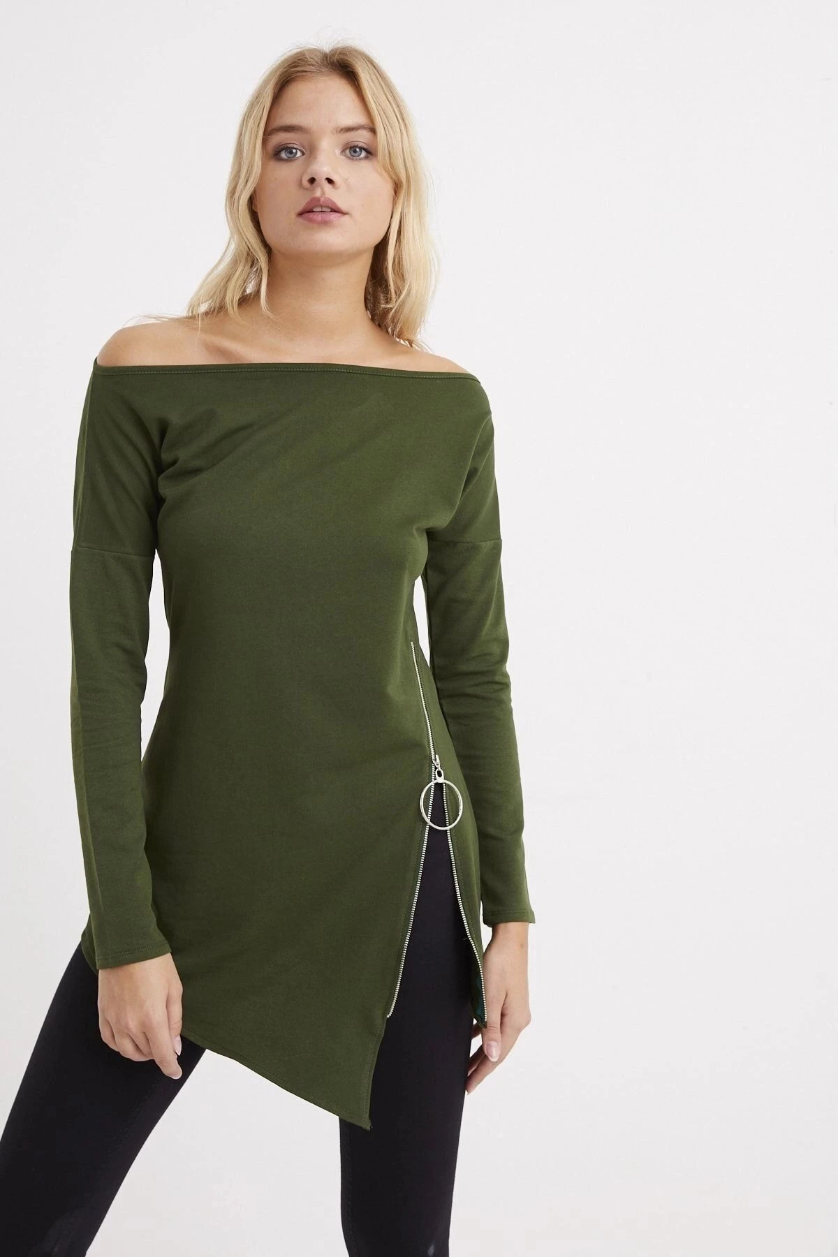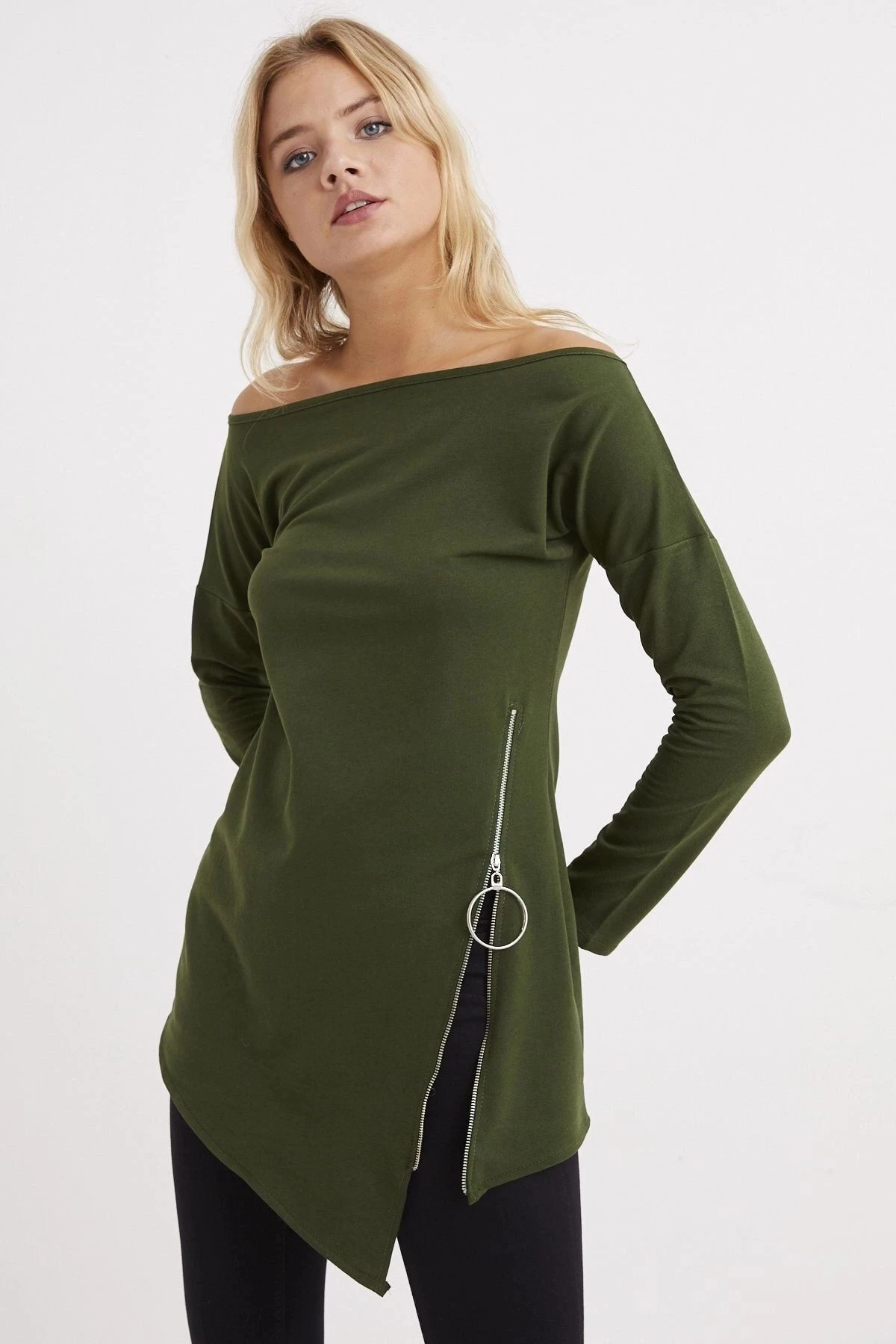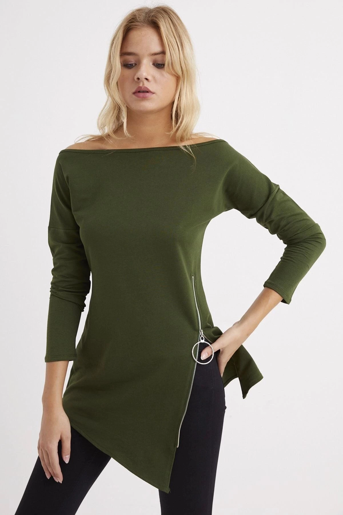 Kadın Haki Kayık Yaka Uzun Kol Asimetrik Kesim Fermuar Detaylı Regular Kesim Standart Boy Tunik
