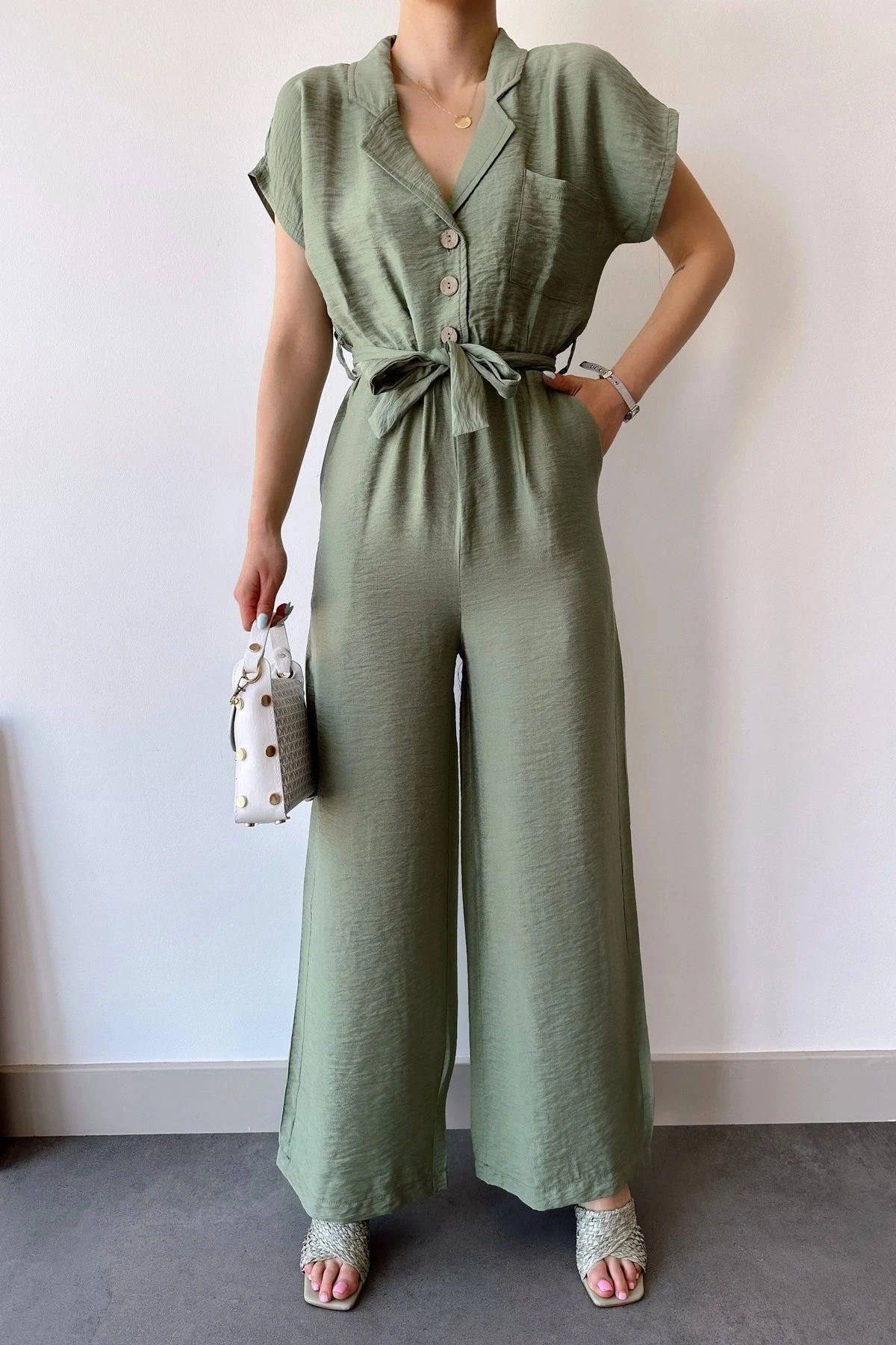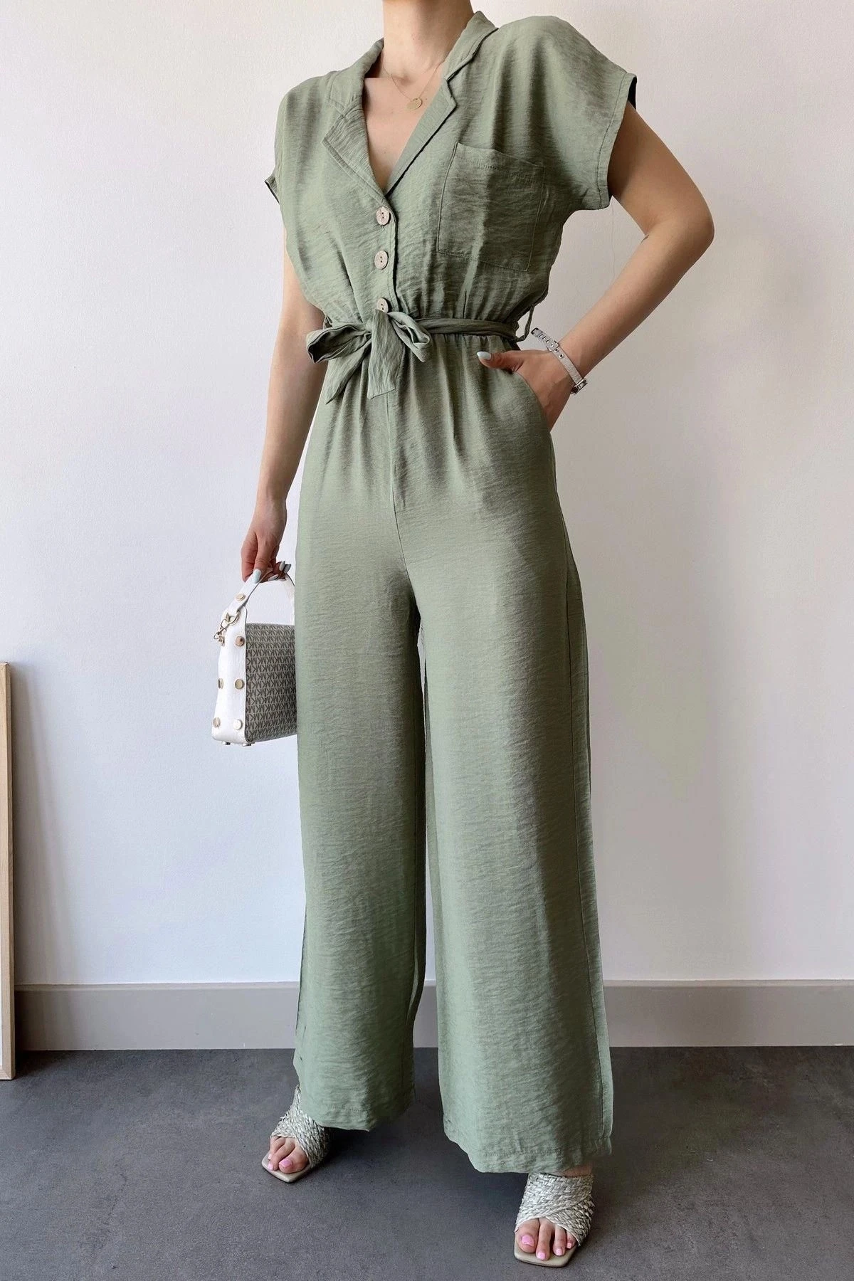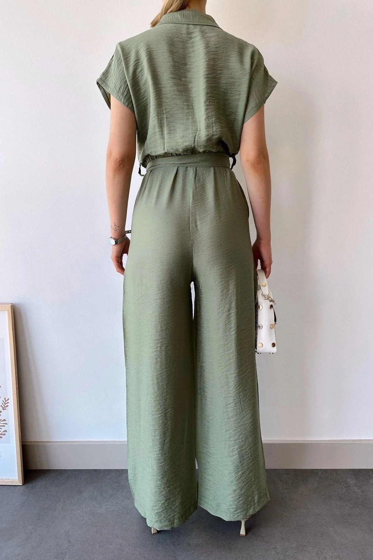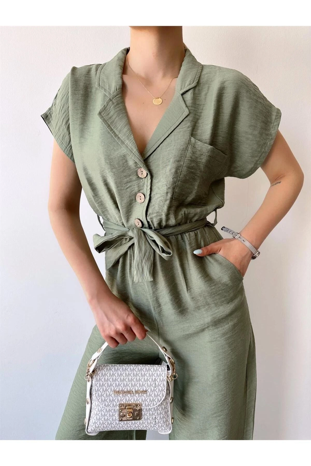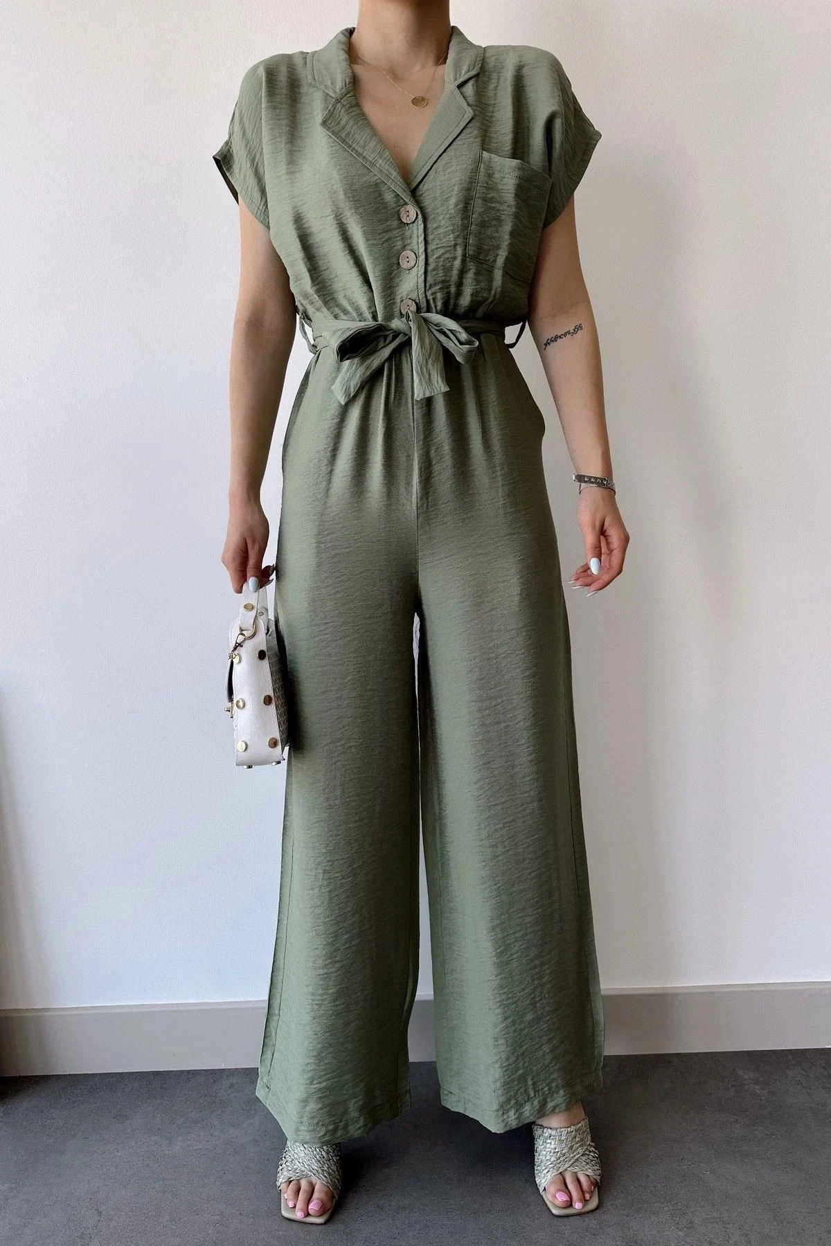 Bu kadın haki kısa kollu kuşaklı uzun tulum, rahatlık ve stilin birleşimidir.; Tulumun kumaşı %60 pamuk ve %40 polyester karışımından oluşur.; Bu karışım, tulumun dayanıklılığını artırırken aynı zamanda yumuşaklık ve konfor sağlar.; Ceket yaka tasarımı, tulumun şık ve modern bir görünüm kazanmasını sağlar.; Desensiz ve sade bir tasarıma sahip olan tulum, minimalist bir tarz sunar.; Haki rengi, doğal ve sakin tonlarıyla uyumlu bir seçenektir.; Basic kalıp ve kesimi, tulumun rahat bir oturuş sağlamasını ve giyen kişiye geniş bir hareket özgürlüğü sunmasını sağlar.; Aerobin kumaşı, hafif ve nefes alabilir bir yapıya sahiptir, böylece tulumu uzun süre boyunca rahatça giyebilirsiniz.; Tek cepli detay, tulumun şıklığını tamamlarken aynı zamanda pratik bir kullanım sağlar.; Tulumun bel kısmında yer alan kuşak, beli vurgular ve tulumun şeklini ayarlamak için kullanılabilir.; Bu detay, tulumun size özgü bir uyum sağlamasını sağlar ve vücut hatlarınızı belirginleştirir.; Bu haki kısa kollu ceket yaka kuşaklı uzun tulum, rahatlık ve stil arayan kadınlar için mükemmel bir seçenektir.; %60 pamuk ve %40 polyester içeriğiyle, tulum dayanıklı ve konforlu bir giyim deneyimi sunar.; Basic kesimi ve tek cepli detayıyla bu tulum, şık ve minimalist bir tarzı temsil eder.; Aerobin kumaşı ve kuşak detayı, tulumun hareket özgürlüğü ve kişiselleştirilebilir bir uyum sağlamasını sağlar.; Gardırobunuzun vazgeçilmez parçalarından biri olacak.