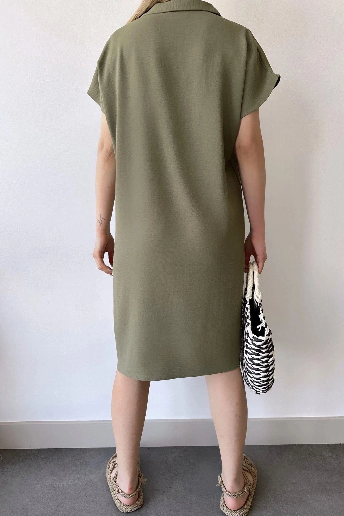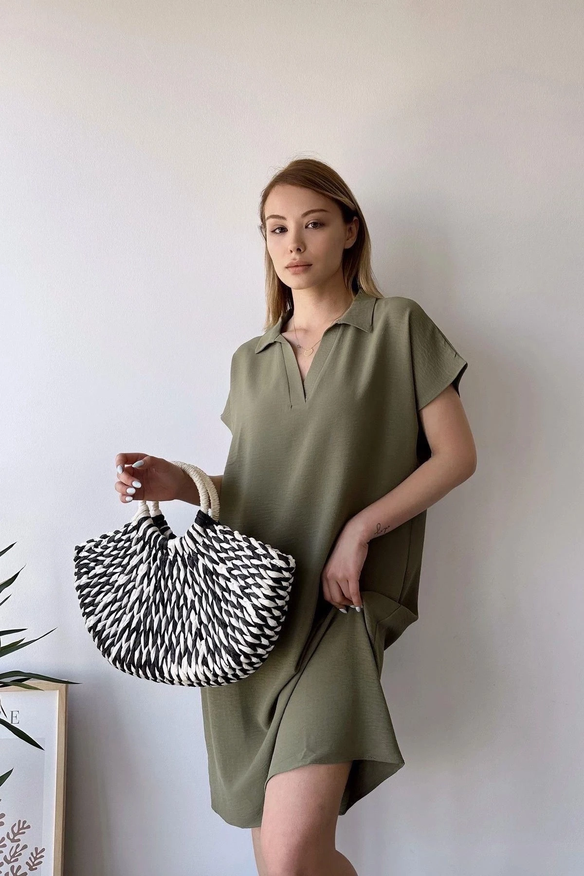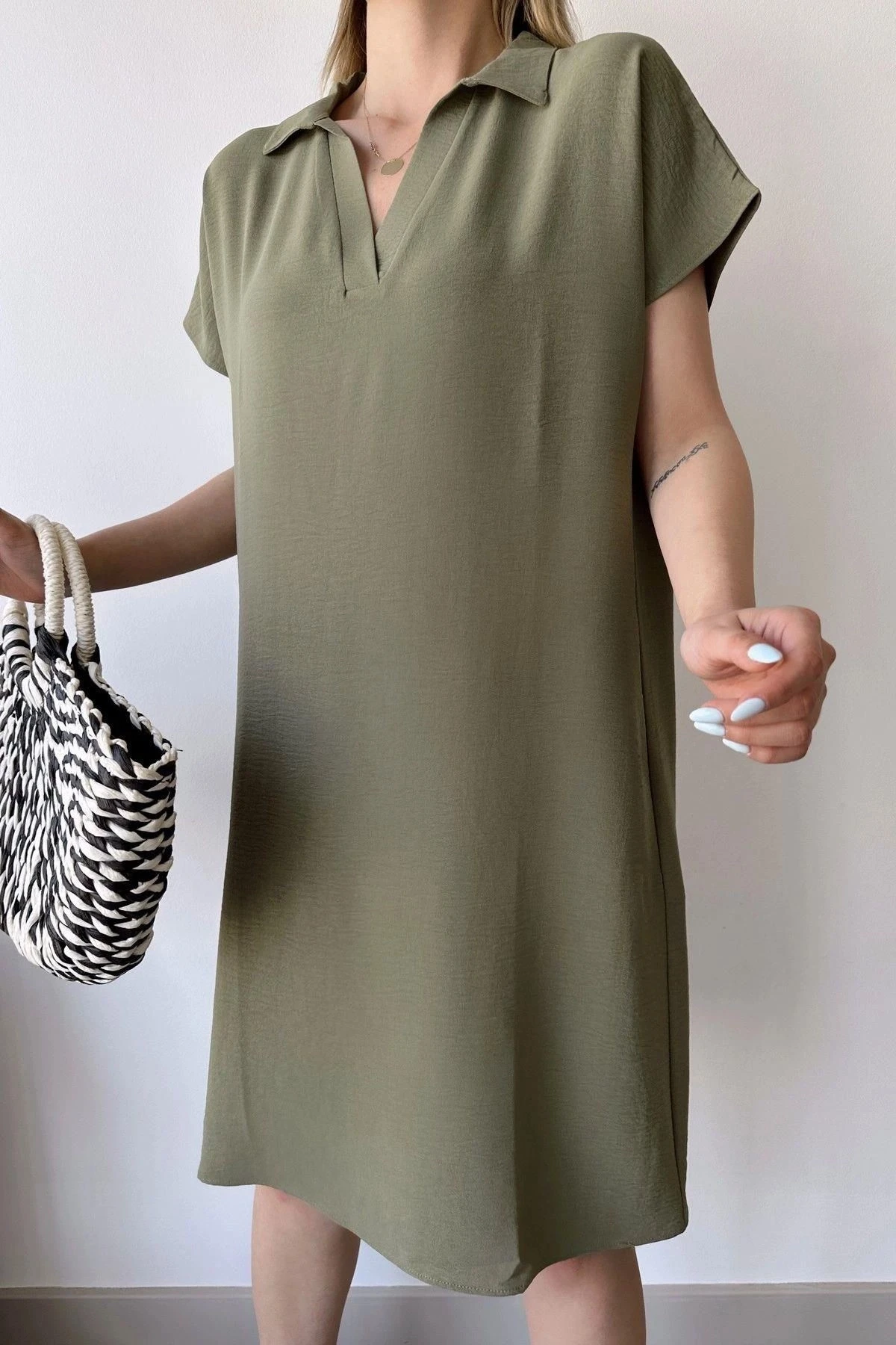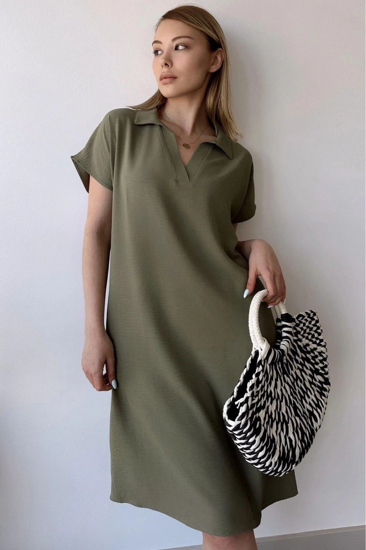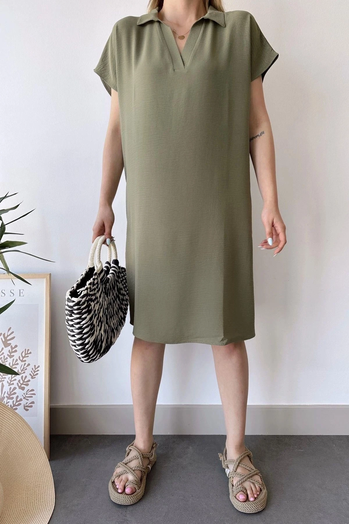 Bu kadın haki kısa kollu midi elbise, rahatlık ve şıklığı bir araya getiriyor.; Elbisenin kumaşı %60 polyester ve %40 pamuk karışımından oluşur.; Bu karışım, elbiseye dayanıklılık sağlarken aynı zamanda yumuşaklık ve konfor sunar.; Polo yaka tasarımı, elbiseye spor ve şık bir hava katar.; Dokulu deseni, elbiseye görsel bir çekicilik ve dokunsal bir zenginlik kazandırır.; Haki rengi, doğal ve sakin tonlarıyla uyumlu bir seçenektir.; Basic kalıp ve kesimi, elbisenin rahat bir oturuş sağlamasını ve giyen kişiye geniş bir hareket özgürlüğü sunmasını sağlar.; Aerobin kumaşı, hafif ve nefes alabilir bir yapıya sahiptir, böylece elbiseyi uzun süre boyunca rahatça giyebilirsiniz.; Rahat midi boyu, hem şık hem de kullanışlıdır.; Bu haki kısa kollu polo yaka midi elbise, rahatlık ve şıklığı bir arada arayan kadınlar için mükemmel bir seçenektir.; %60 polyester ve %40 pamuk içeriğiyle, elbise konforlu bir giyim deneyimi sunar.; Dokulu deseni ve polo yaka tasarımıyla göz alıcı bir görünüm sağlar.; Basic kalıp ve kesimi, giyen kişiye geniş bir hareket özgürlüğü sunar.; Aerobin kumaşıyla hafiflik ve nefes alabilirlik sağlar.; Bu elbise, günlük kullanımdan özel etkinliklere kadar birçok farklı durumda tarzınızı tamamlamak için idealdir.; Gardırobunuzun vazgeçilmez bir parçası olacak.