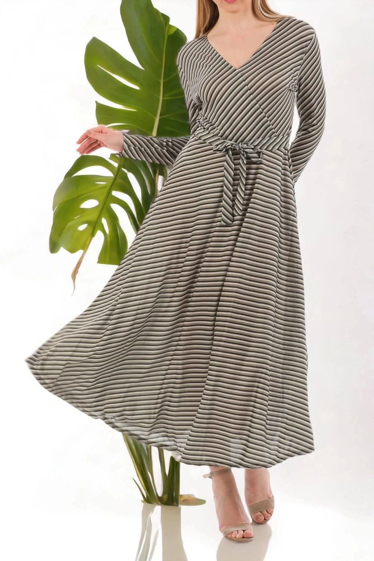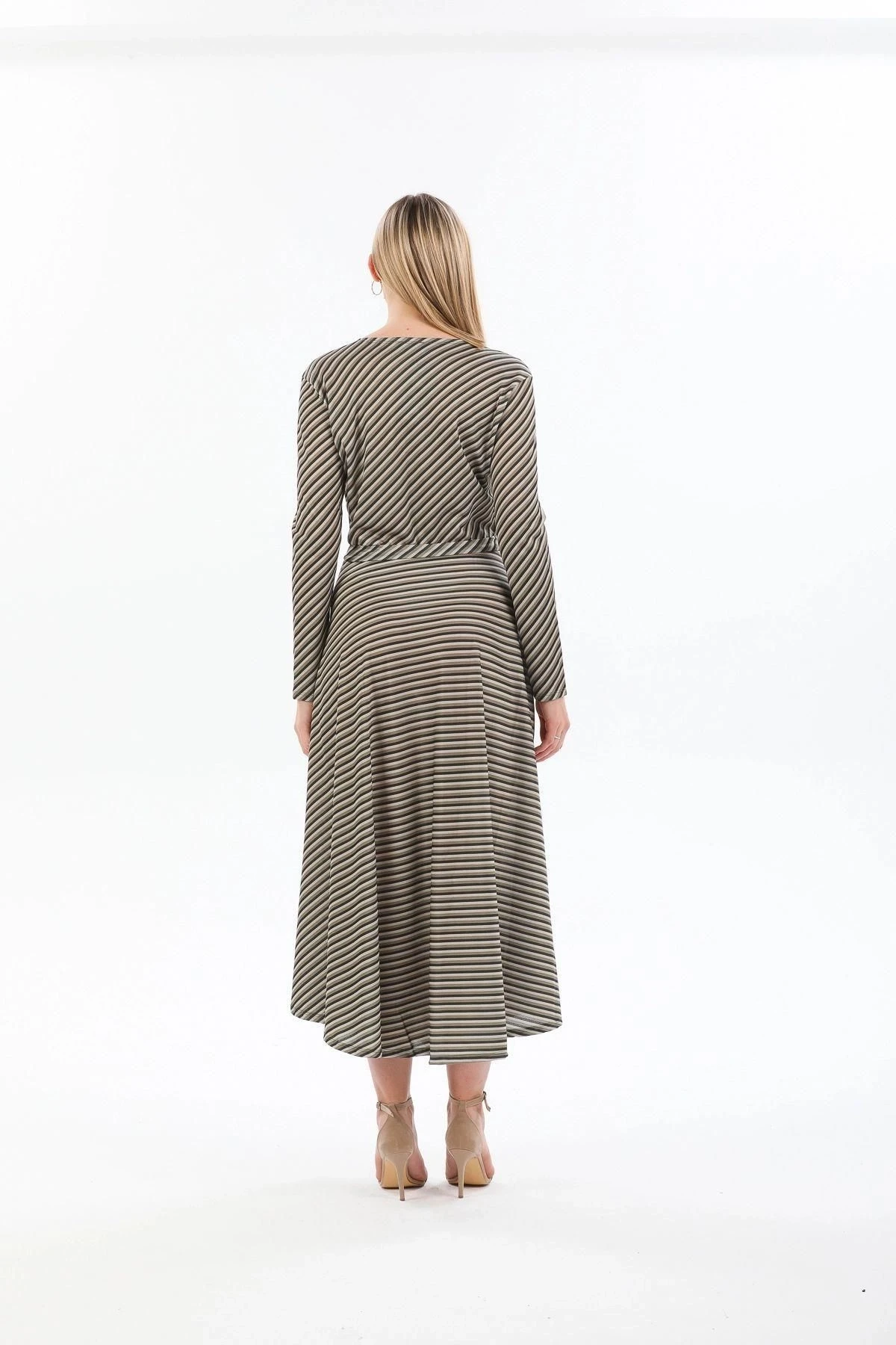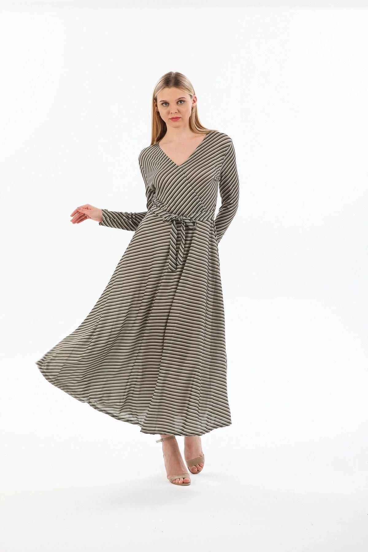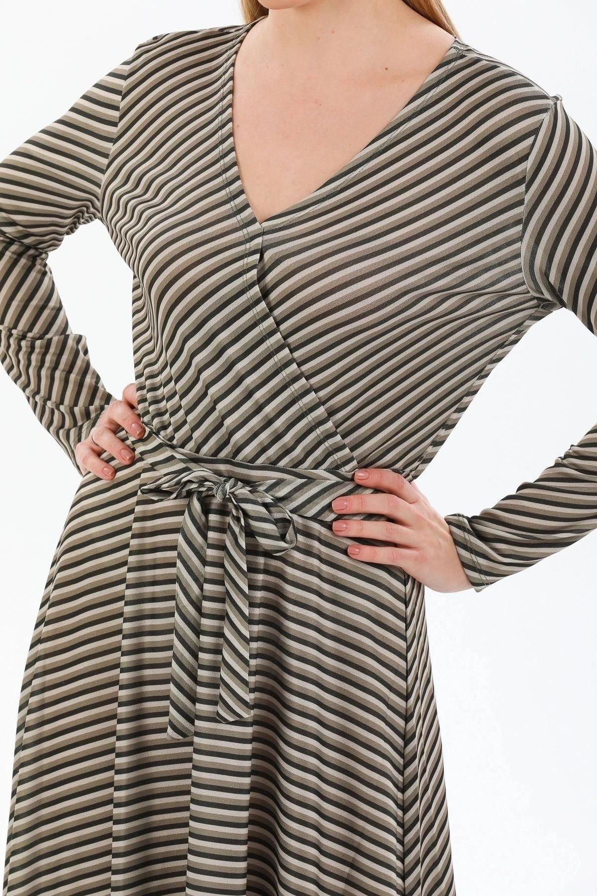 Kadın Haki Kruvaze Yaka Rahat Kesim Çizgili Elbise