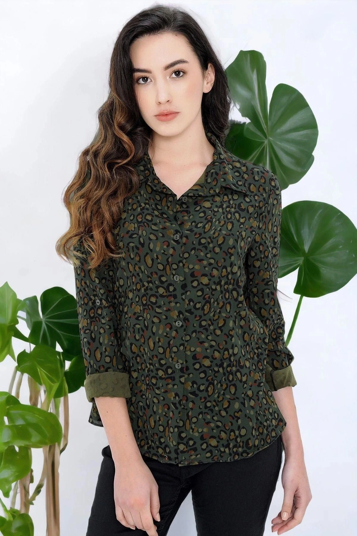 Kadın Haki Leopar Desenli Klasik Yaka Uzun Kol Regular Kesim Standart Boy Gömlek