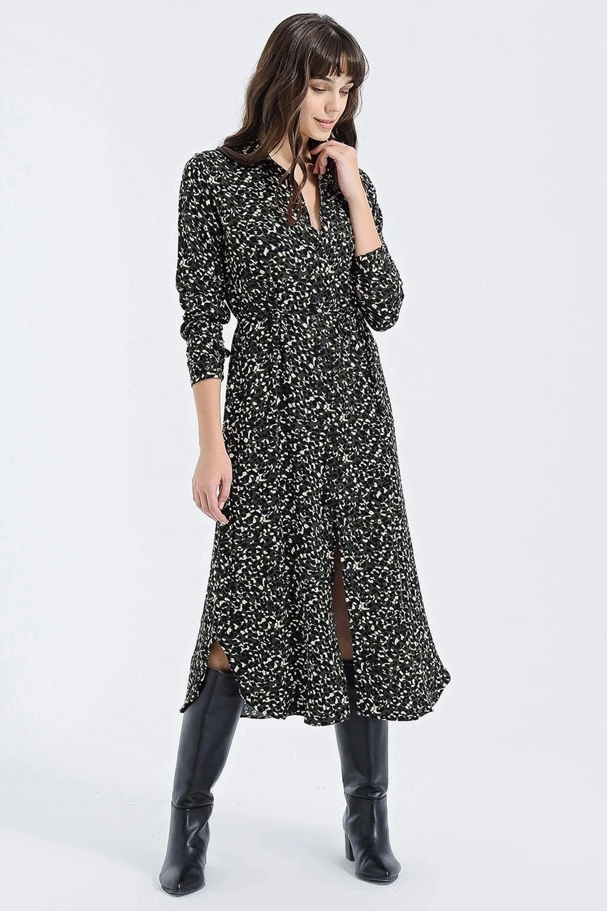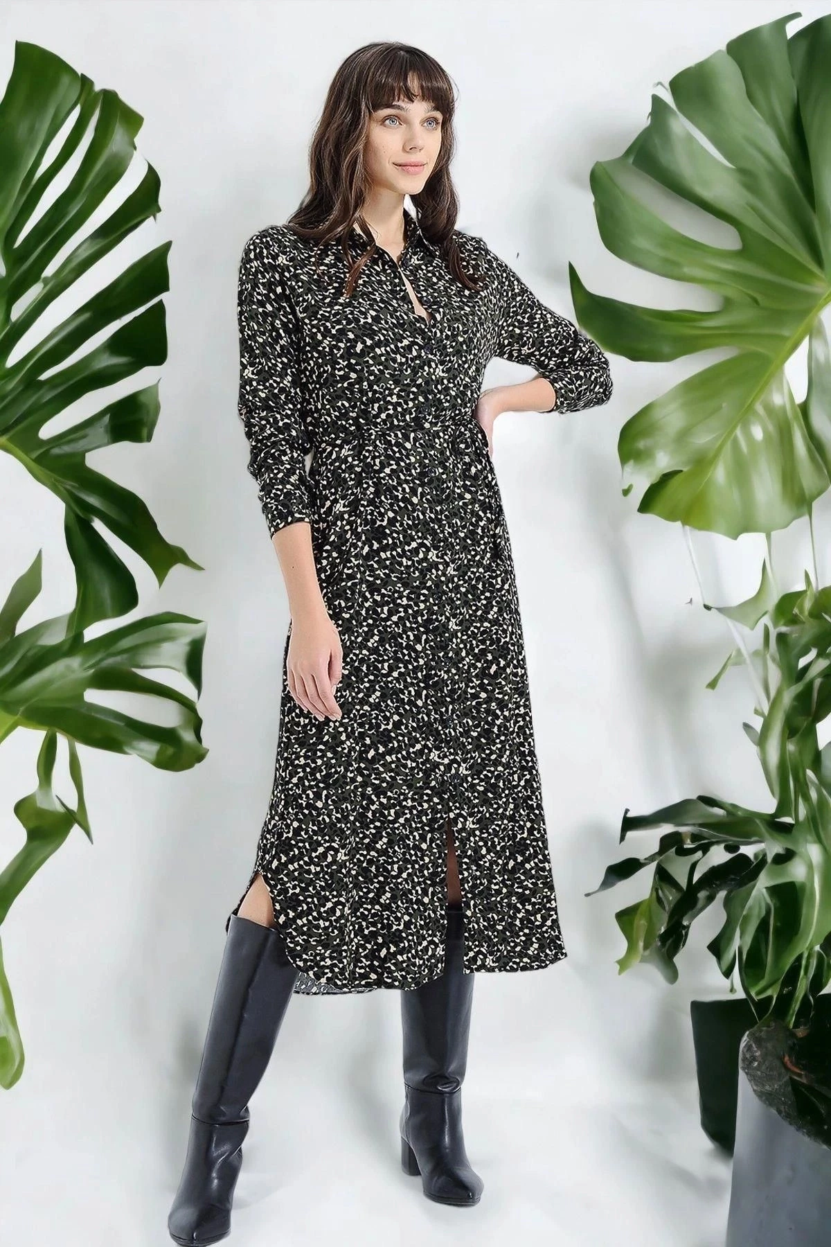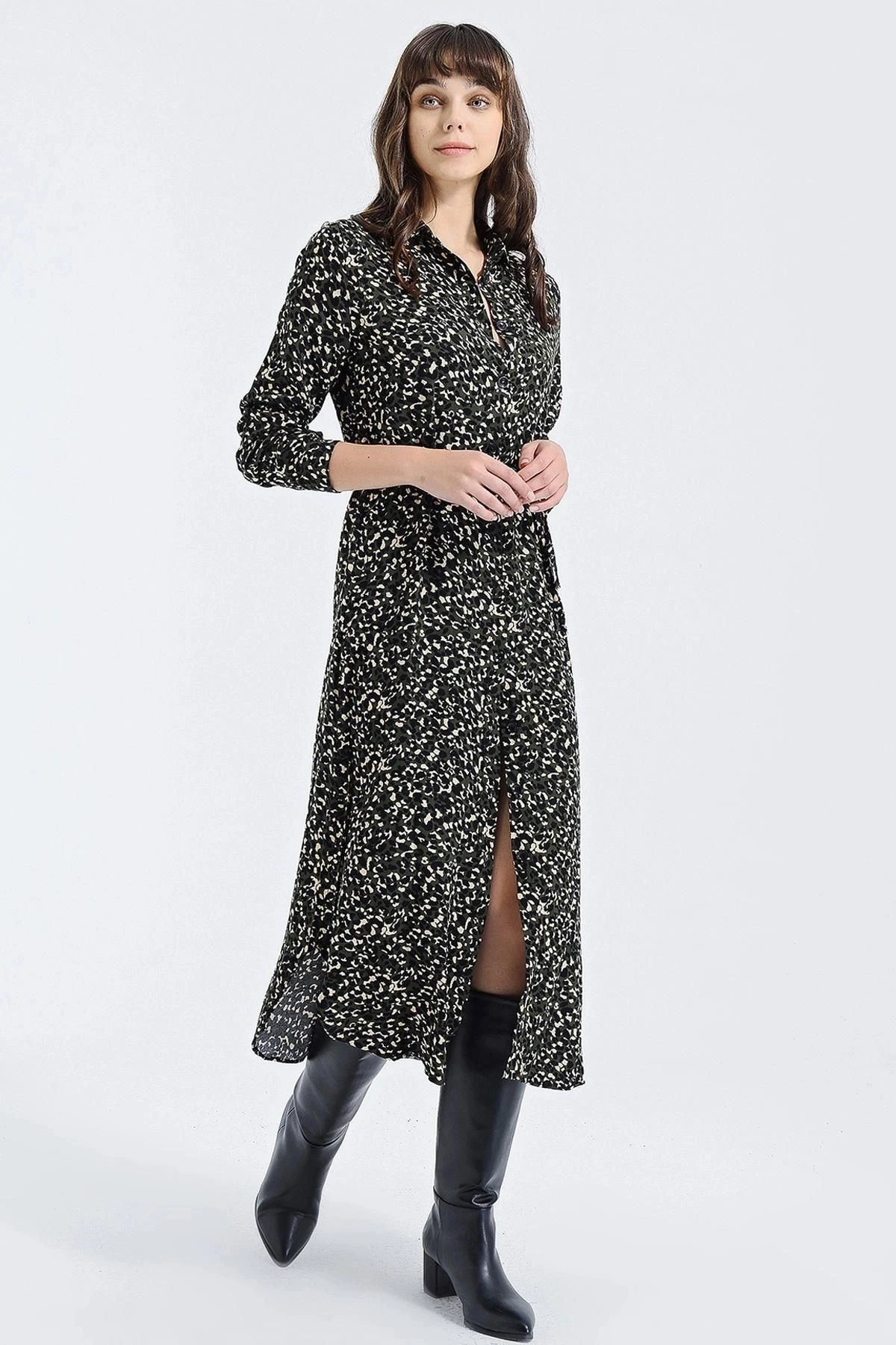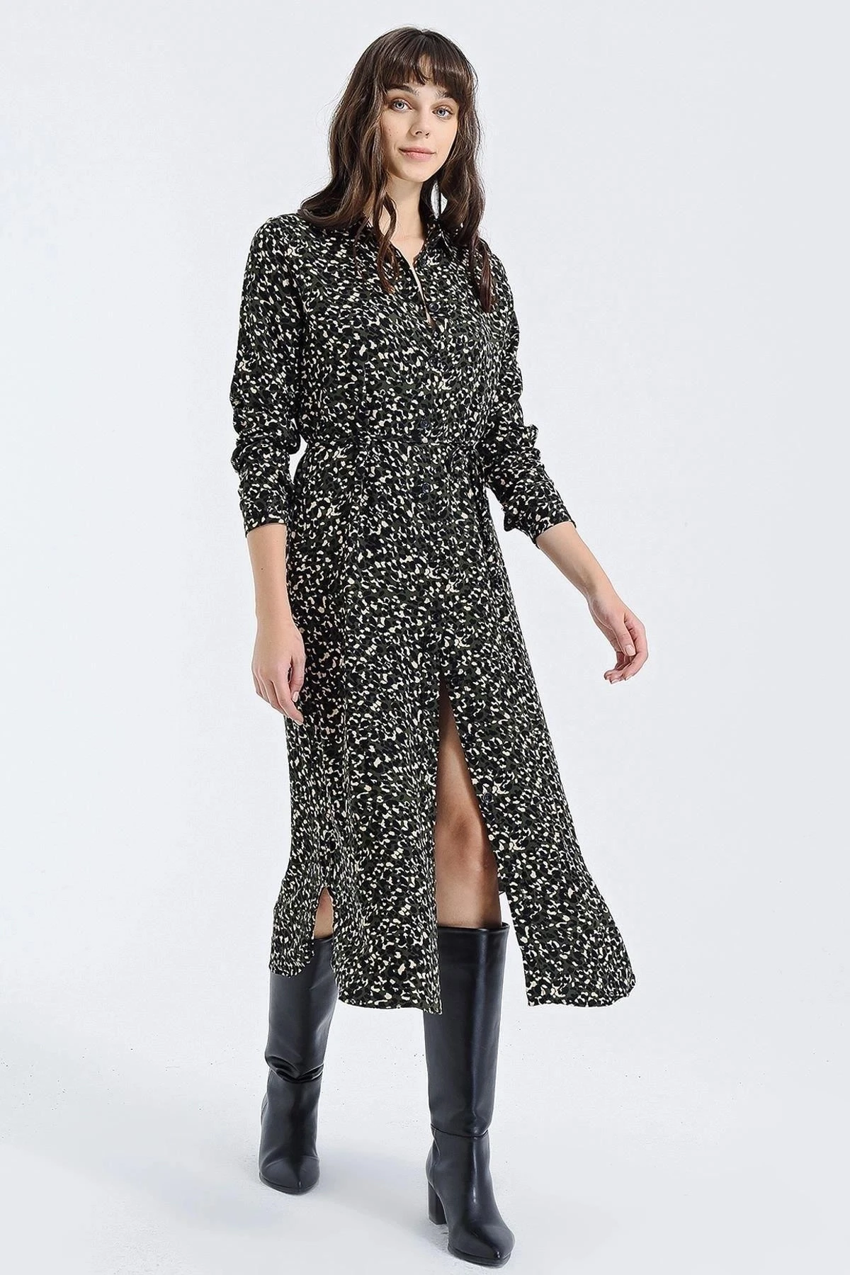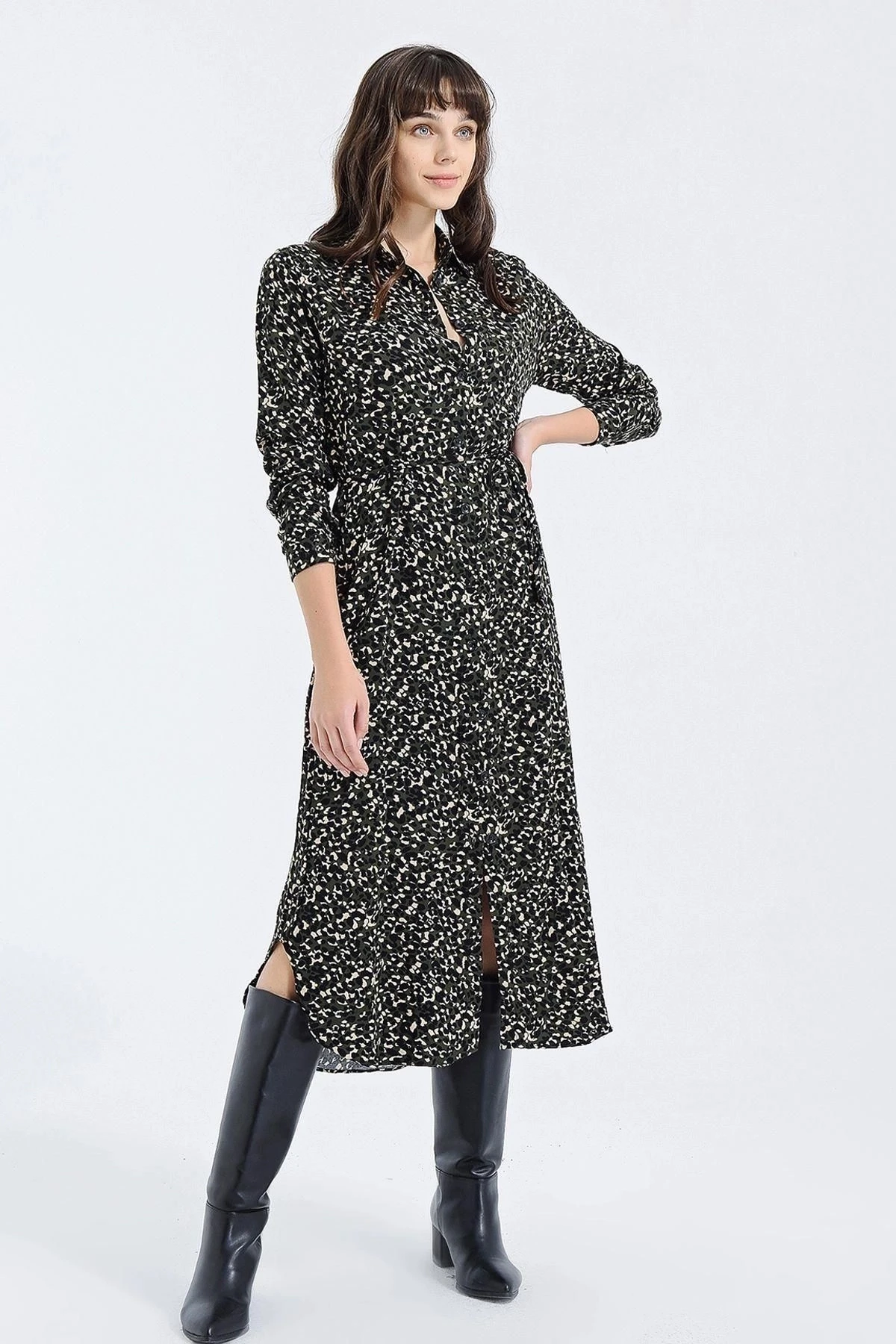 Bu Haki Renk Leopar Desenli Yırtmaçlı Uzun Kol Klasik Yaka Maksi Boy Elbise, zarafet ve rahatlığı bir araya getiriyor.; Üstün kaliteli %100 Viscose kumaştan üretilmiştir, bu da size yumuşak ve hafif bir dokunuş sağlar.; Leopar desenli tasarımıyla bu elbise, modern ve çekici bir görünüm sunar.; Haki rengi, sakinlik ve doğal zarafetin ifadesidir, her mevsimde giyilebilecek bir seçenektir.; Klasik yaka detayı, zamanın testini geçmiş bir stilin zarafetini yansıtırken, uzun kollu tasarımı da ekstra konfor sağlar.; Rahat kesimi, gün boyu hareket özgürlüğü sunar ve bu elbiseyi günlük kullanımda tercih etmeniz için mükemmel hale getirir.; Yırtmaç detayı, elbisenin hareketli ve kadınsı bir silüete sahip olmasını sağlar.; Hem stilinizi yansıtan bir ayrıntı hem de işlevsel bir detaydır.; Bu maksi boy elbise, her türlü durumda size eşlik edebilecek çok yönlü bir parçadır.; Ofis ortamında şıklık sağlarken, arkadaşlarınızla buluşurken veya günlük gezmelerde rahatlık sunar.; Her anınıza uyum sağlamak için tasarlanmıştır.; Bu Haki Renk Leopar Desenli Yırtmaçlı Uzun Kol Klasik Yaka Maksi Boy Elbise, kumaş kalitesi, canlı renkleri ve şık tasarımıyla gardırobunuzun vazgeçilmez bir parçası olacak.; Şıklığı ve rahatlığı bir araya getiren bu elbise, tarzınızı tamamlamak için ideal seçeneklerden biridir.