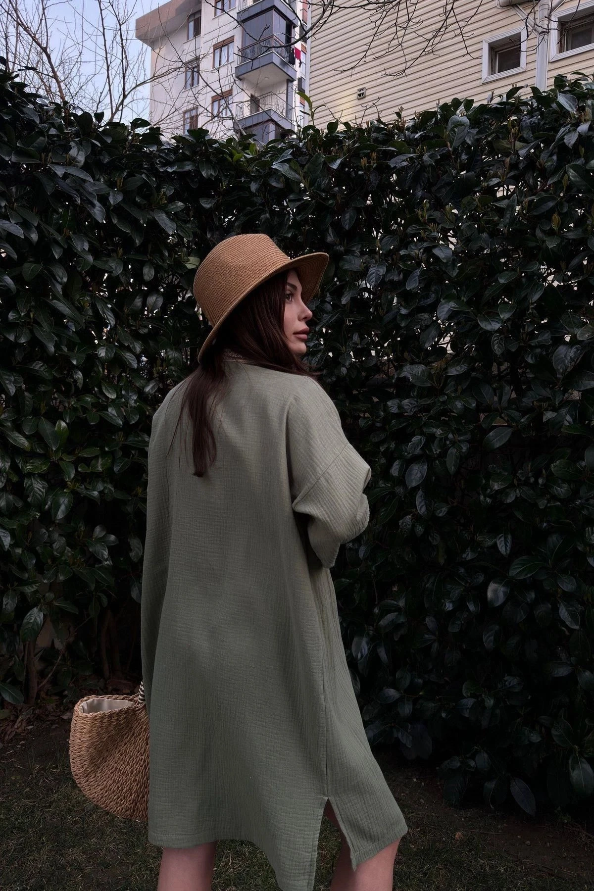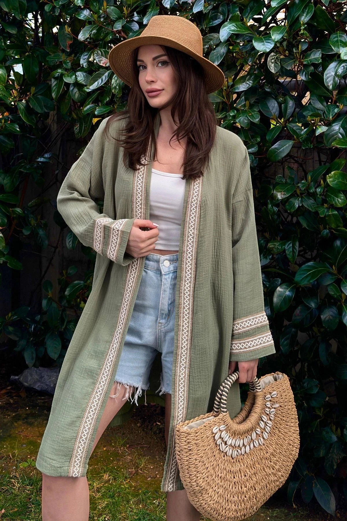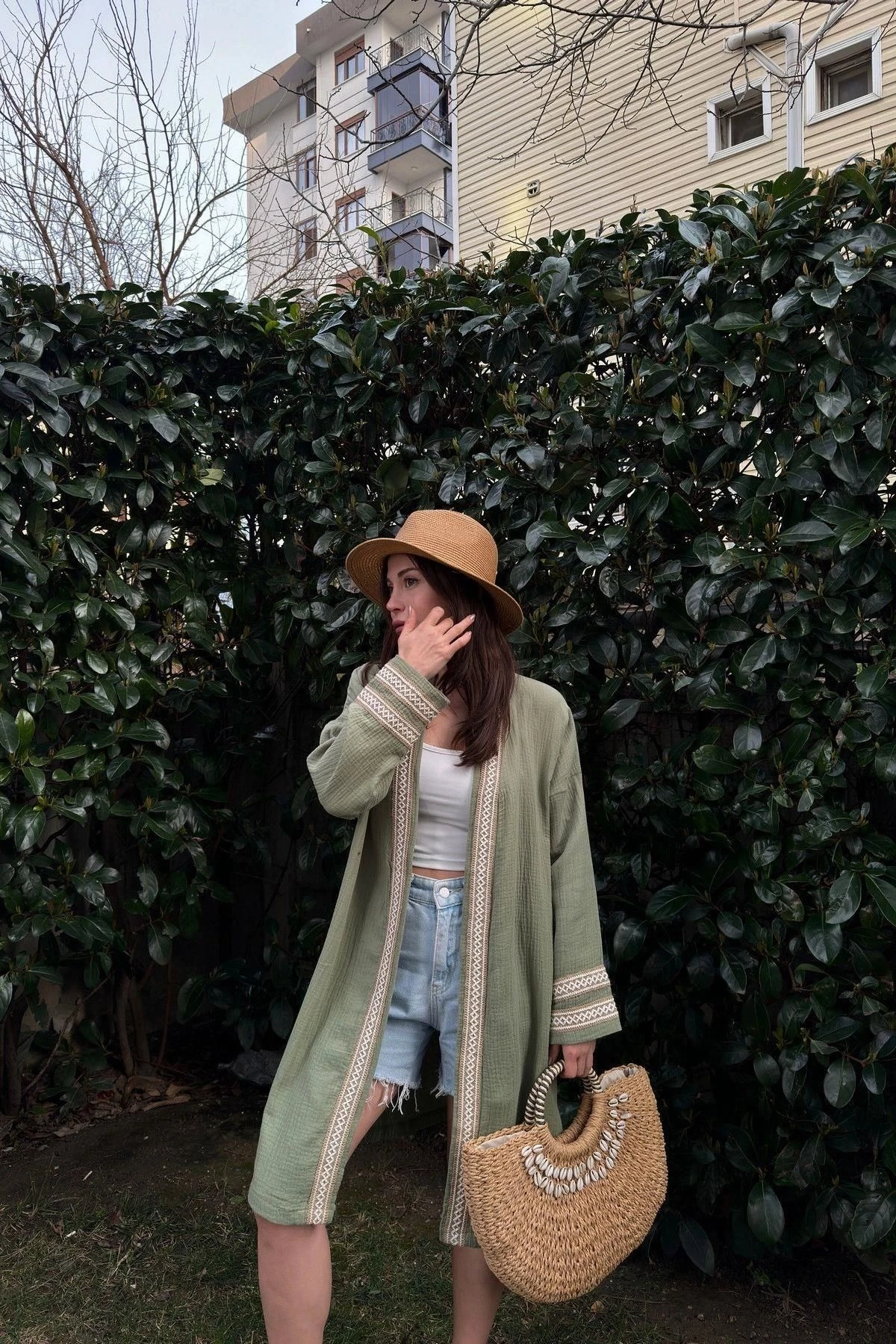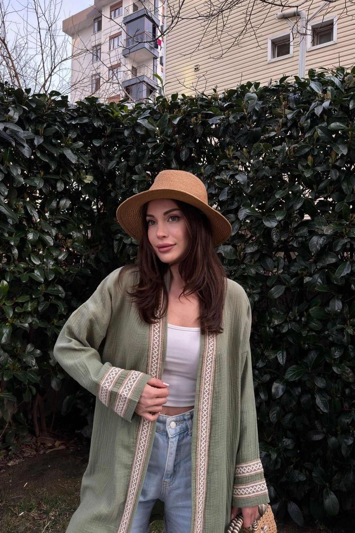 Kadın Hakı Müslin Kumaş, Hasır Şerit Detaylı Salaş Kimono Ceket