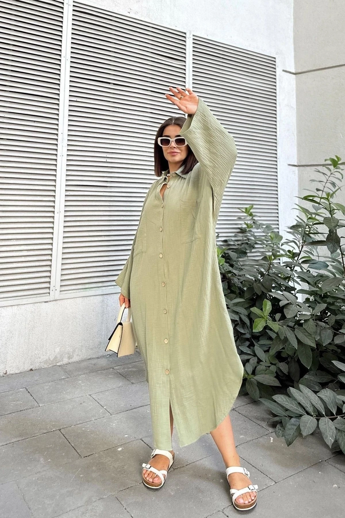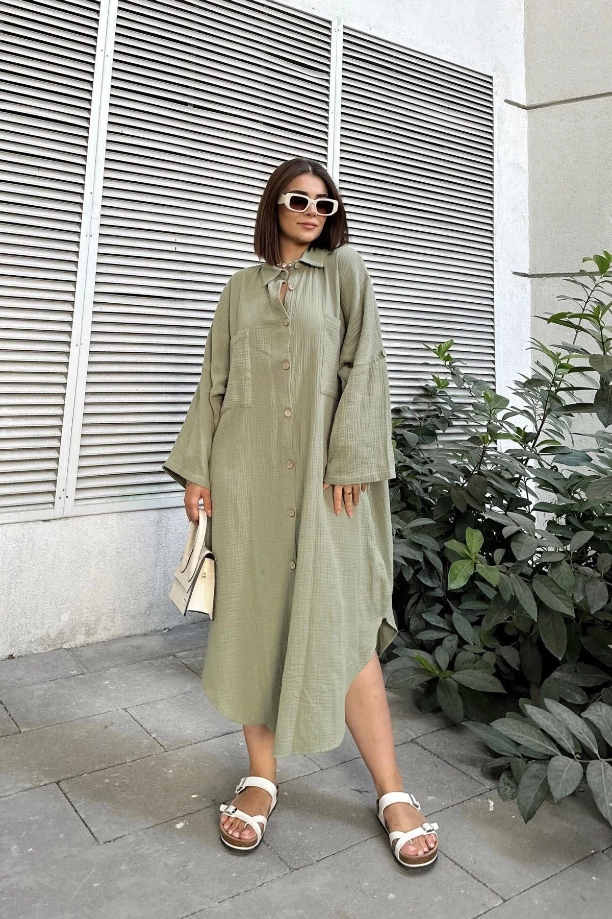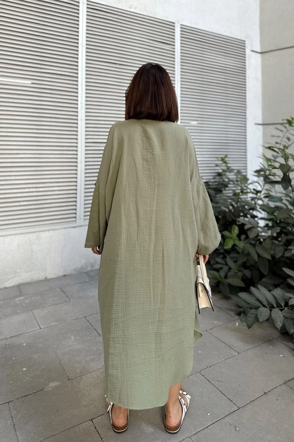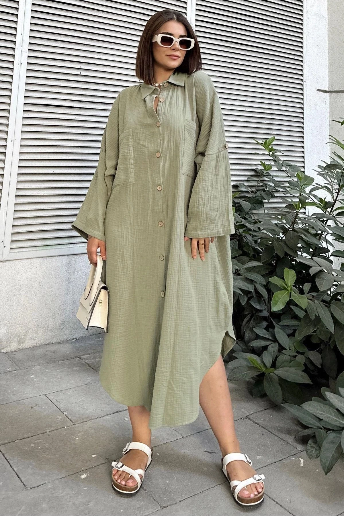 Kadın Haki Muslin Kumaş, Yarasa Kol, Eteği Oval, Çift Cepli, Uzun Oversize Salaş Gömlek Elbise