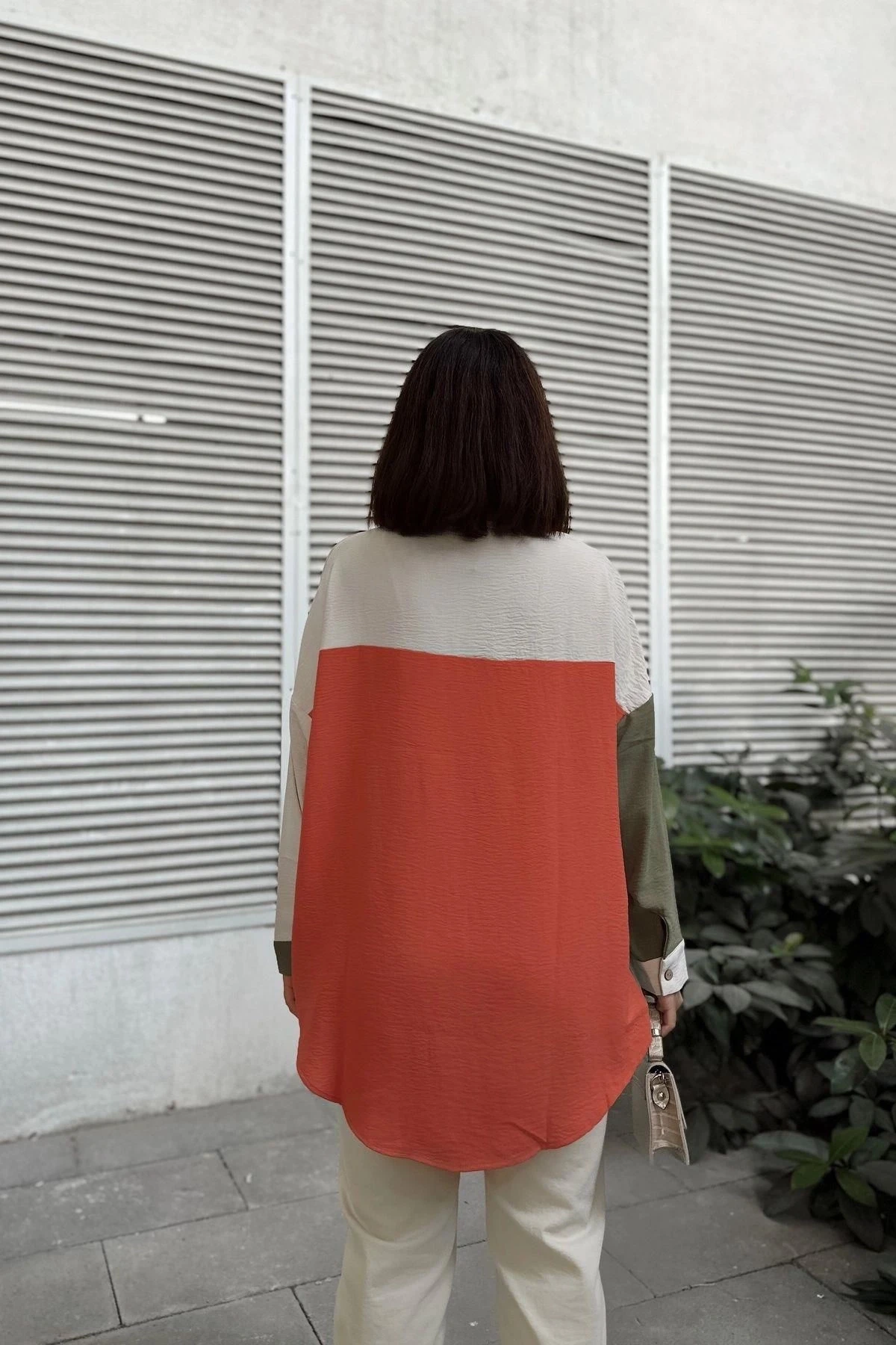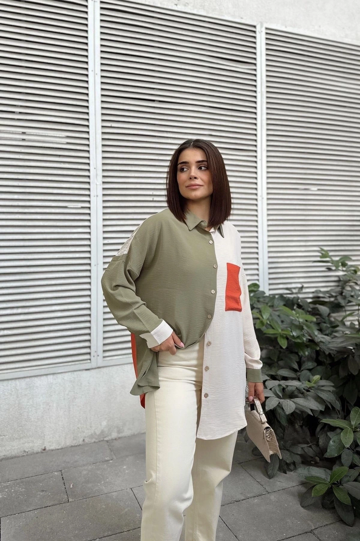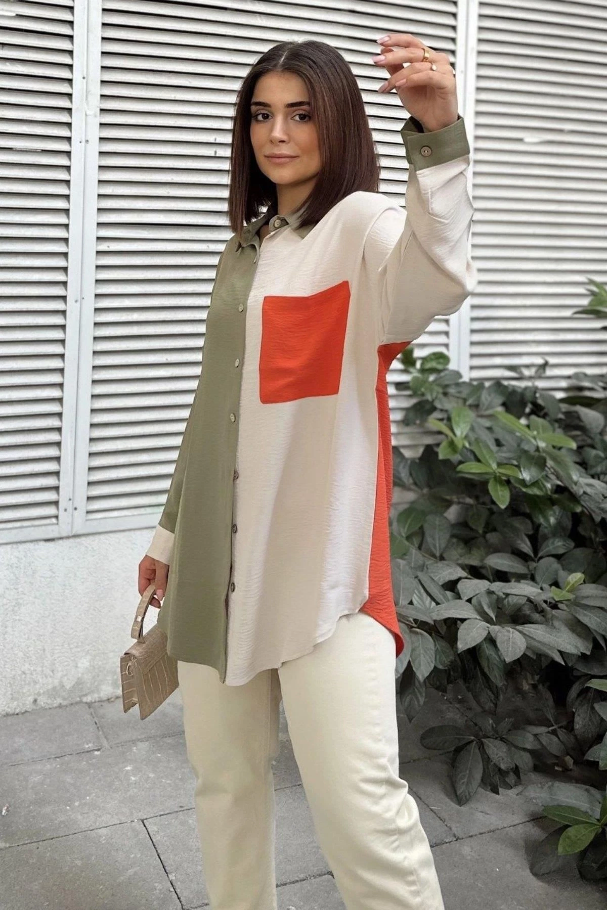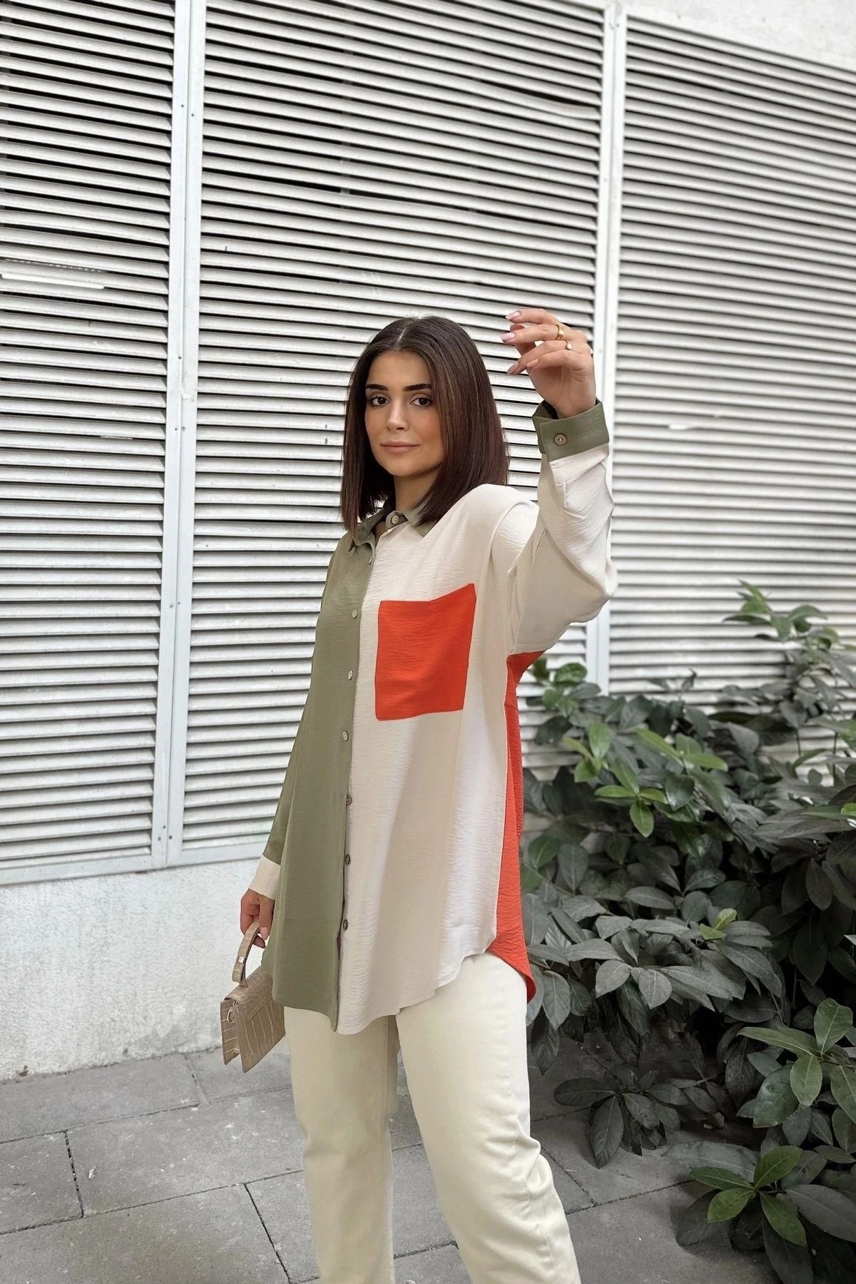 Kadın Haki & Oranj Uzun Kol Detaylı Renk Bloklu Oversize Gömlek Cepli Uzun Tunik Gömlek