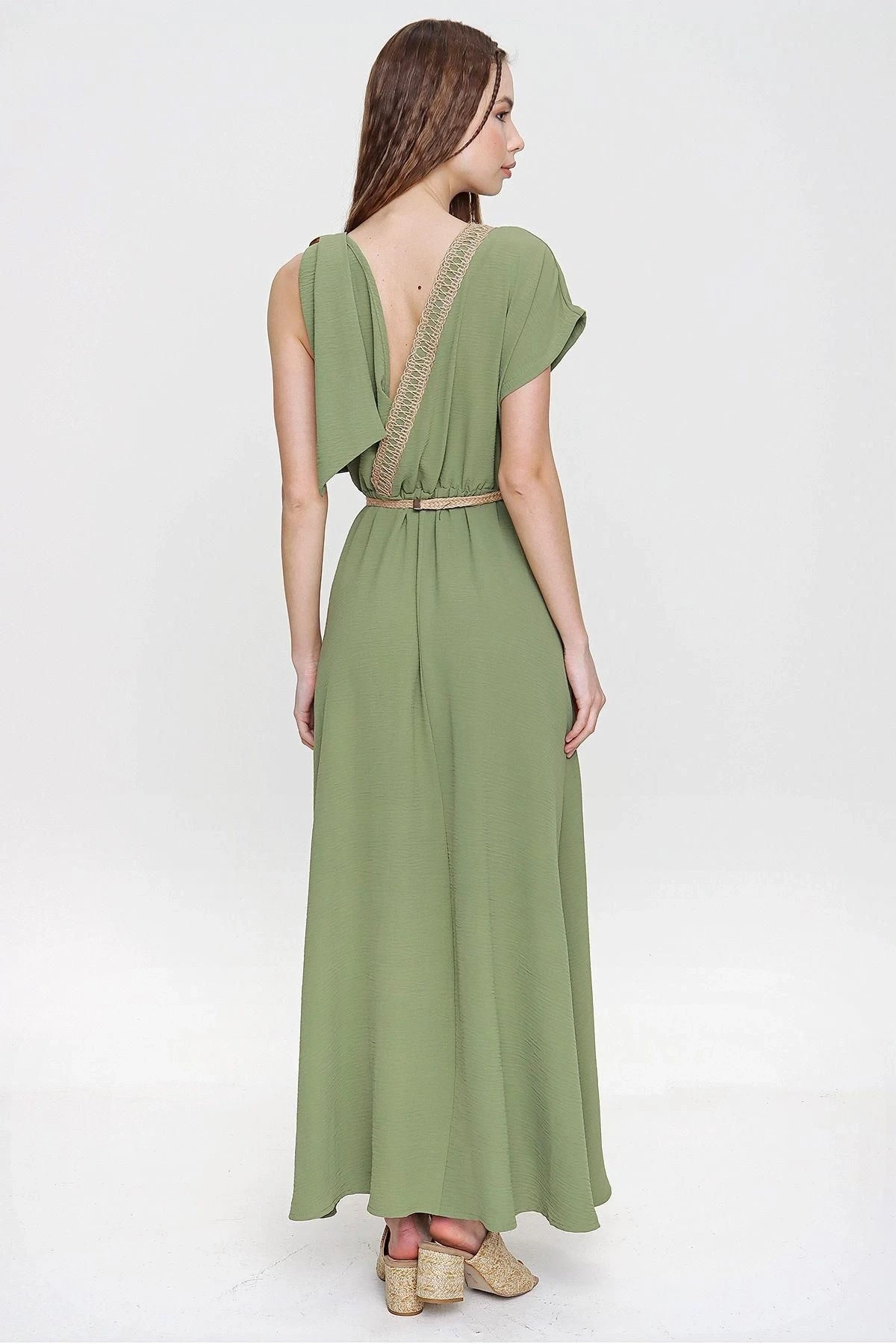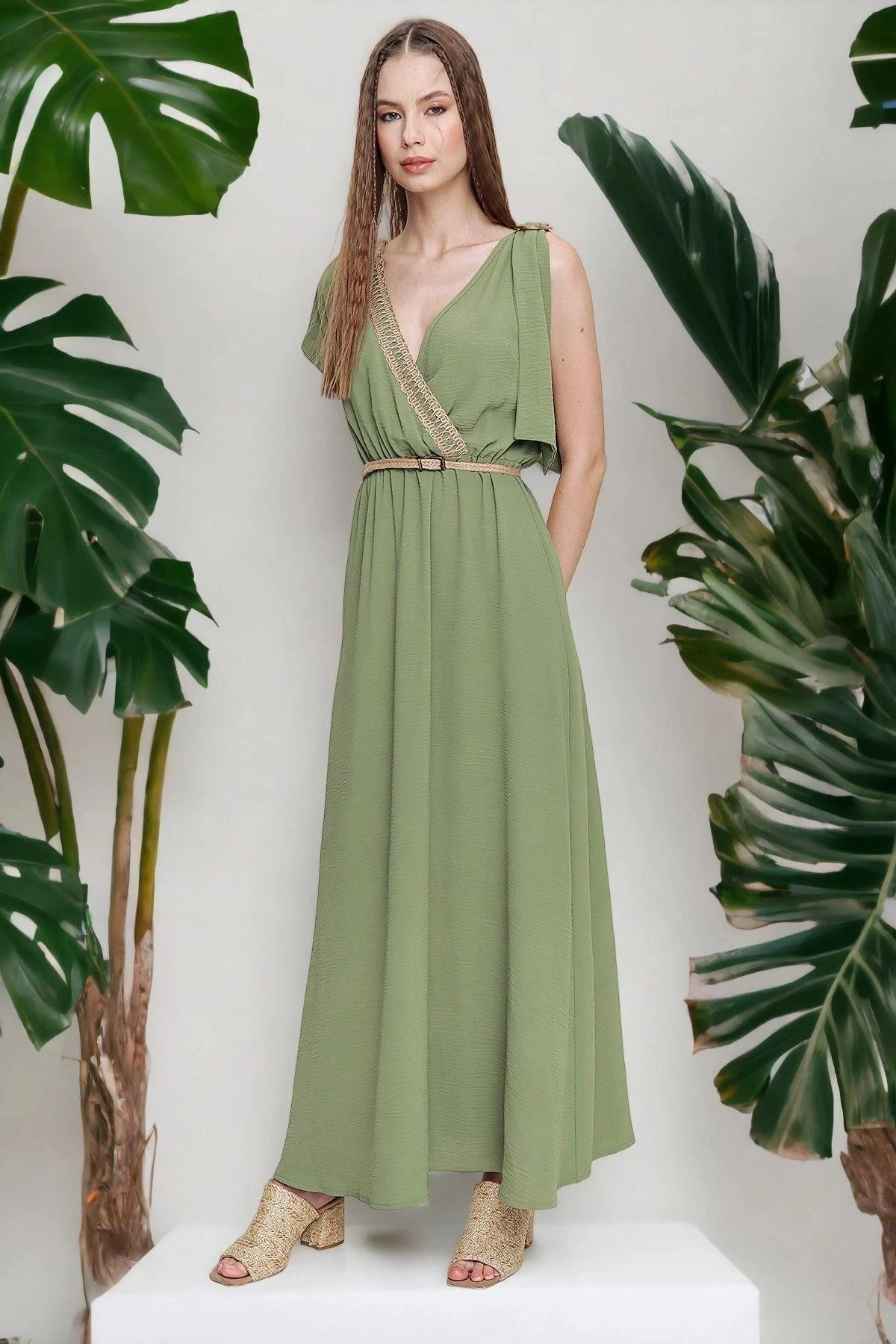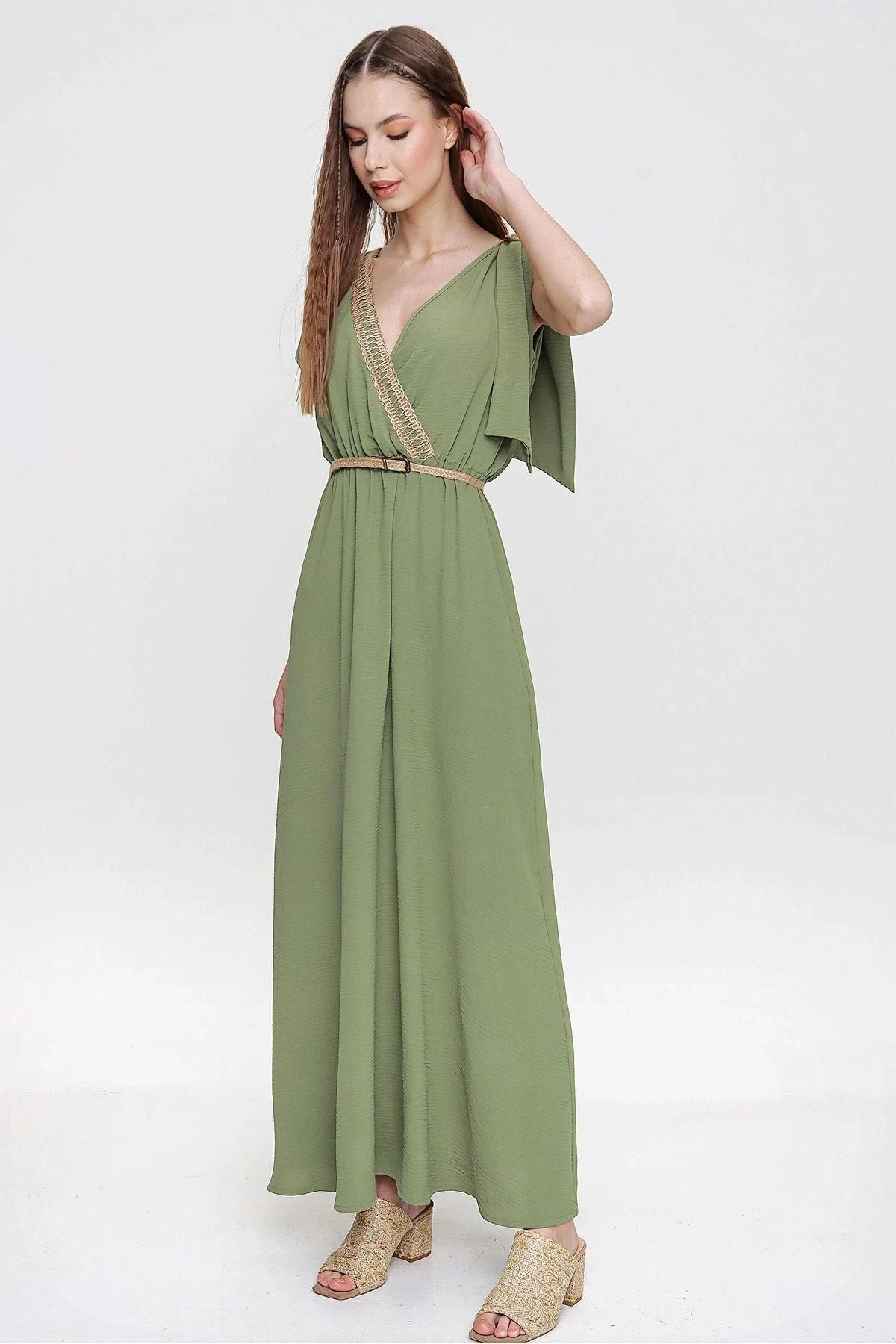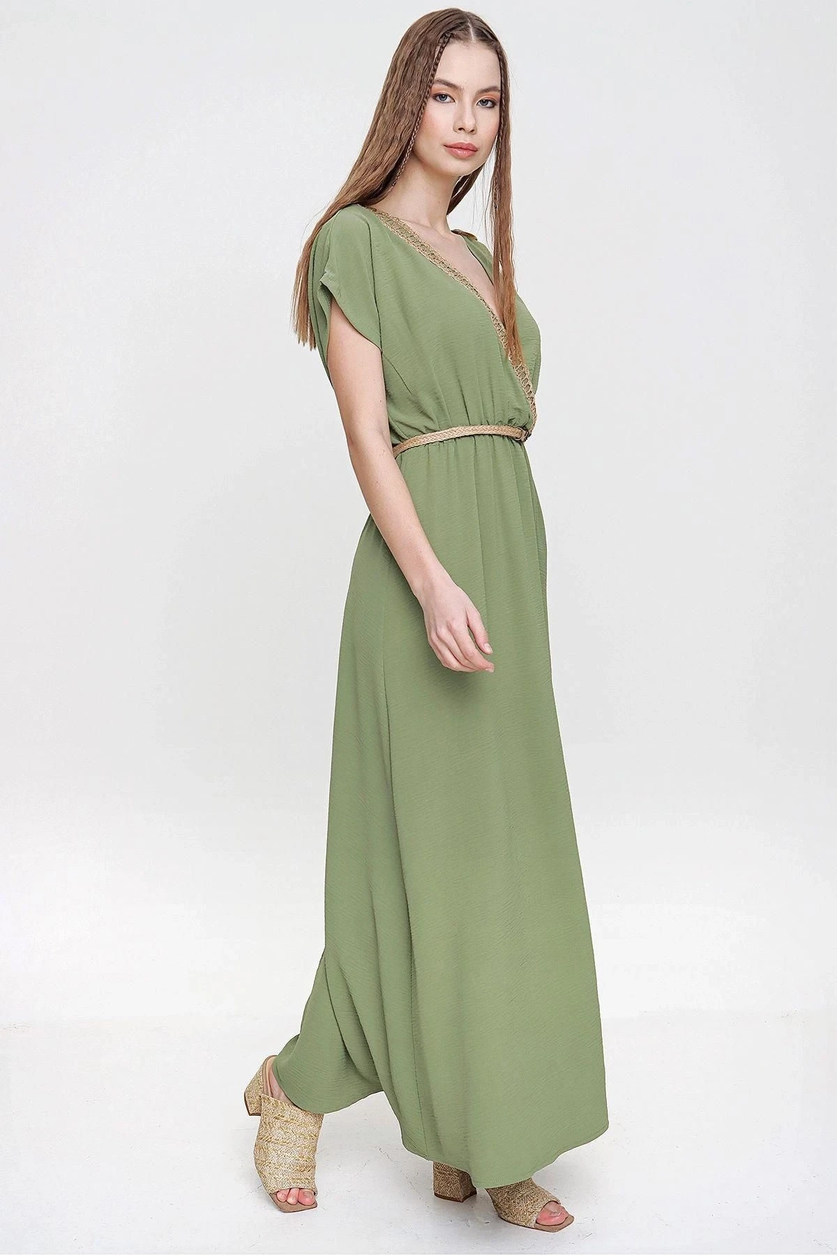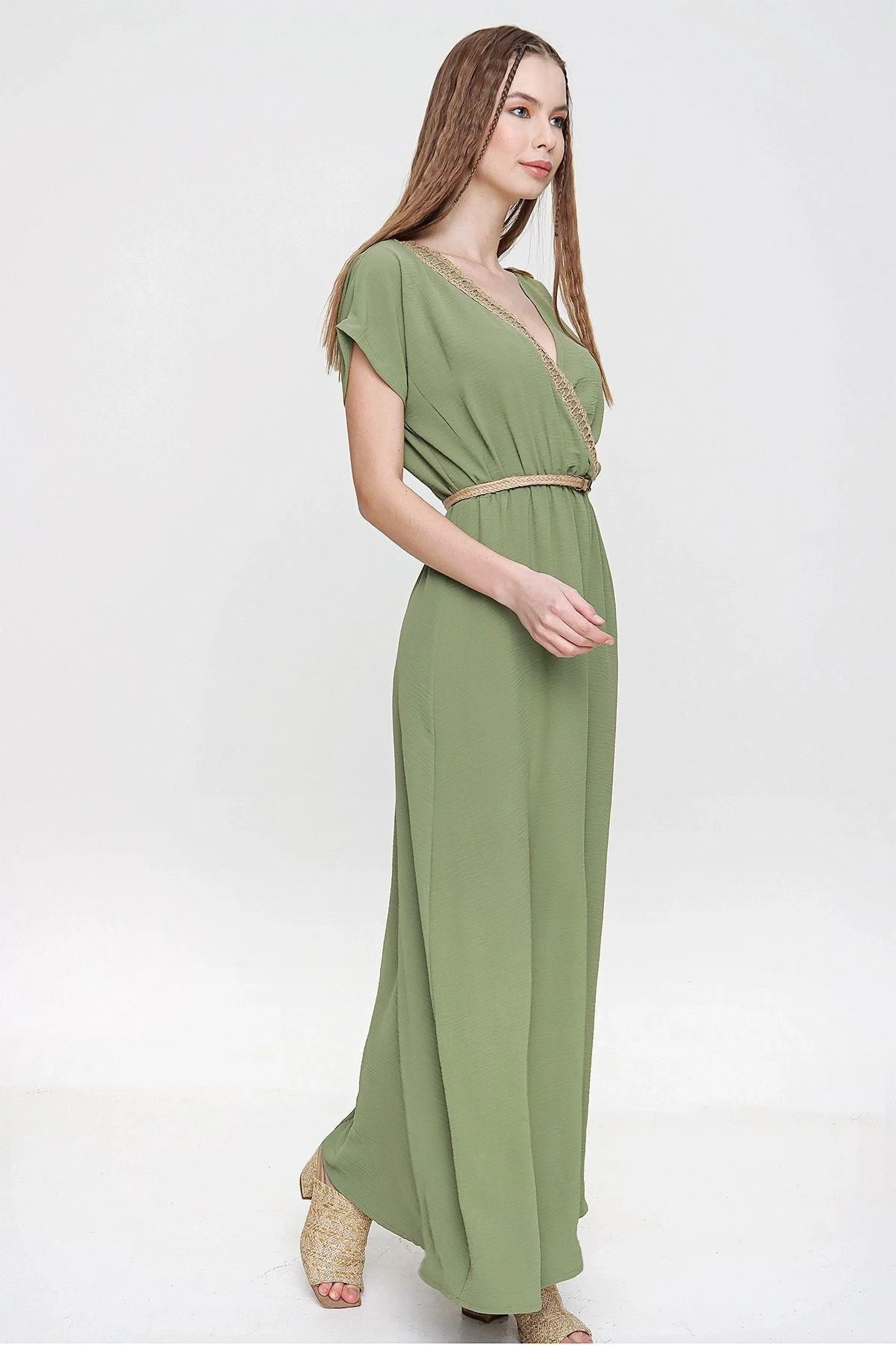 Bu şık ve rahat Airobin uzun elbise, her günlük stilinize zarif bir dokunuş katacak.; Elbisenin kumaşı %60 polyester ve %40 pamuk karışımıdır, böylece hem dayanıklı hem de nefes alabilen bir yapı sunar.; Bu özel kumaş kombinasyonu, elbisenin kalıcı bir şekilde şekil almasını sağlar ve aynı zamanda yumuşak bir dokunuş hissiyle cildinizi şımartır.; Elbisenin rengi haki olarak tasarlanmıştır, bu da ona sofistike ve zarif bir görünüm kazandırır.; Hasır detaylar, omuzlarda ve göğüs dekoltesinde özel bir dokunuş sunar.; Bu detaylar, elbisenin tasarımına benzersizlik katar ve sizi diğerlerinden farklı kılar.; Kruvaze kesim, elbisenin vücuda uyumlu olmasını sağlar ve siluetinizi güzelce vurgular.; Beli büzgülü detaylar, ince bir şekilde belinizi saran ve zarif bir şekilde vurgulayan bir etki yaratır.; Bu, elbisenin size mükemmel bir şekilde oturmasını sağlar ve şık bir görünüm sunar.; Sırt ve göğüs hasır dekolteli tasarım, feminen bir dokunuş sunar ve çarpıcı bir görüntü oluşturur.; Kısa kollu ve salaş kesim, rahat bir tarz sunar ve hareket özgürlüğünüzü kısıtlamadan gün boyu konfor sağlar.; Bu maxi boy elbise, ayak bileklerinize kadar uzanır ve sizi zarif bir şekilde sarmalar.; Uzun ve rahat yapısıyla, günlük aktivitelerinizde rahatlıkla kullanabilirsiniz.; Hem şık hem de günlük tarzınızı tamamlayacak bu elbise, gardırobunuzun vazgeçilmez bir parçası olacak.; Airobin uzun elbise, kumaş kalitesi, benzersiz tasarımı ve konforlu kesimiyle öne çıkan bir parçadır.; Herhangi bir mevsimde ve herhangi bir etkinlikte şıklığınızı artıracak ve sizin için vazgeçilmez bir tercih olacak.