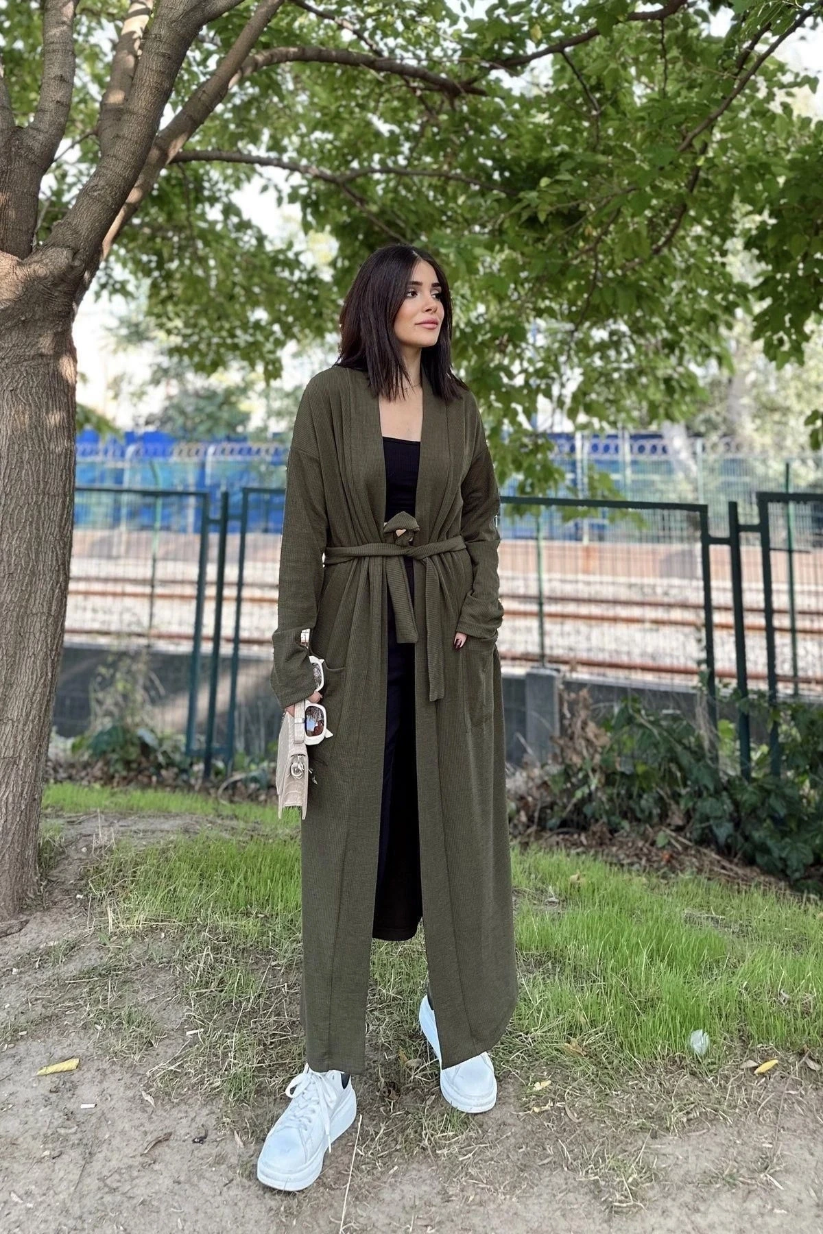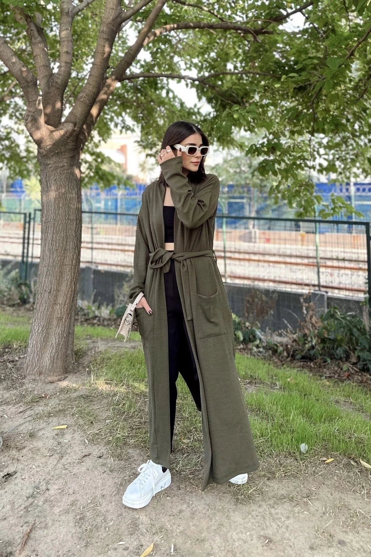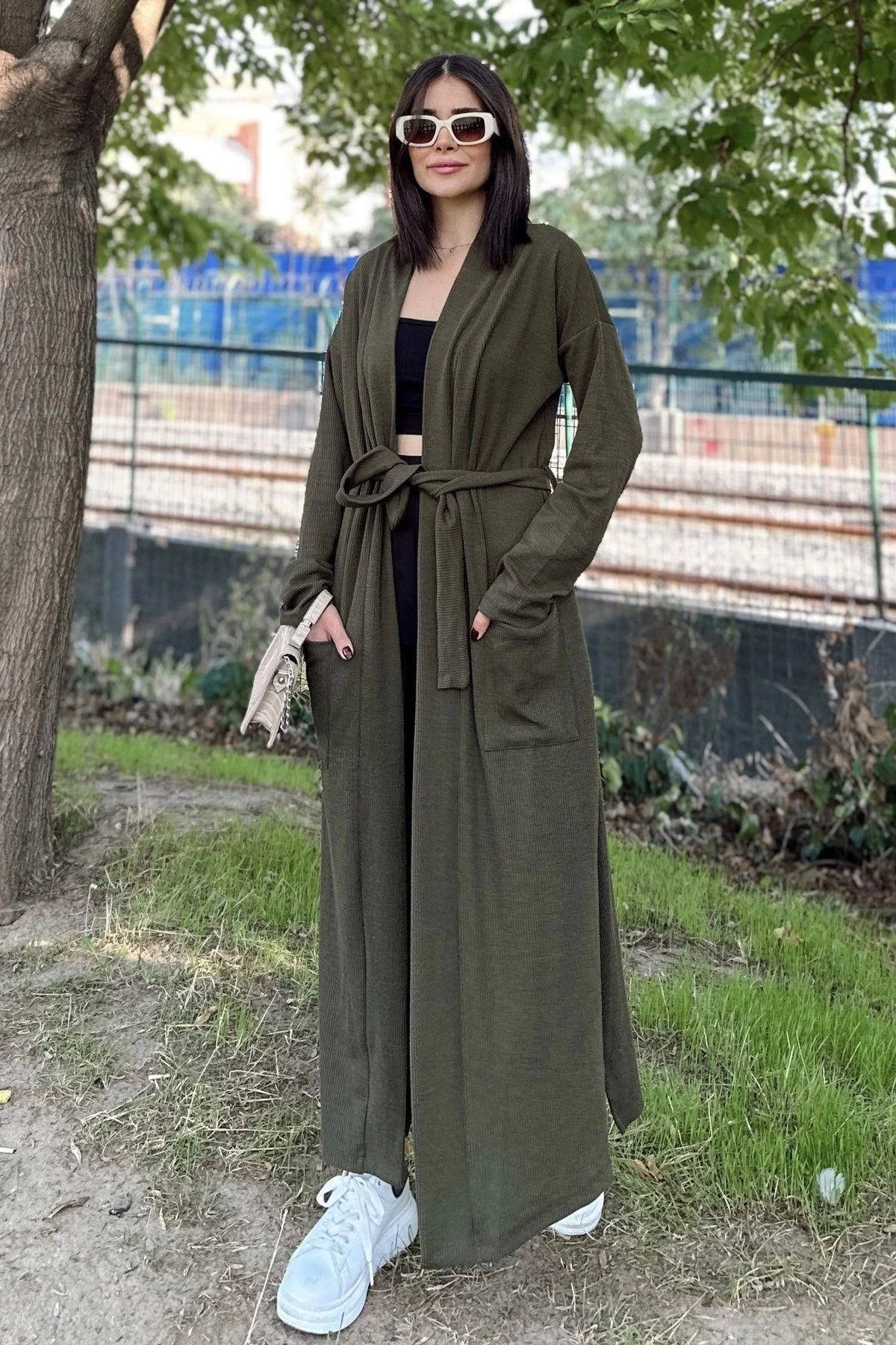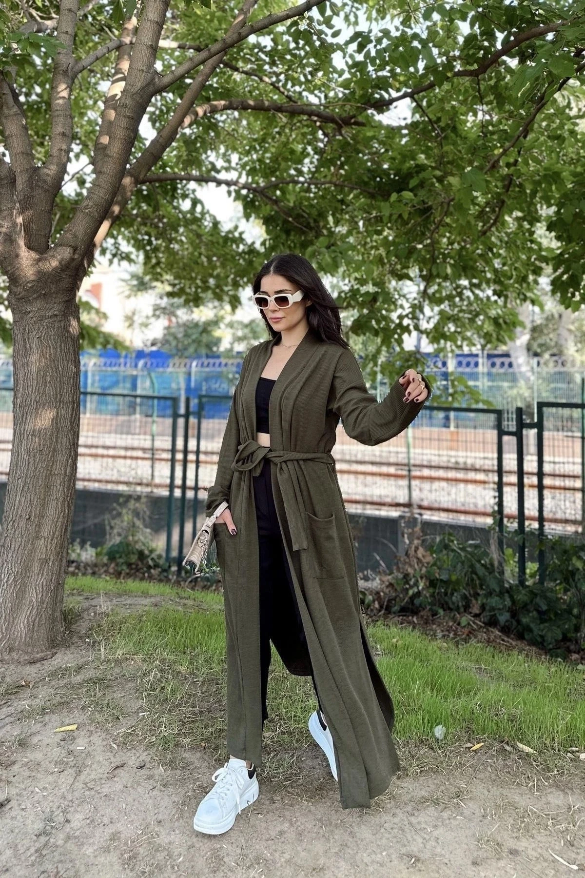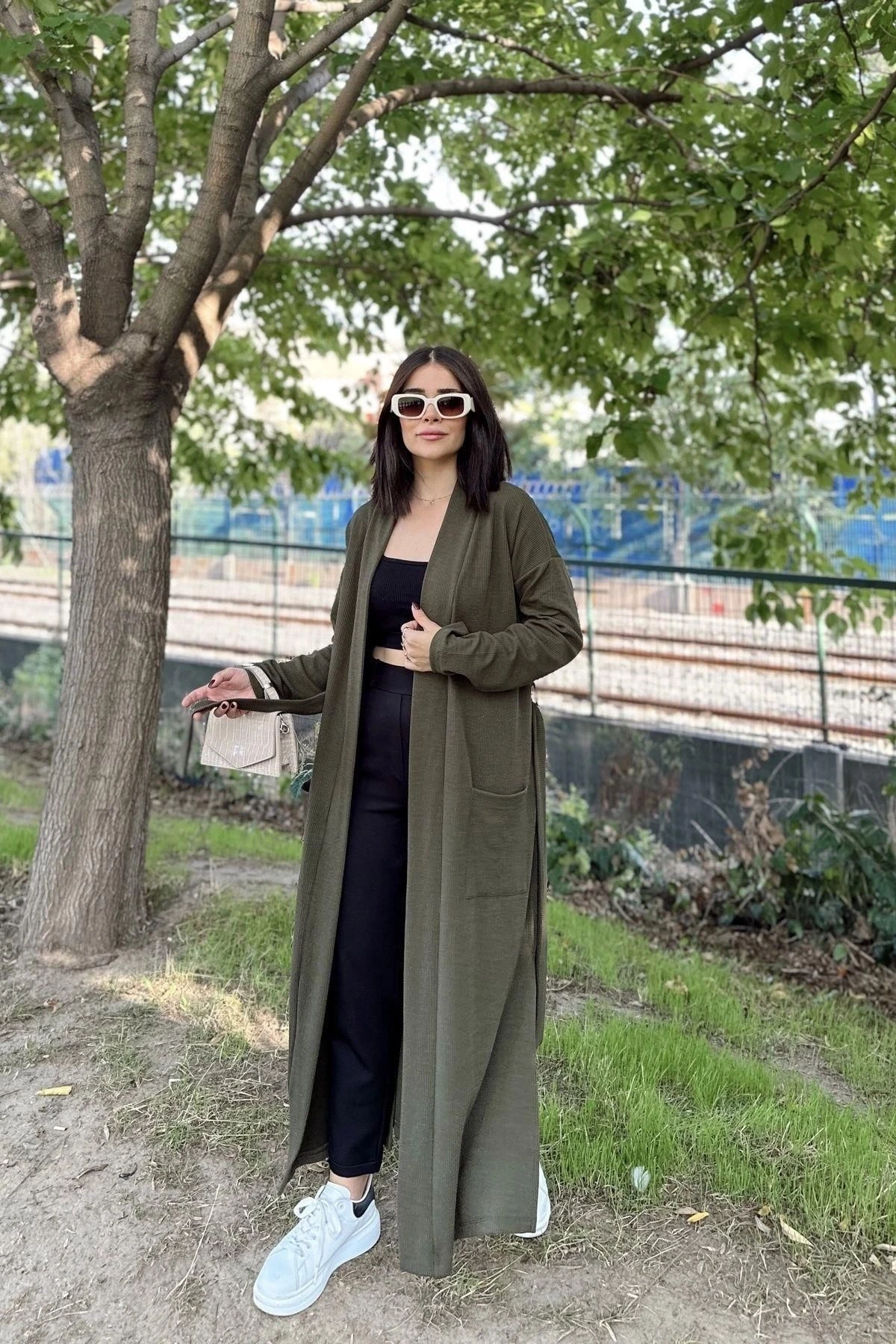 Kadın Haki Uzun Kol, Beli Kemerli, Düğmesiz, Çift Cepli, Uzun Örme Hırka