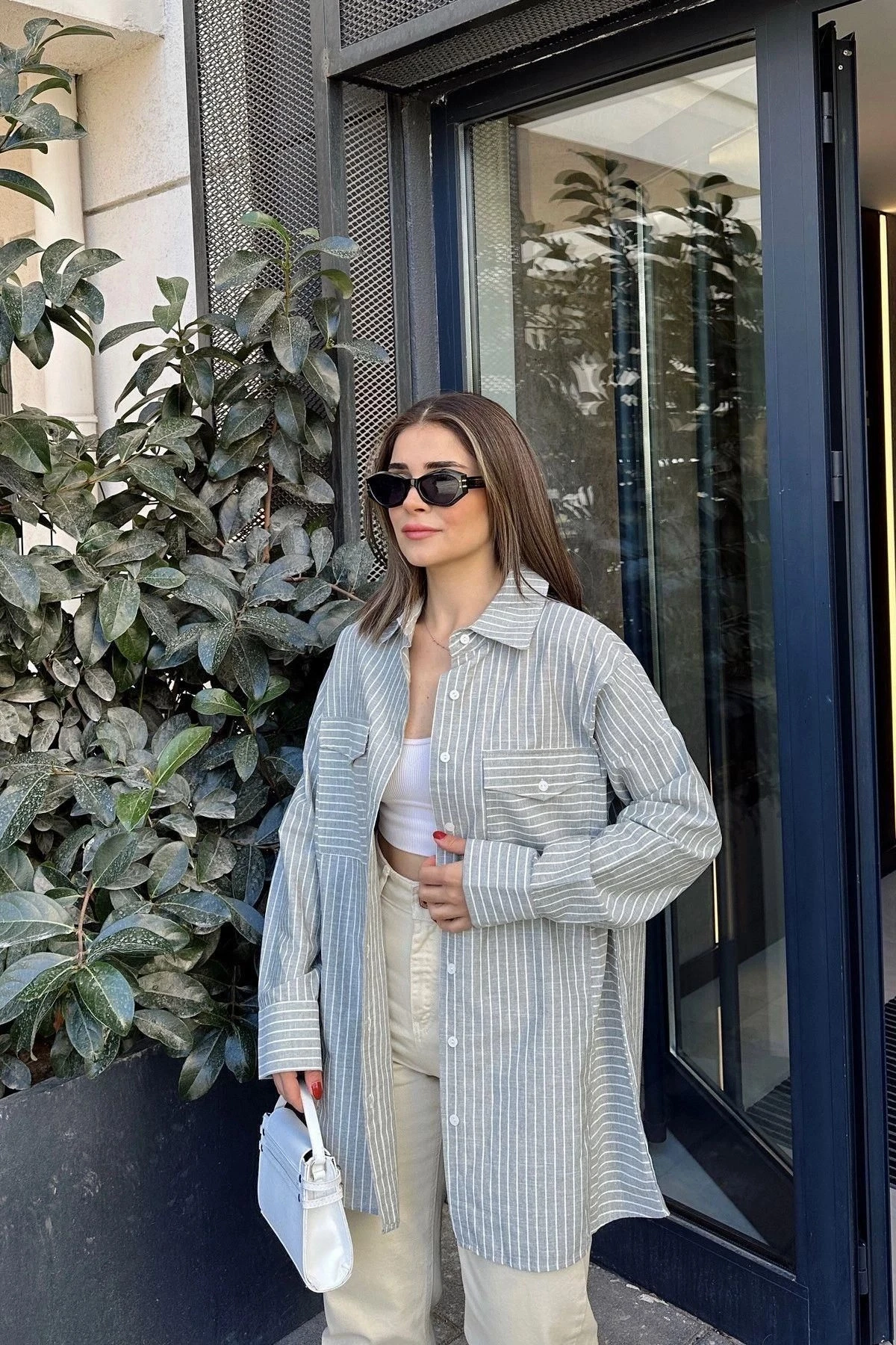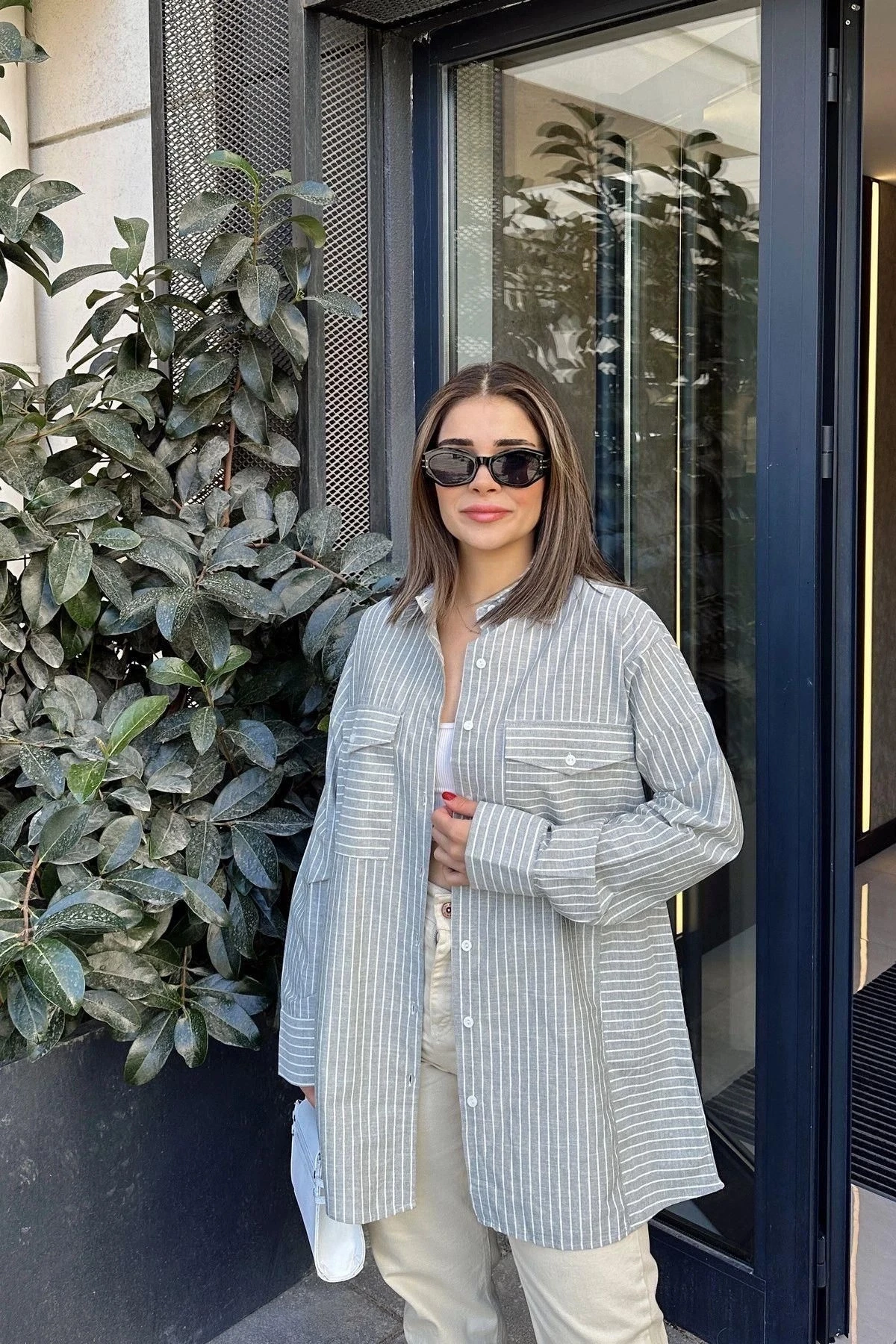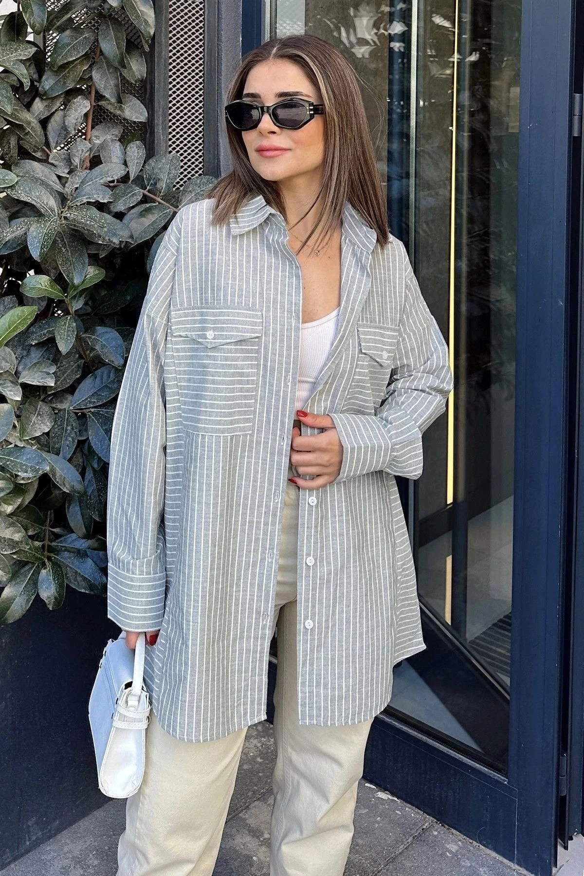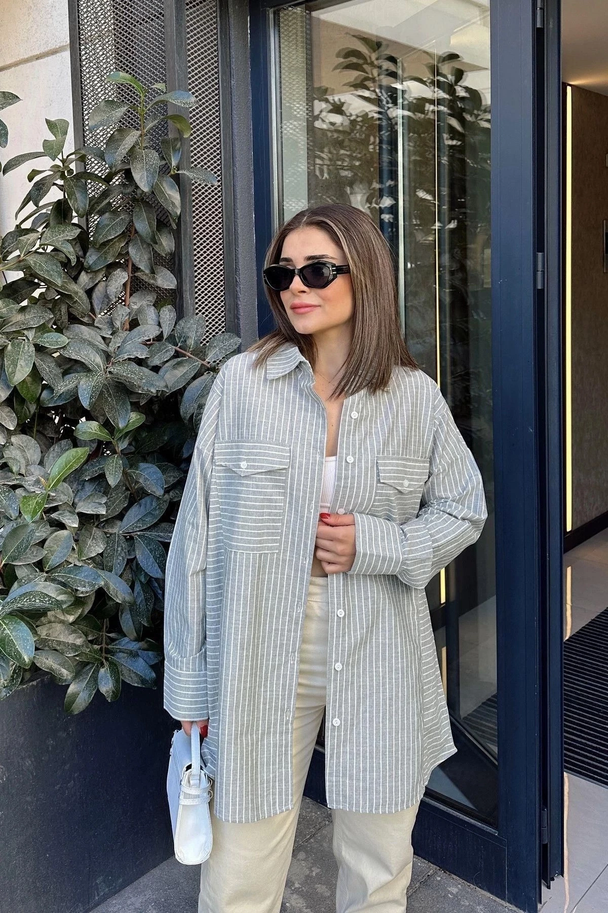 Kadın Haki Uzun Kol, Çift Kapaklı Cep, Uzun Oversize Tunik Gömlek