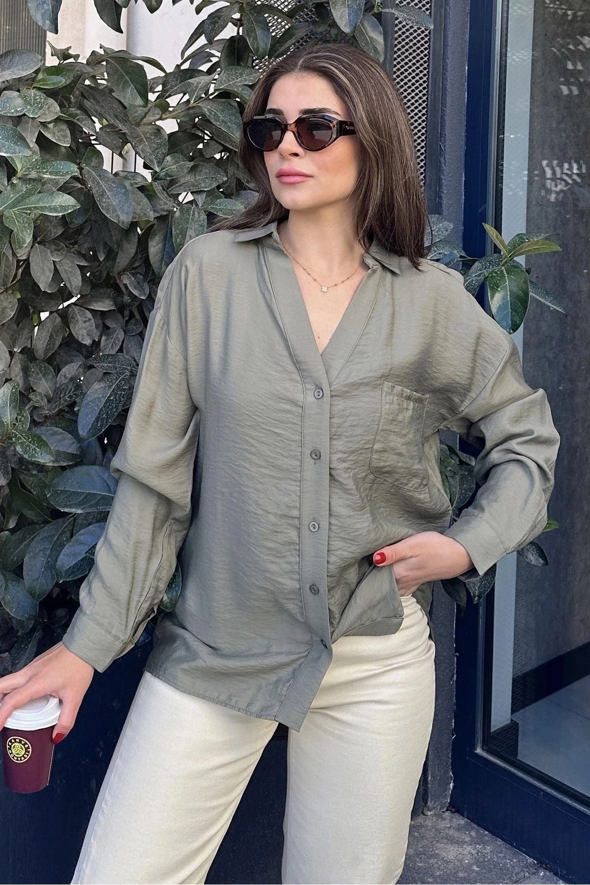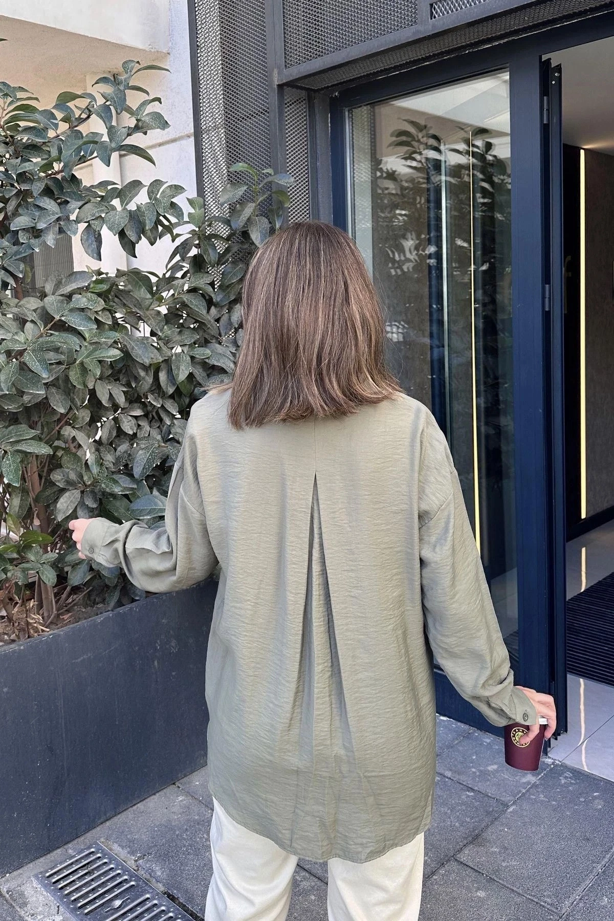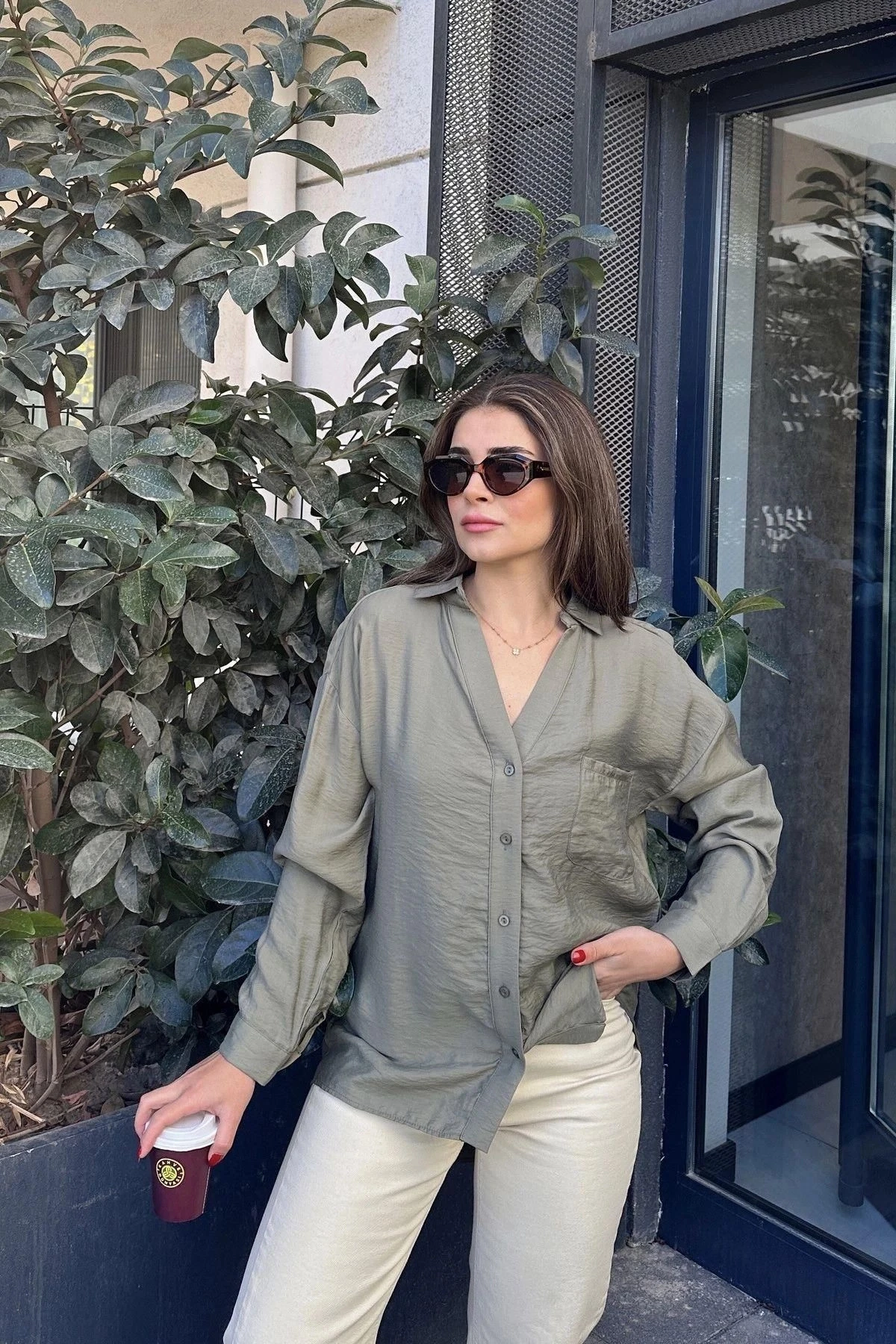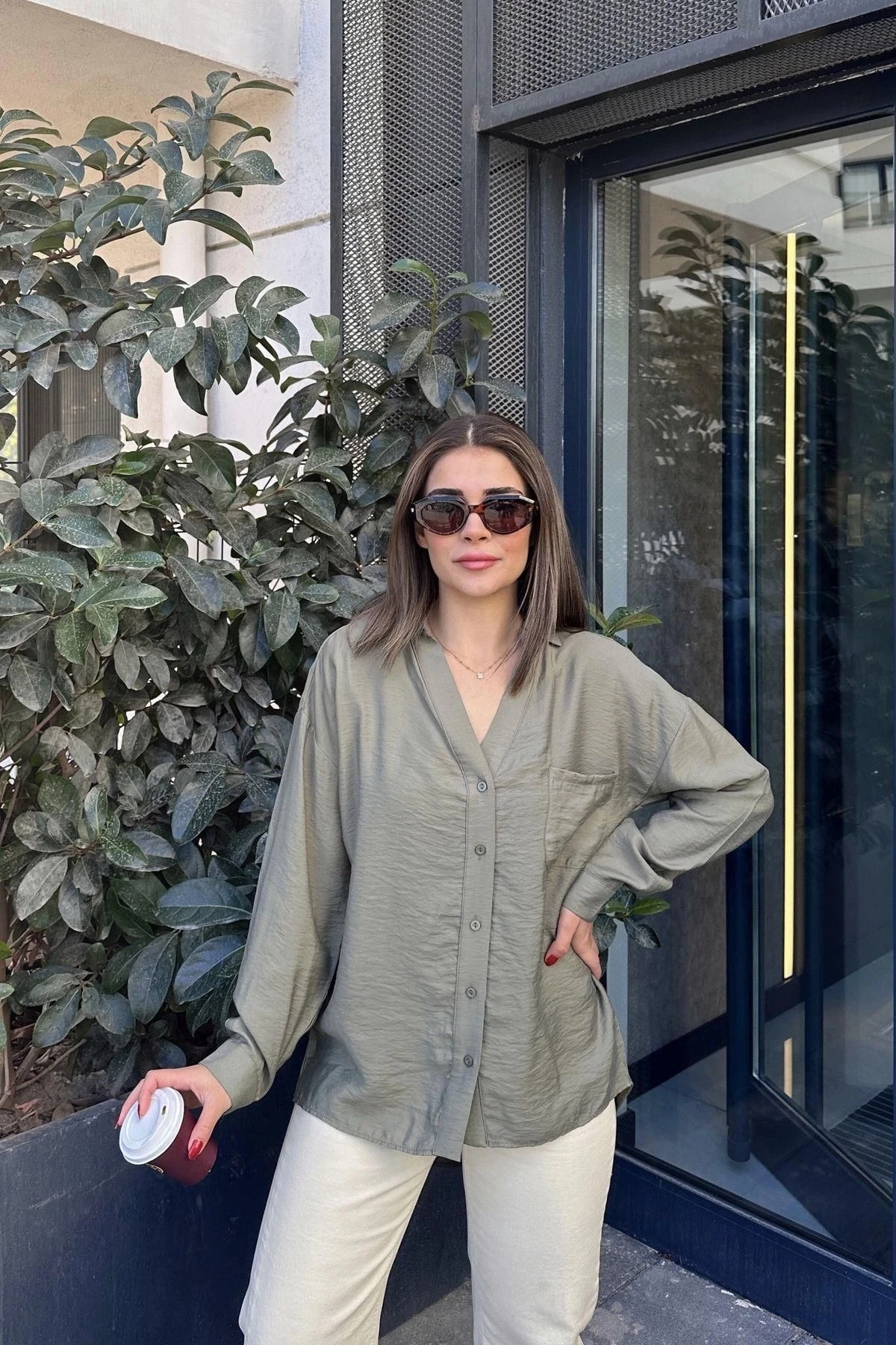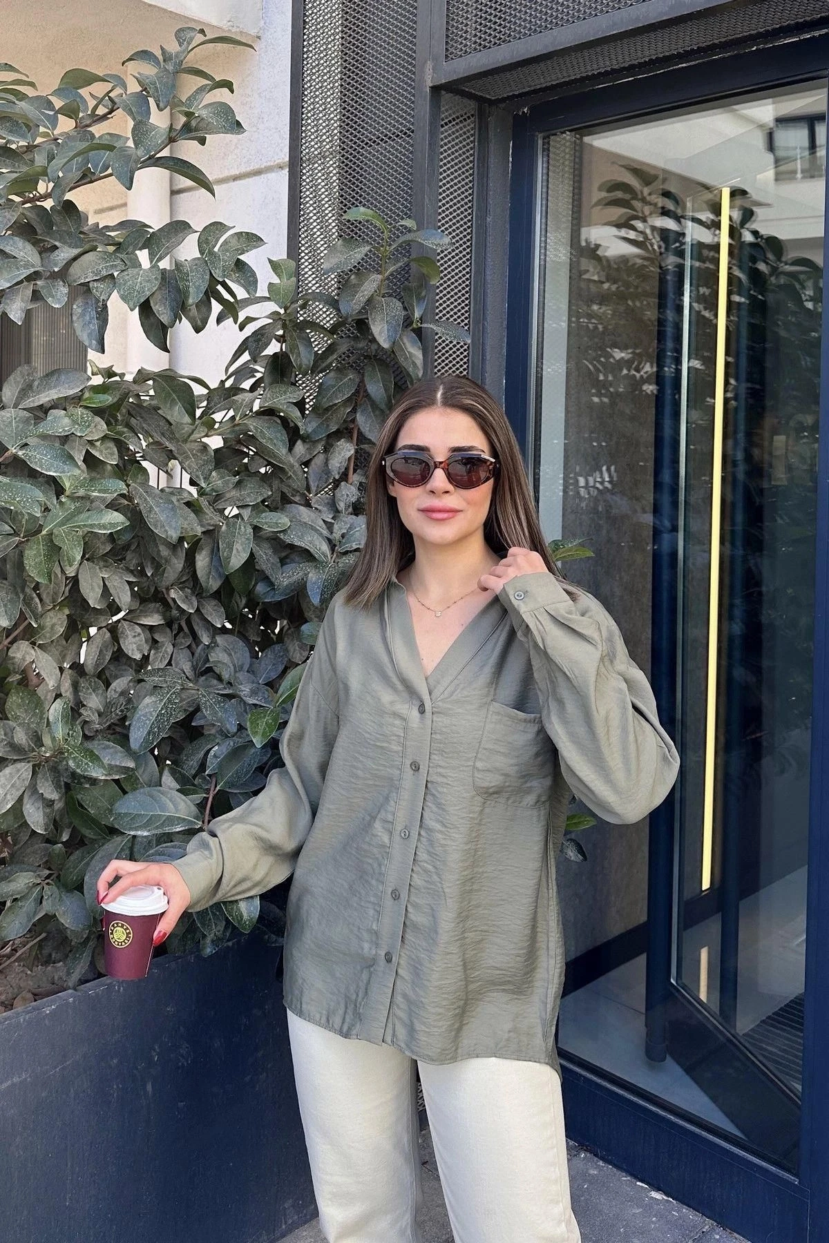 Kadın Haki V Yaka, Uzun Kol, Airobin Kumaş, Arkası Pliseli, Salaş Gömlek